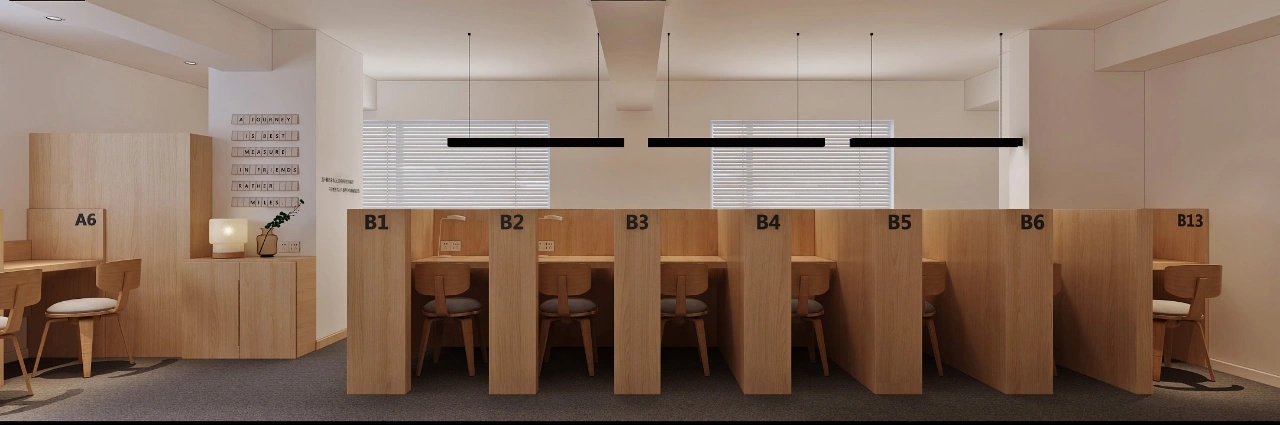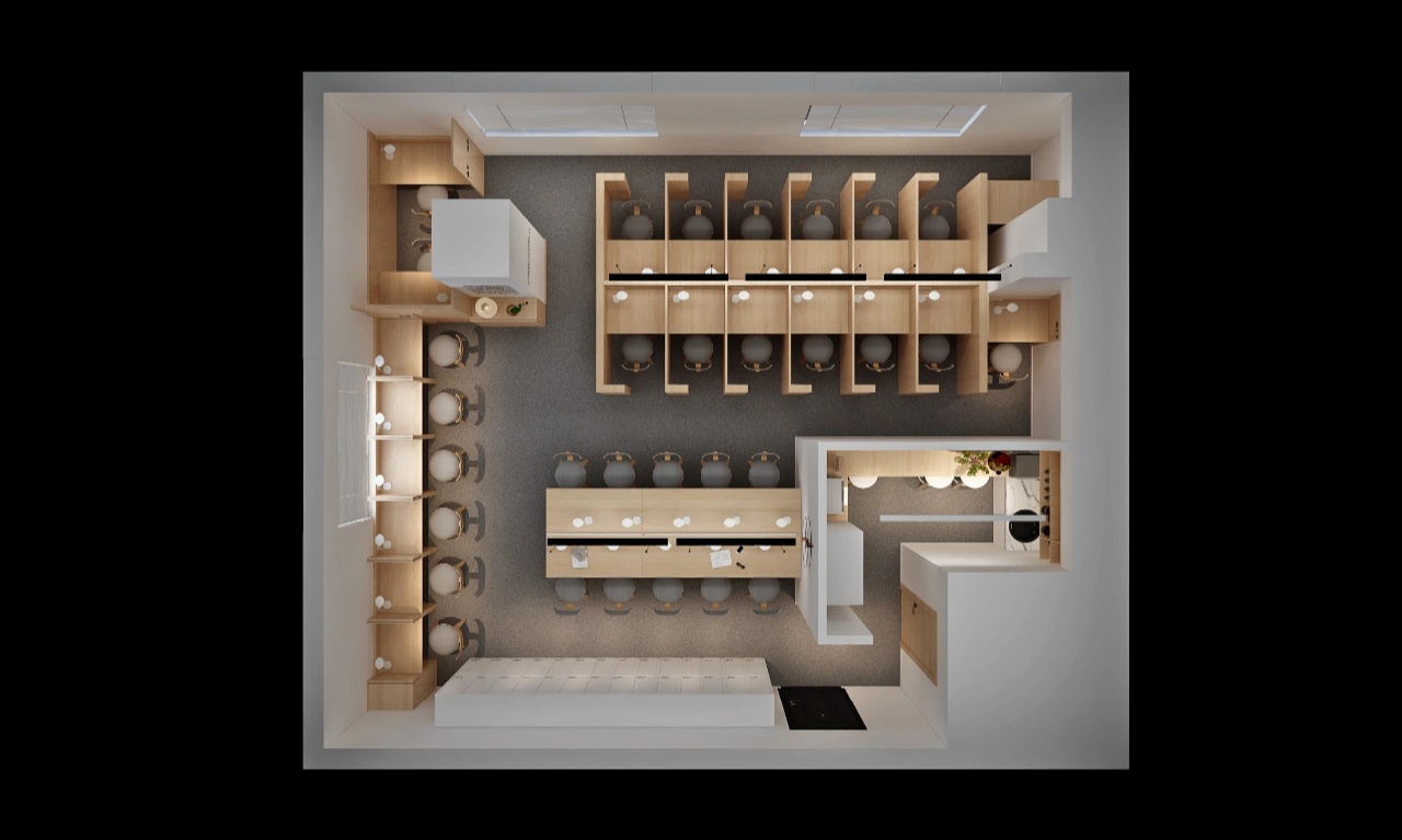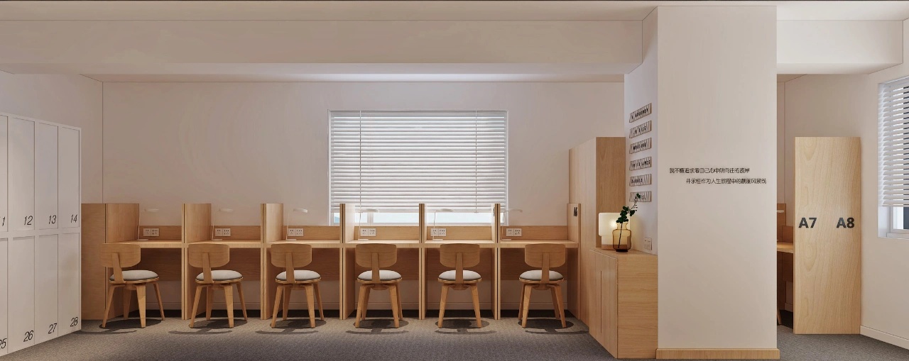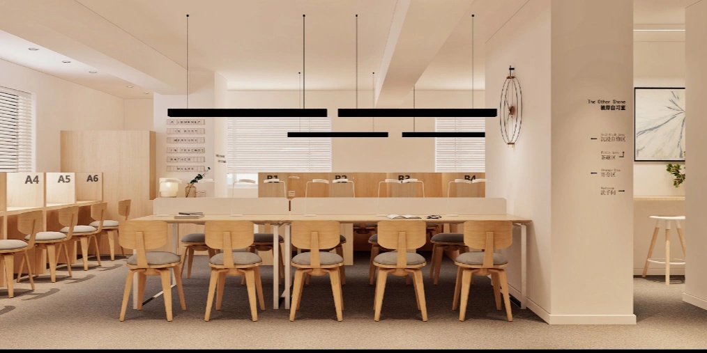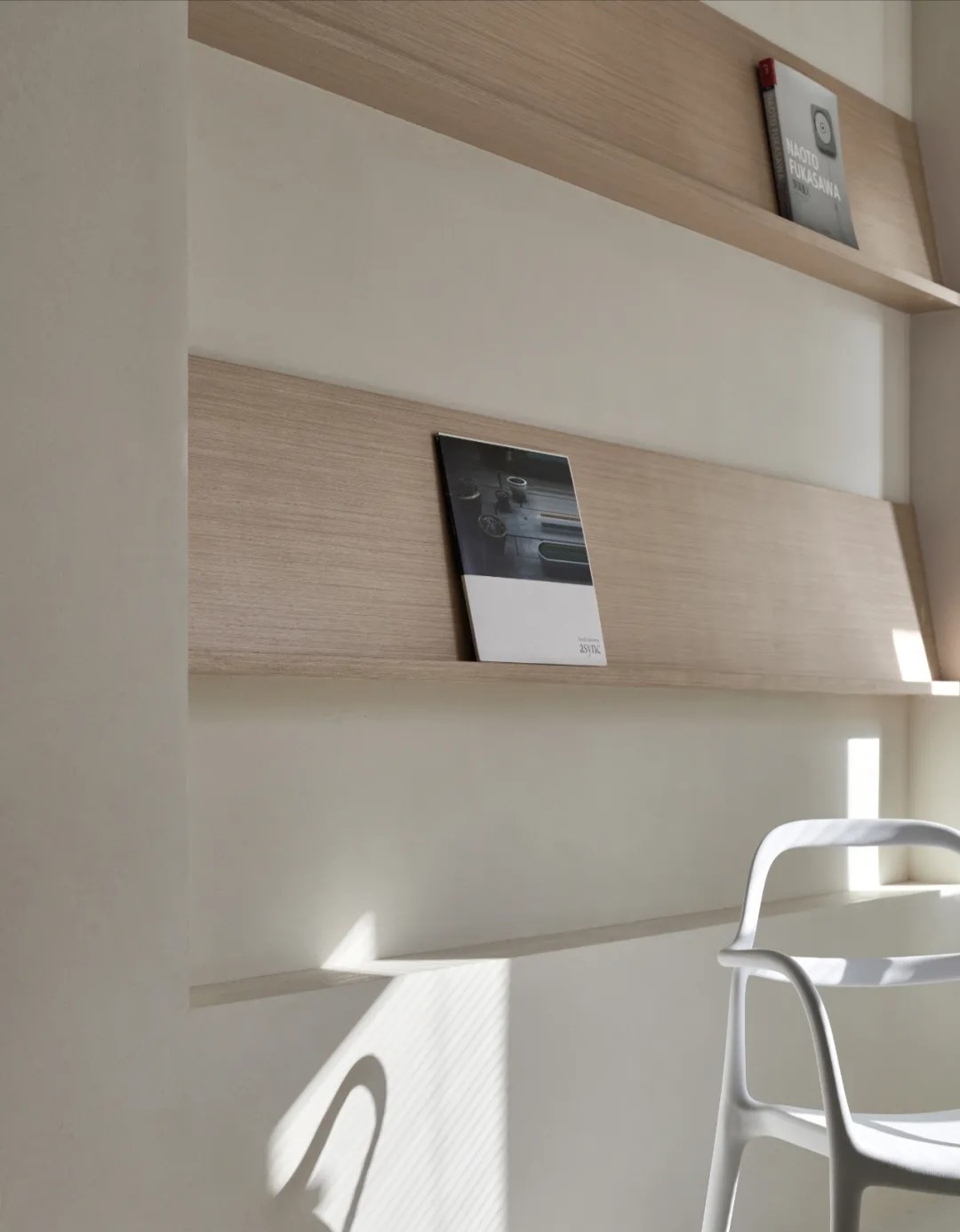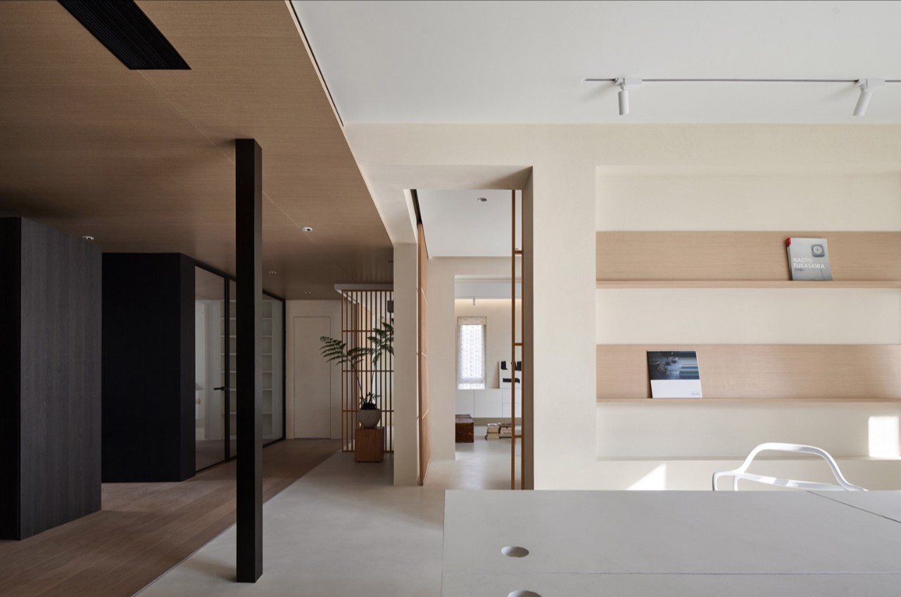 用木质和艺术涂料构建了一个独立的单色空间,希望完全区分开功能分区。而被服务区可以营造一种温暖,轻松,有序的氛围空间。