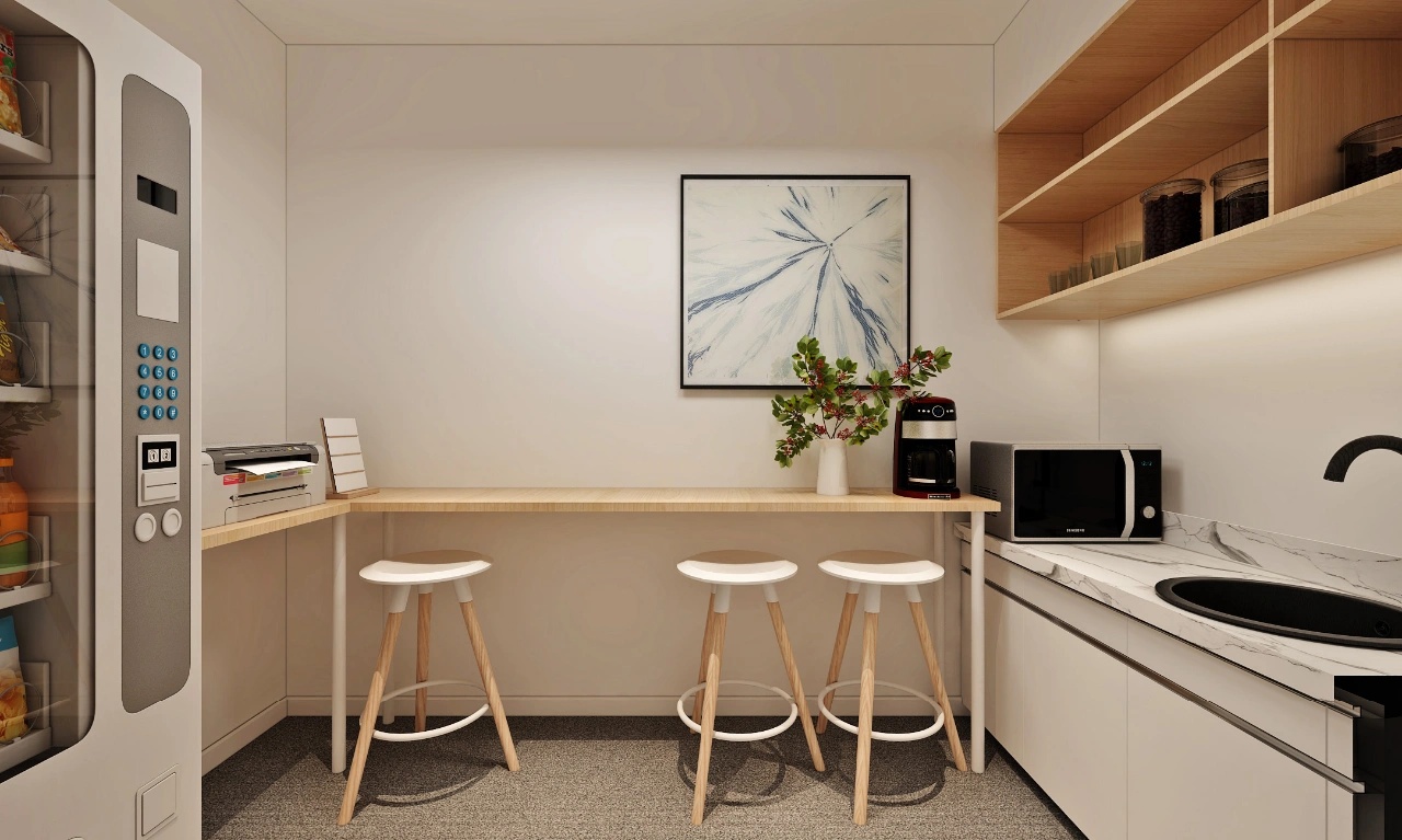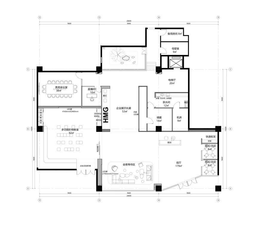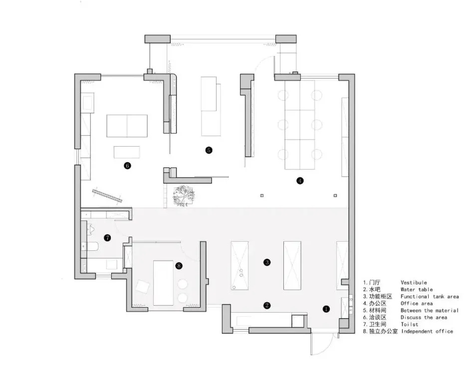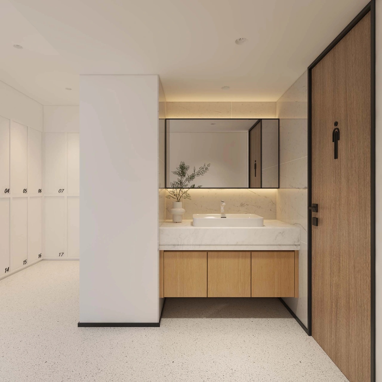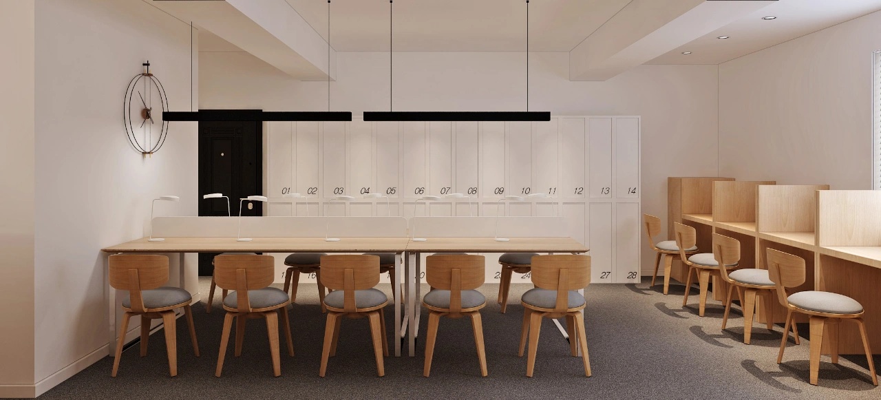 前台右侧位是两间采光良好的洽谈室,洽谈室内侧则隐藏着一间实用的收发室。设计的智慧在于物尽其用每一寸空间,感受上却又毫无局促之感,只觉是自然流淌,一切尽在情理之中。