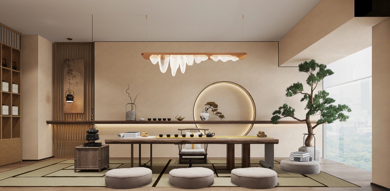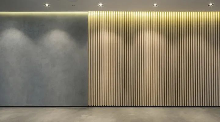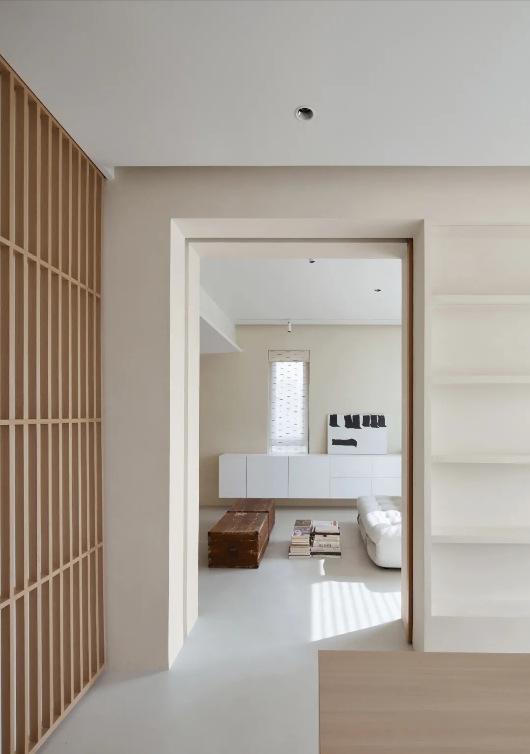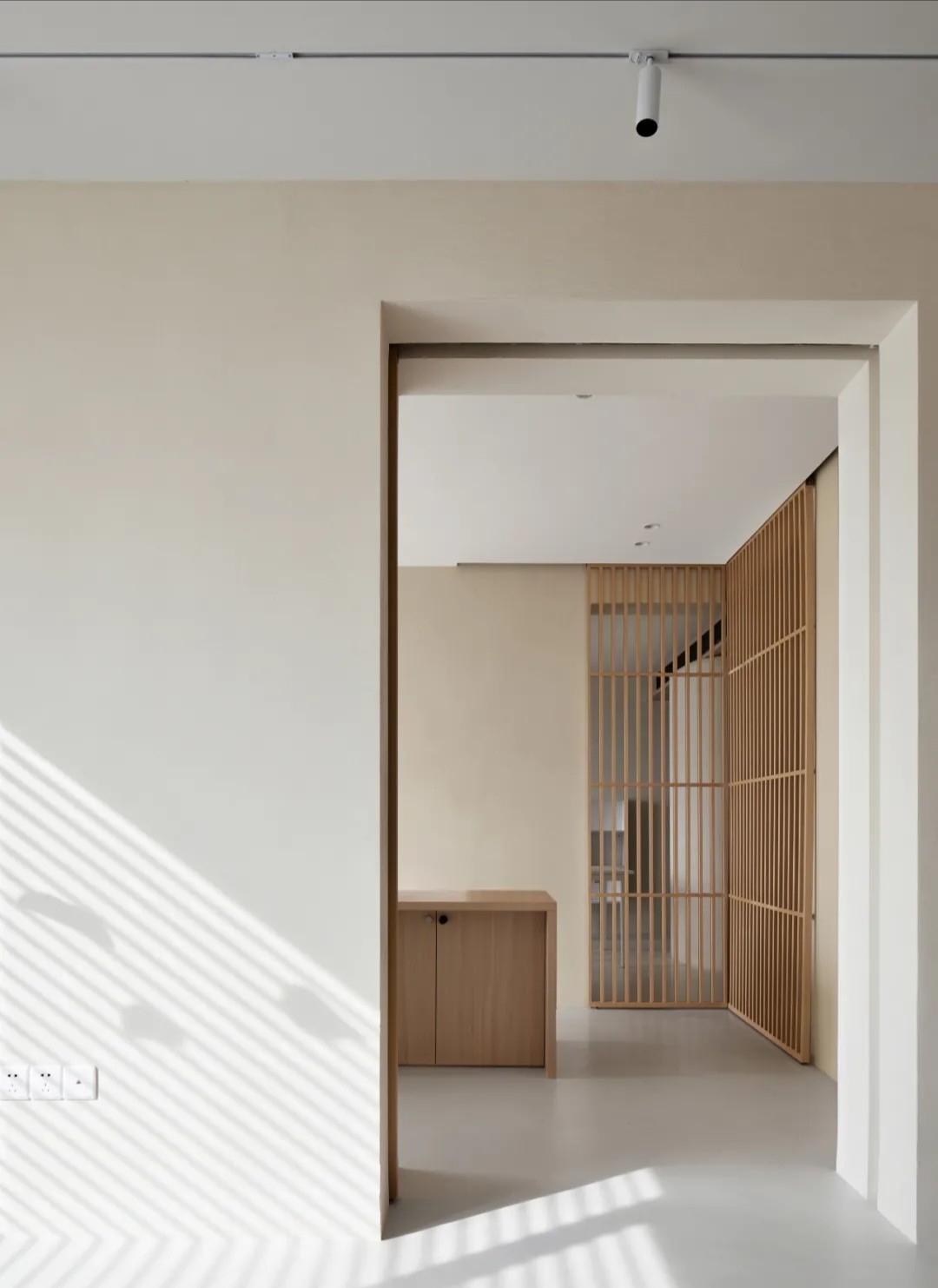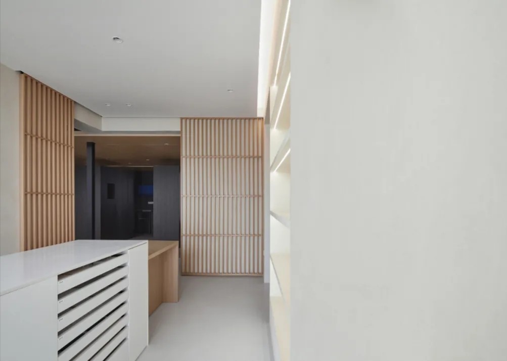 木格栅的设计营造了一种虚实之间的关系,就像“无”材料般存在,让空间变得轻盈。尤其加上室内光线,投射在木格栅反射出的光源,都让空间产生了一种暧昧的变化。