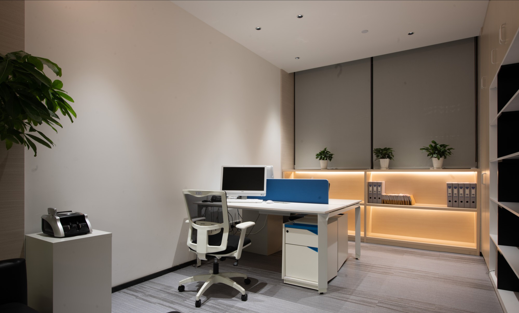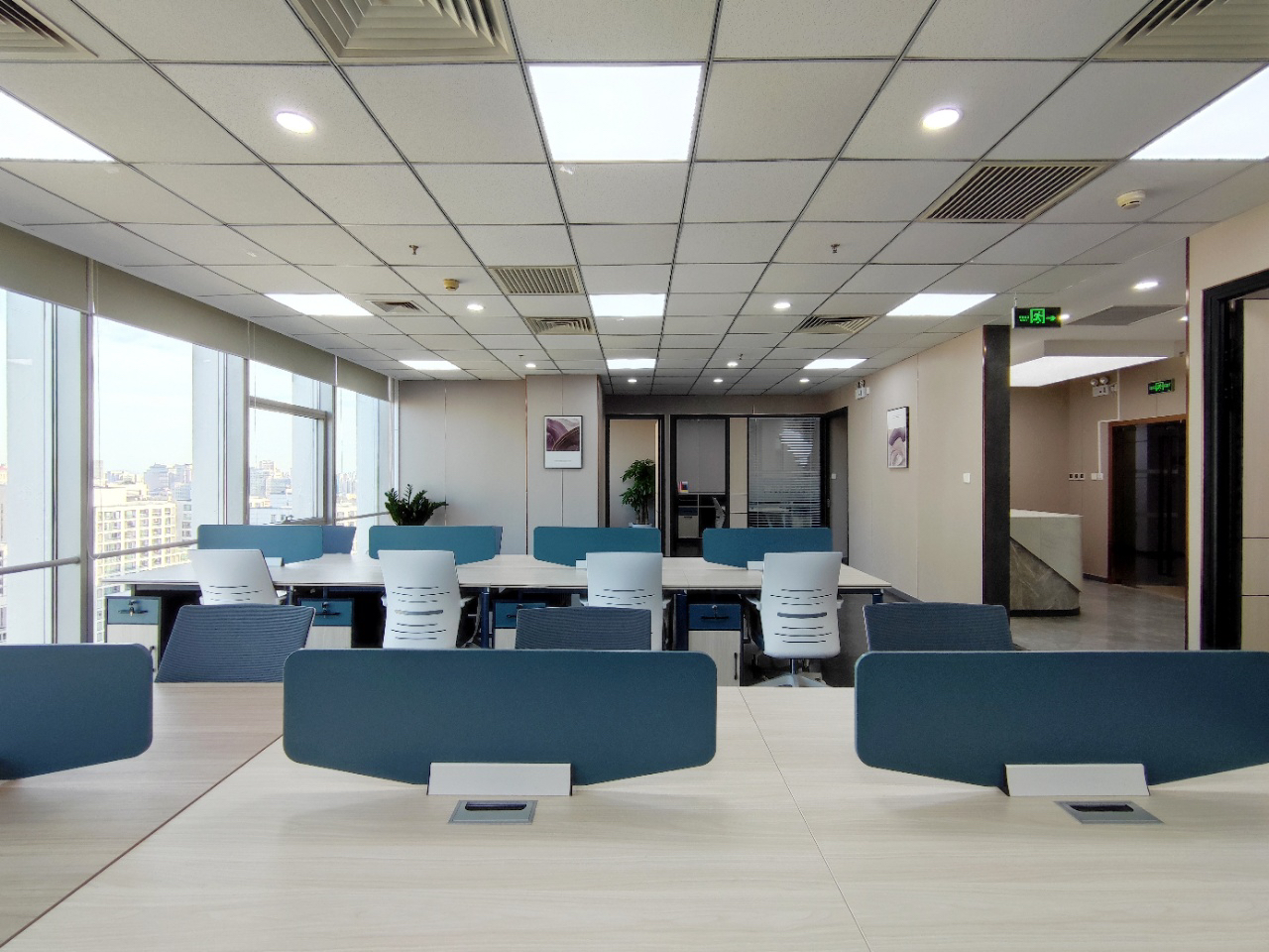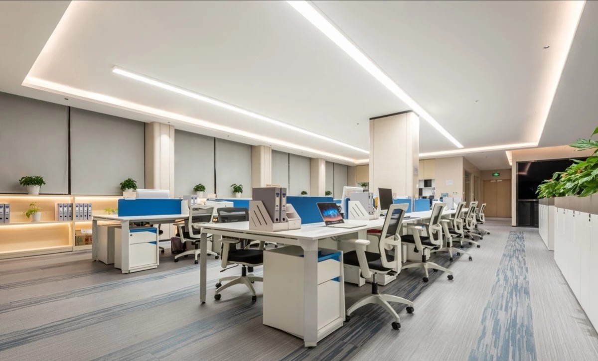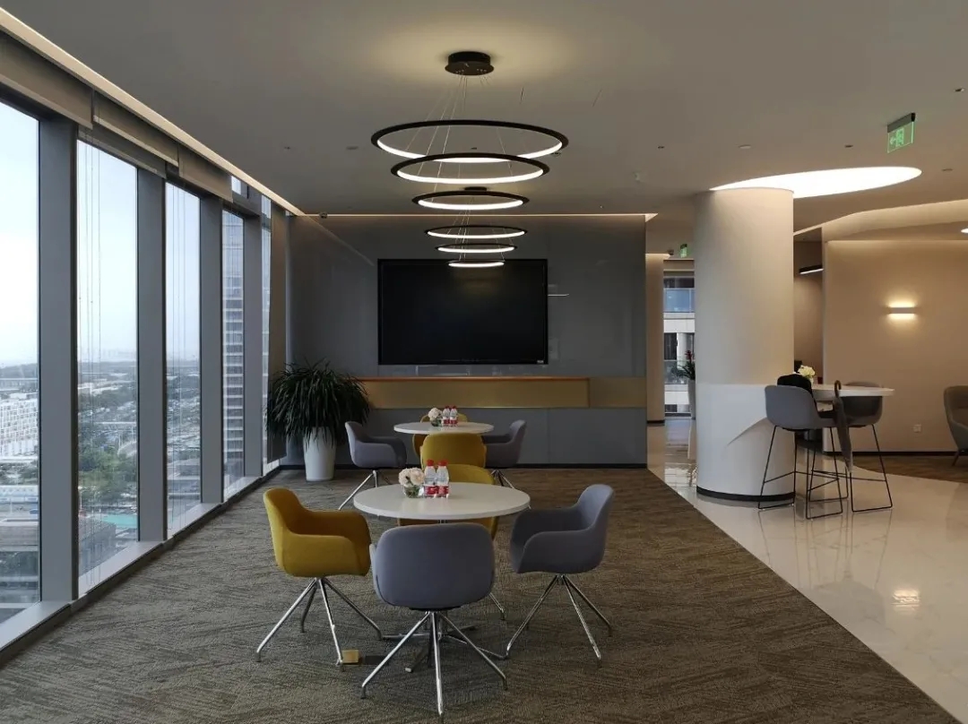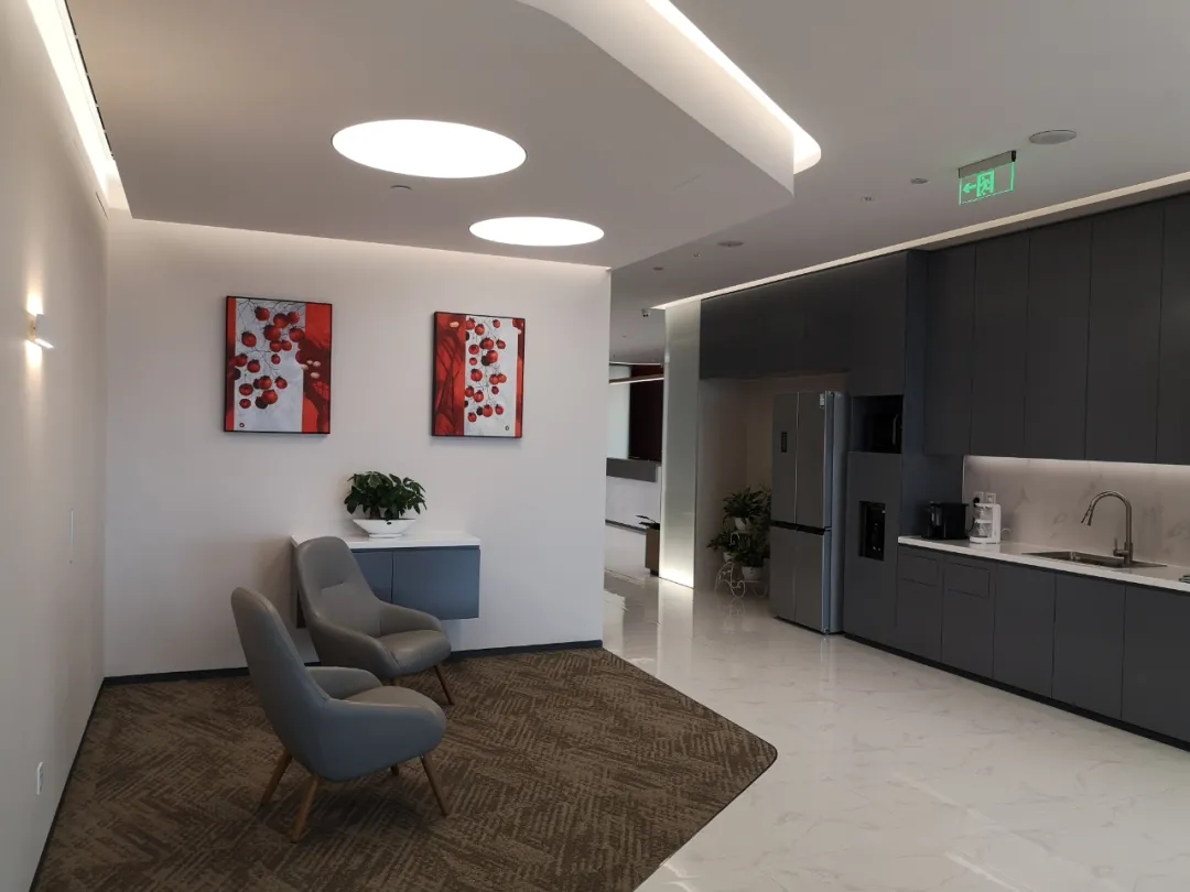 开敞办公区采用线条灯无缝拼接,与室内家具陈列相呼应,强调空间动线,局部区域采用深照型宽光筒灯,保证工作面的照度及均匀度的同时很好的避免了眩光,满足空间视觉舒适度。边柜内部暗藏灯带,丰富空间整体层次,提升空间内在意境。