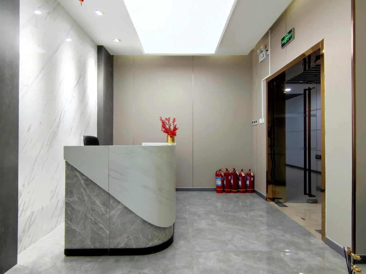 背景墙位置采用暖色光洗亮木饰面,突显材质的质感与细节,墙面发光小孔随机散布,为整个空间增添了一份灵动,整体接待区冷色光与暖色光的对比也与空间整体装饰风格相呼应。