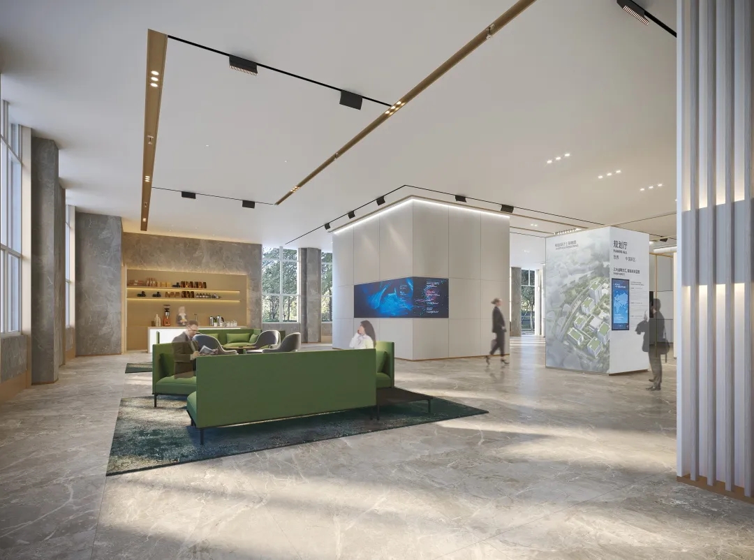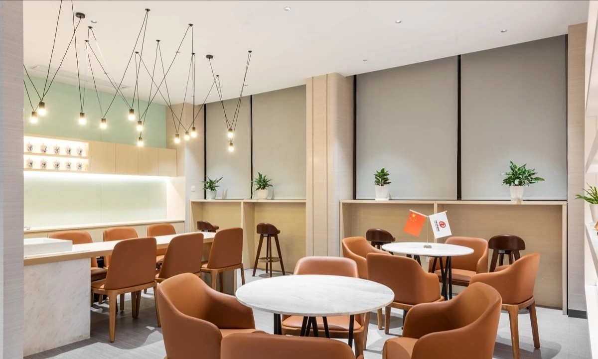 休息区空间装饰更加丰富,软装材质和颜色也相对多样,灯光设计上增加了更具装饰性的吊线灯具,自由吊装,丰富空间形态。