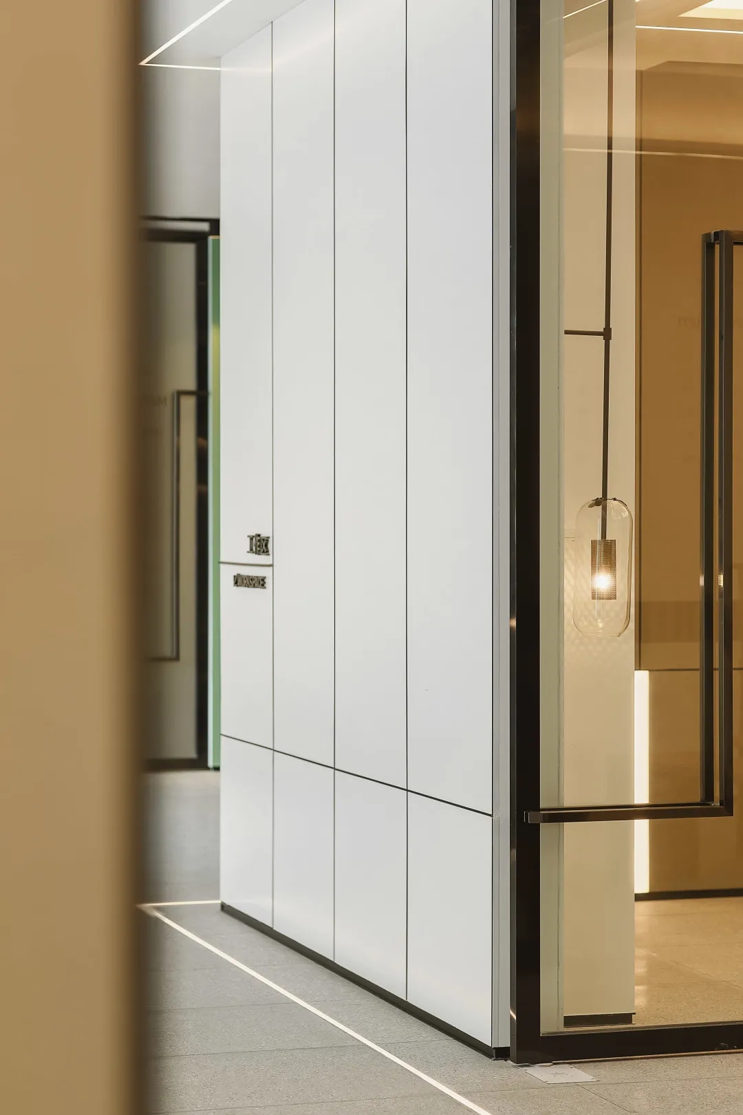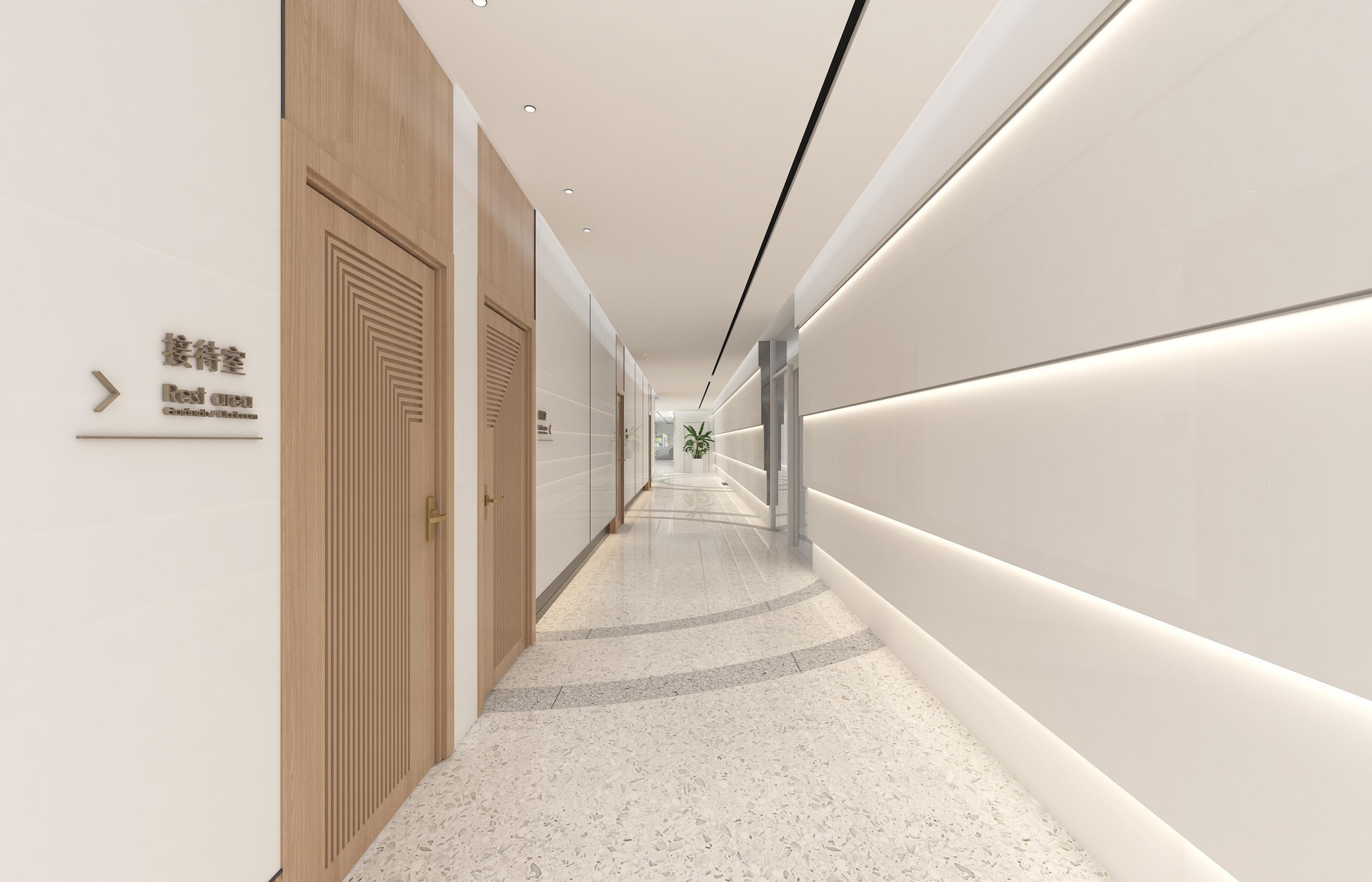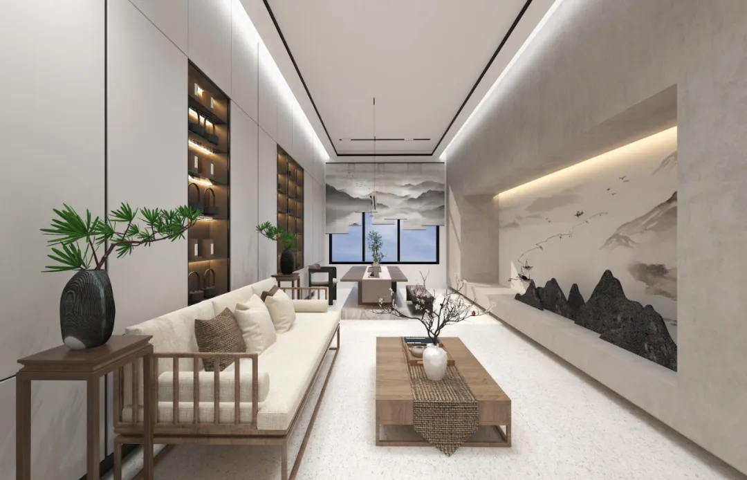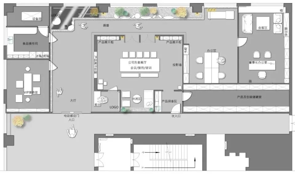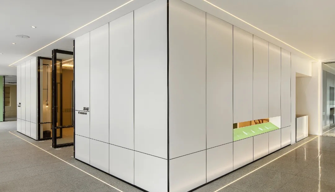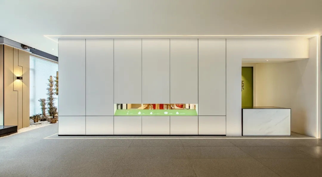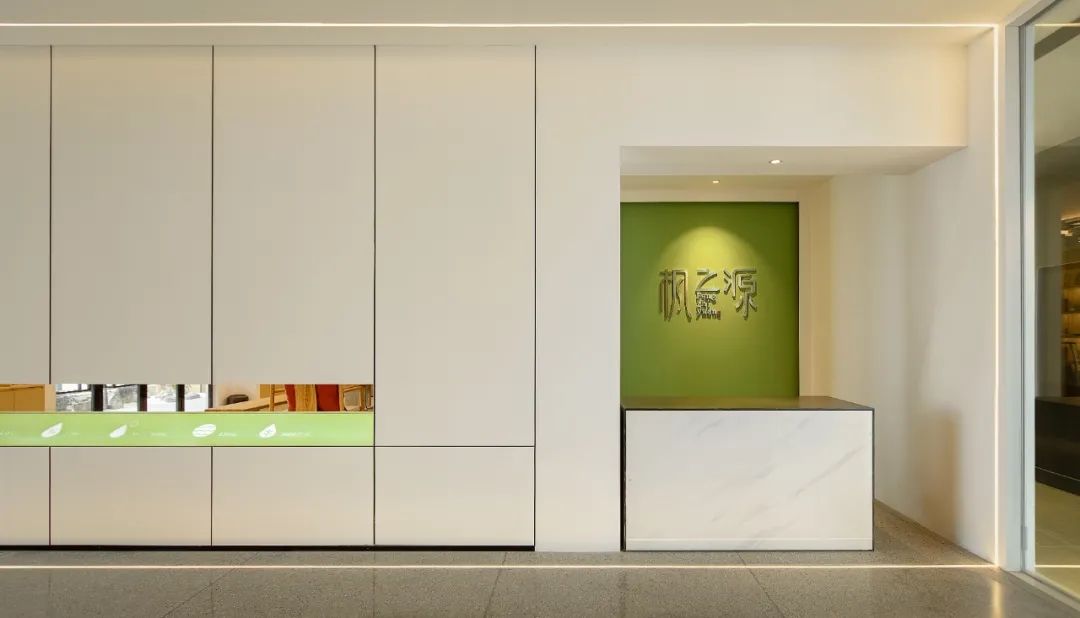 洁白的空间基调,绿意盎然的点缀掩盖纷繁复杂的干扰,赋予空间充满生命力的自然气息绿色是品牌属性的色彩表达,生机盎然且健康和谐枫之源,意味源源不断的输入健康营养的品质铁皮石斛是主要的产品,它源于雁荡山,这是一个山脉相间的地貌。以山形为背景,层次凸出形成关键空间的门墙,给予空间完整的构图。寓意强而有力的企业发展,枫之源品牌的逐渐成长。地面的白色鹅卵石与线性灯作为水泥色与深灰色地面的调和剂,丰富空间层次的同时减去了沉闷感,仿佛两个空间之间的界限,似有若无。
