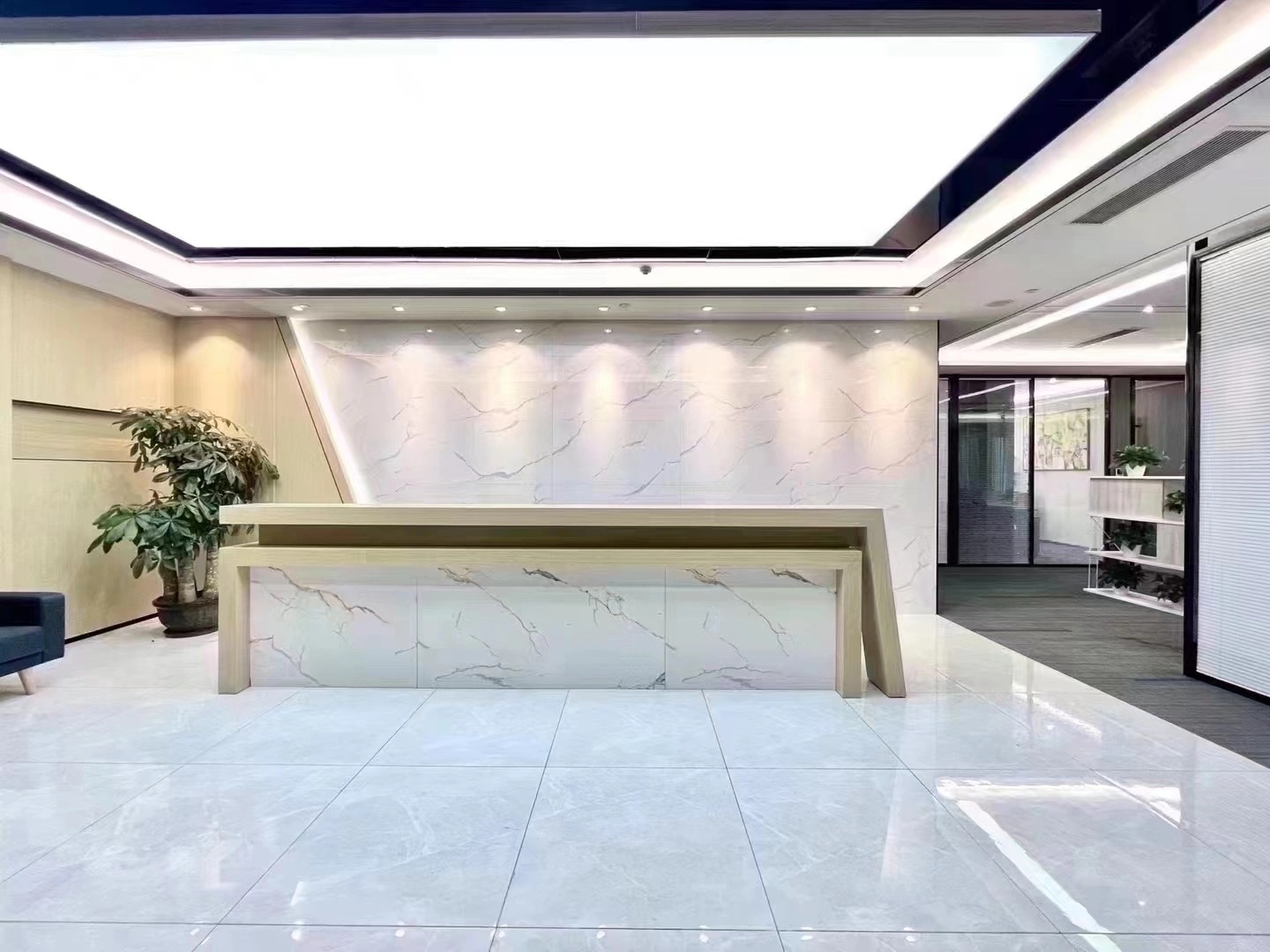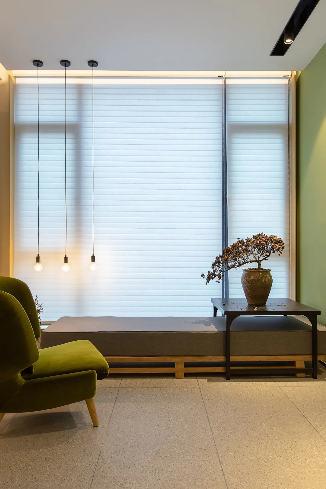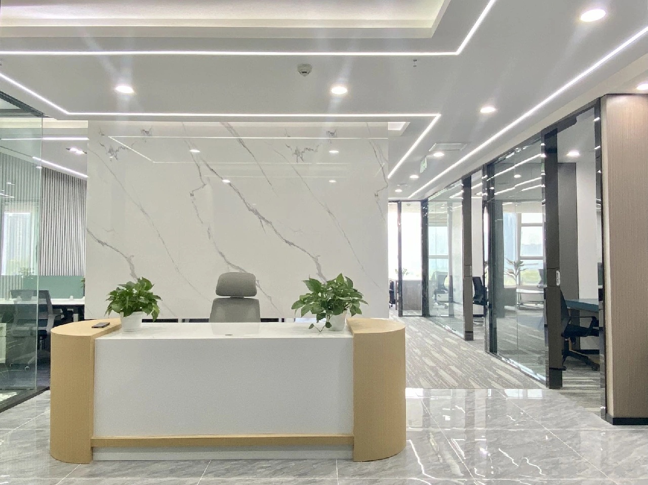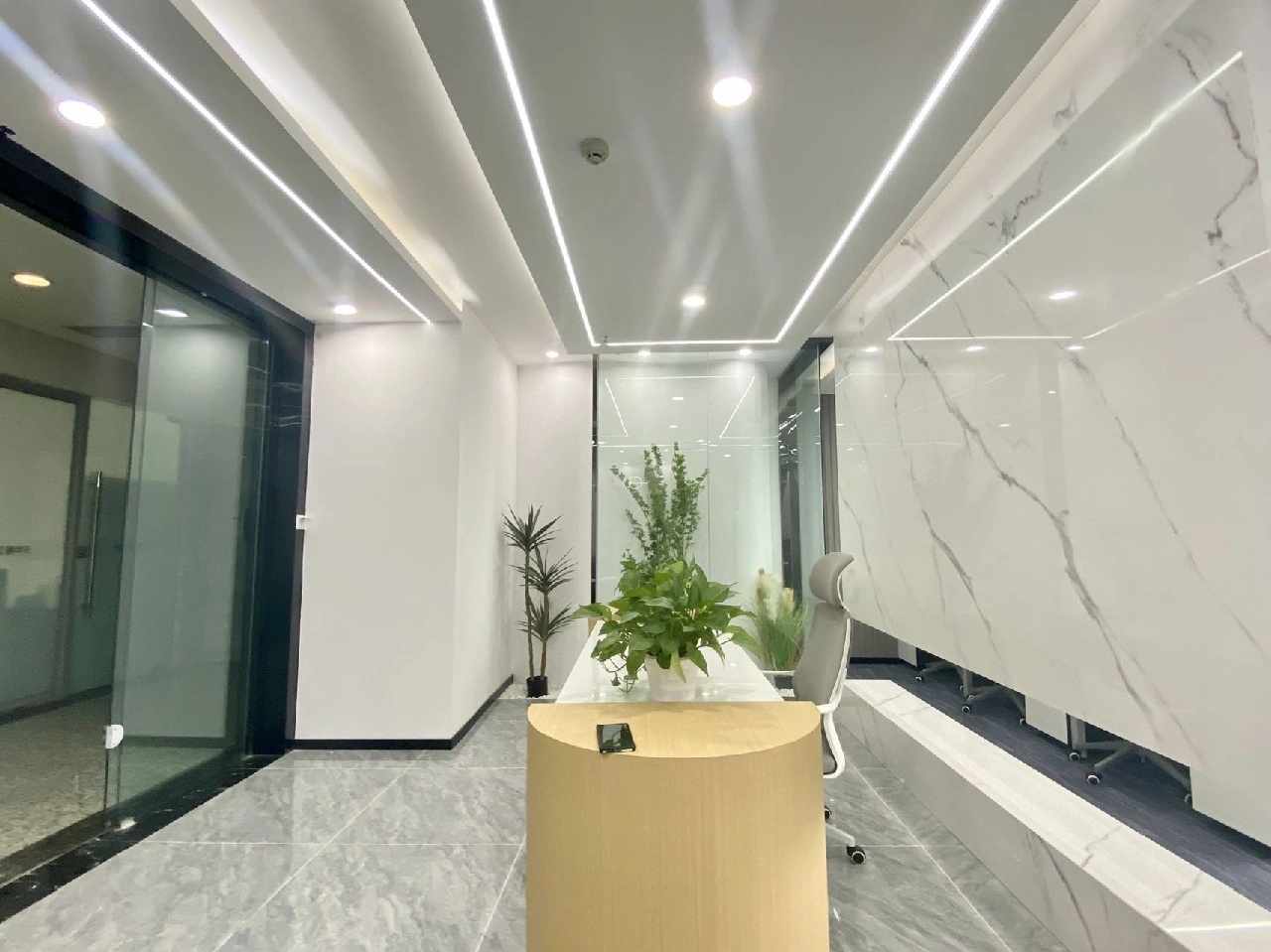 洁白的空间基调,绿意盎然的点缀掩盖纷繁复杂的干扰,赋予空间充满生命力的自然气息绿色是品牌属性的色彩表达,生机盎然且健康和谐枫之源,意味源源不断的输入健康营养的品质铁皮石斛是主要的产品,它源于雁荡山,这是一个山脉相间的地貌。以山形为背景,层次凸出形成关键空间的门墙,给予空间完整的构图。寓意强而有力的企业发展,枫之源品牌的逐渐成长。地面的白色鹅卵石与线性灯作为水泥色与深灰色地面的调和剂,丰富空间层次的同时减去了沉闷感,仿佛两个空间之间的界限,似有若无。