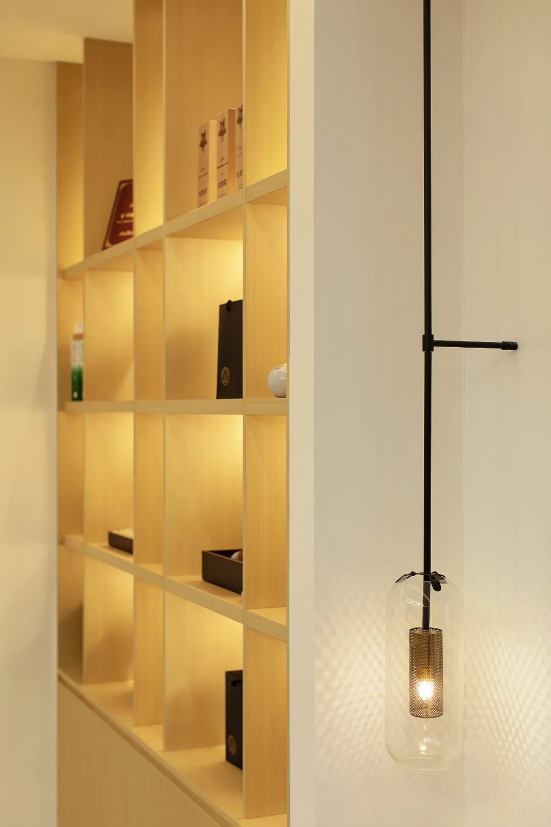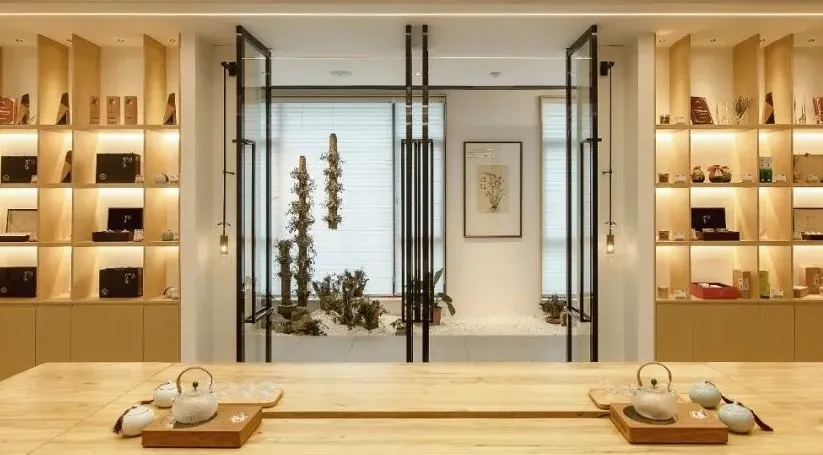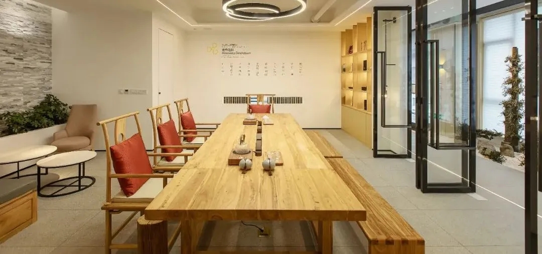 柔和、舒适、温馨的照明氛围,既隐喻又充满了想象力。朴质原始的自然元素增加了空间的叙事性。将产品与体验区设置在此,给人更多的视角可观察到产品原料的质感,同时从味觉出发,体验石斛饮品的口感。