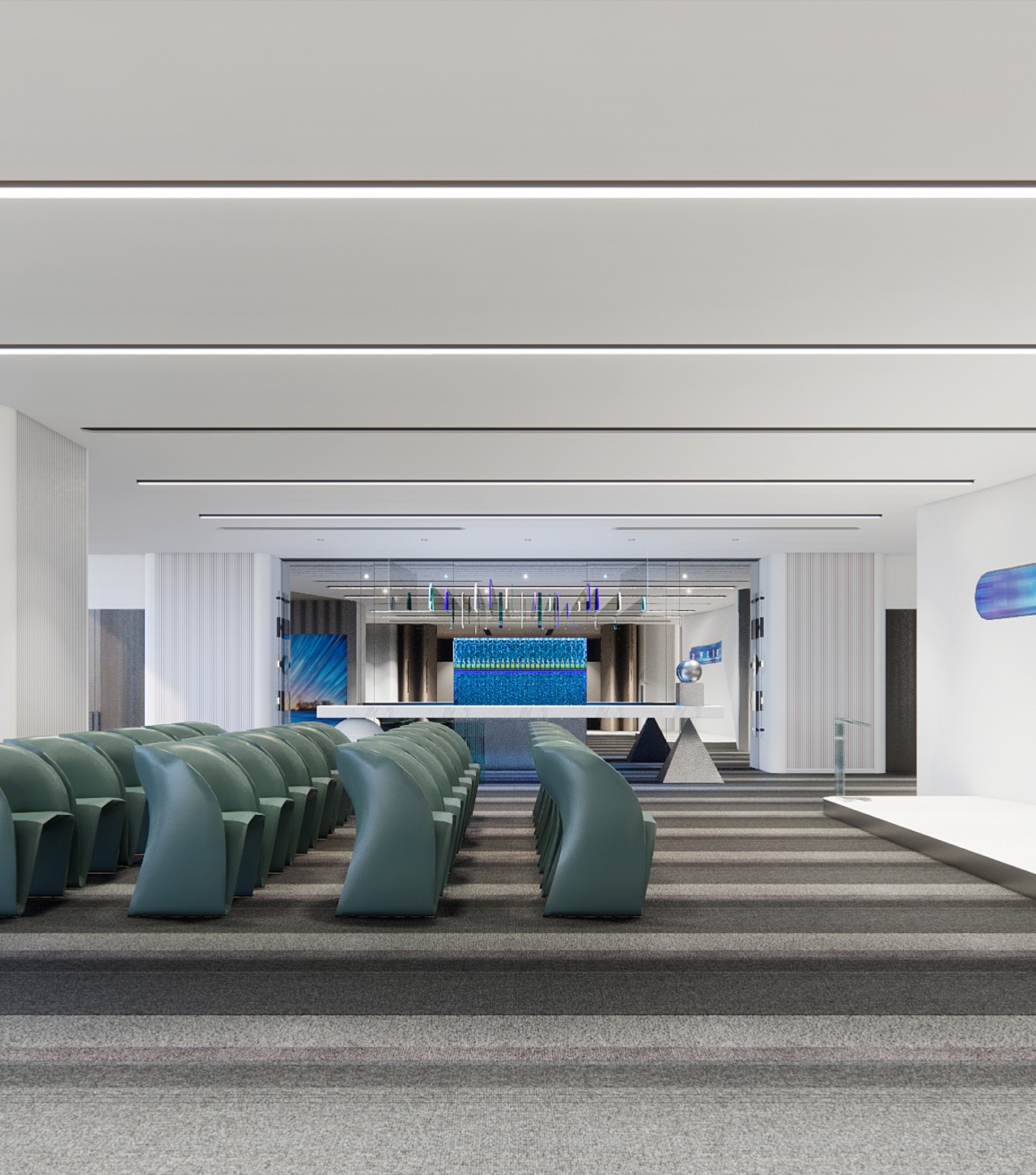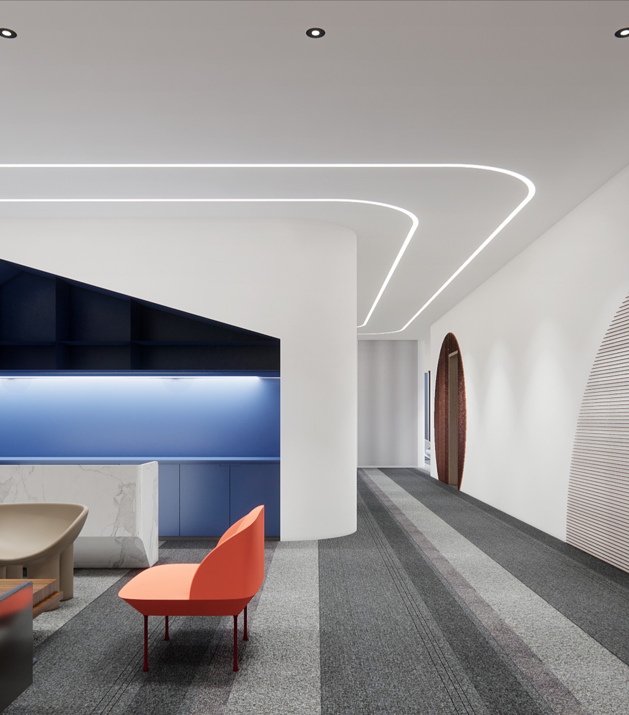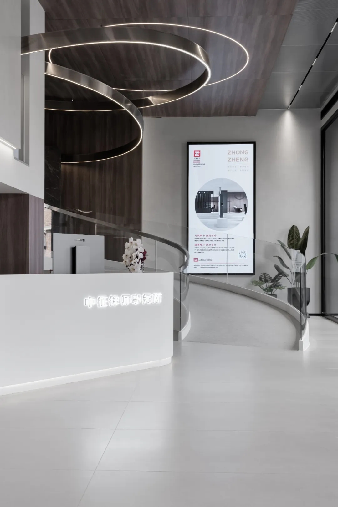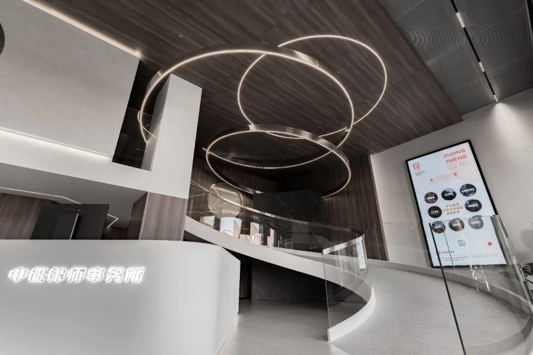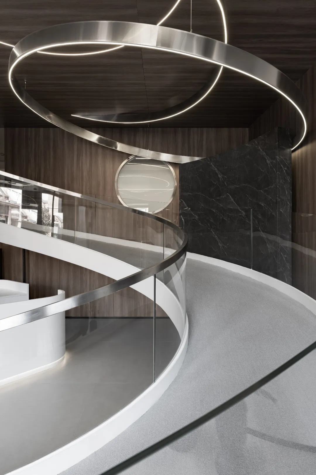 层层叠进的悬挑吊灯设计与整体建筑交相呼应,宛自天开。这不仅是独具特色的记忆点,象征着企业的发展,稳稳的盘旋而上。