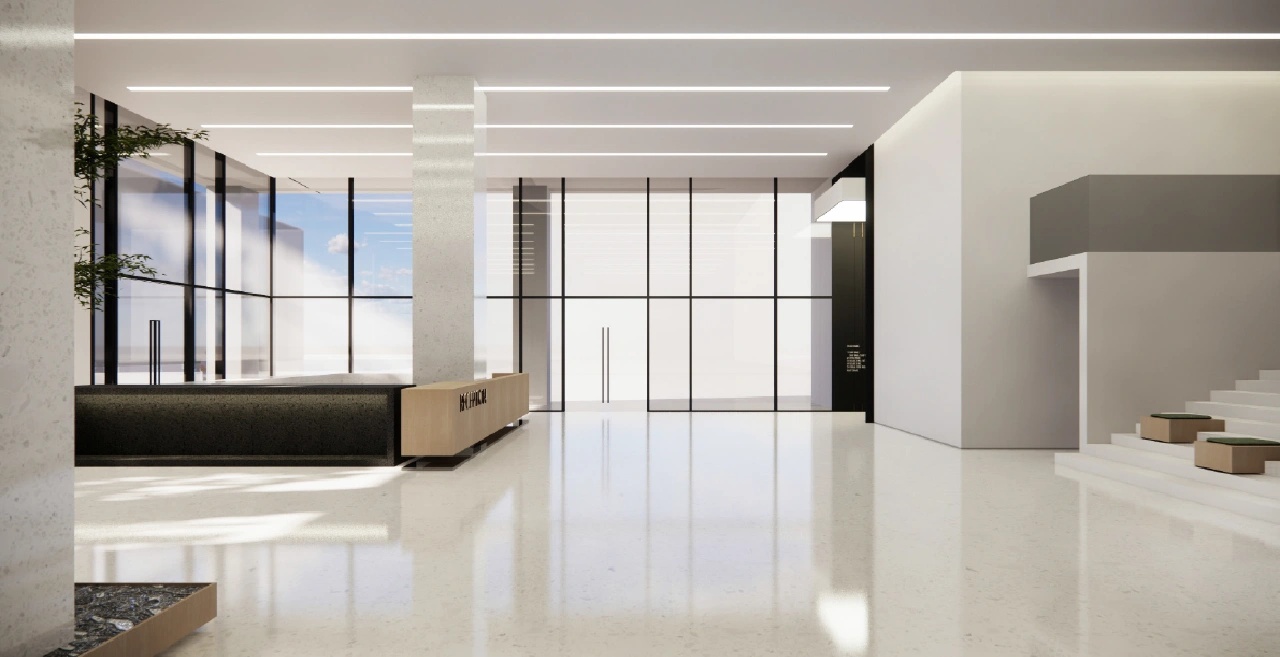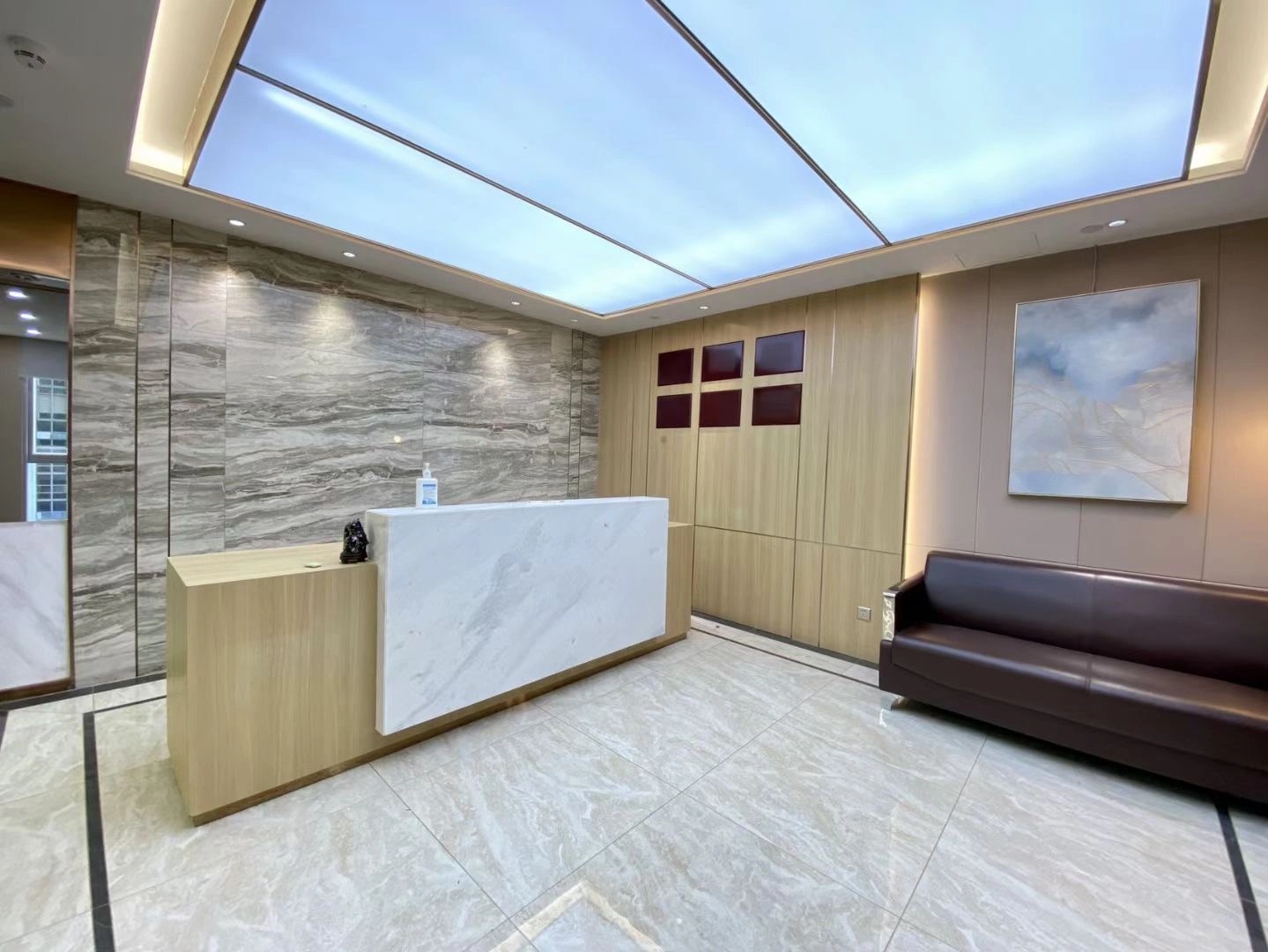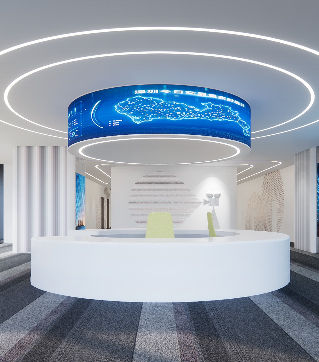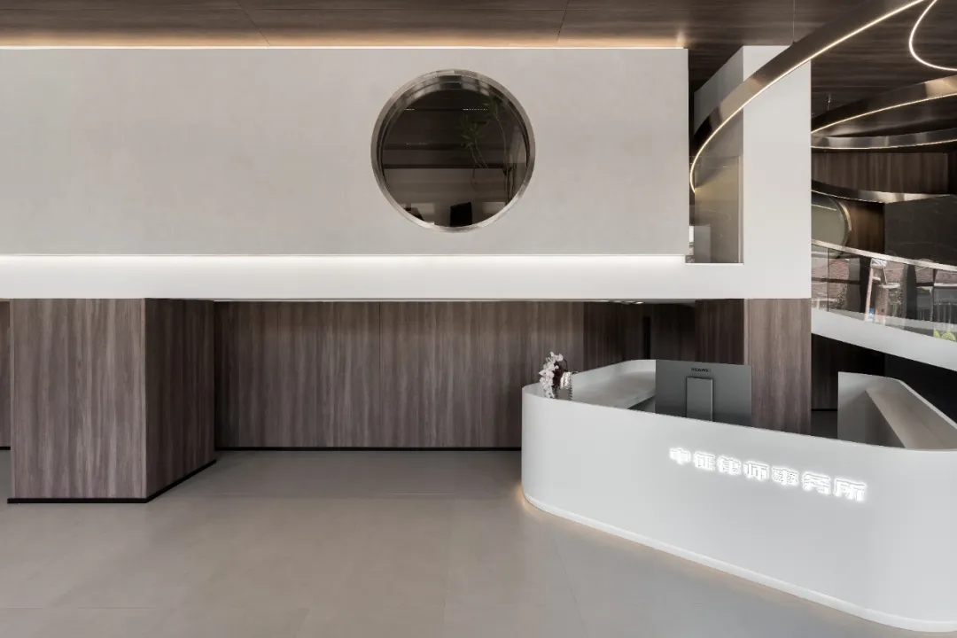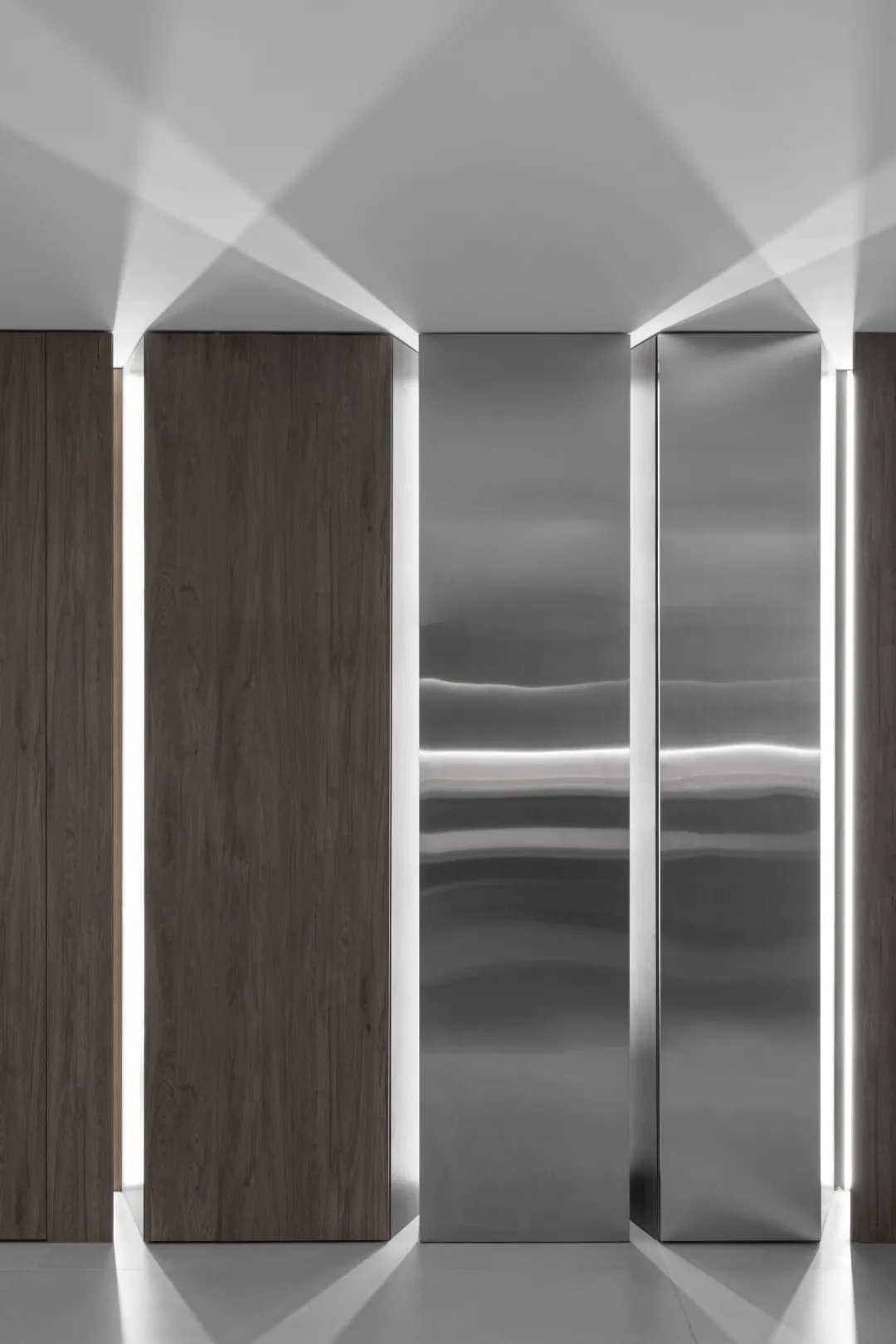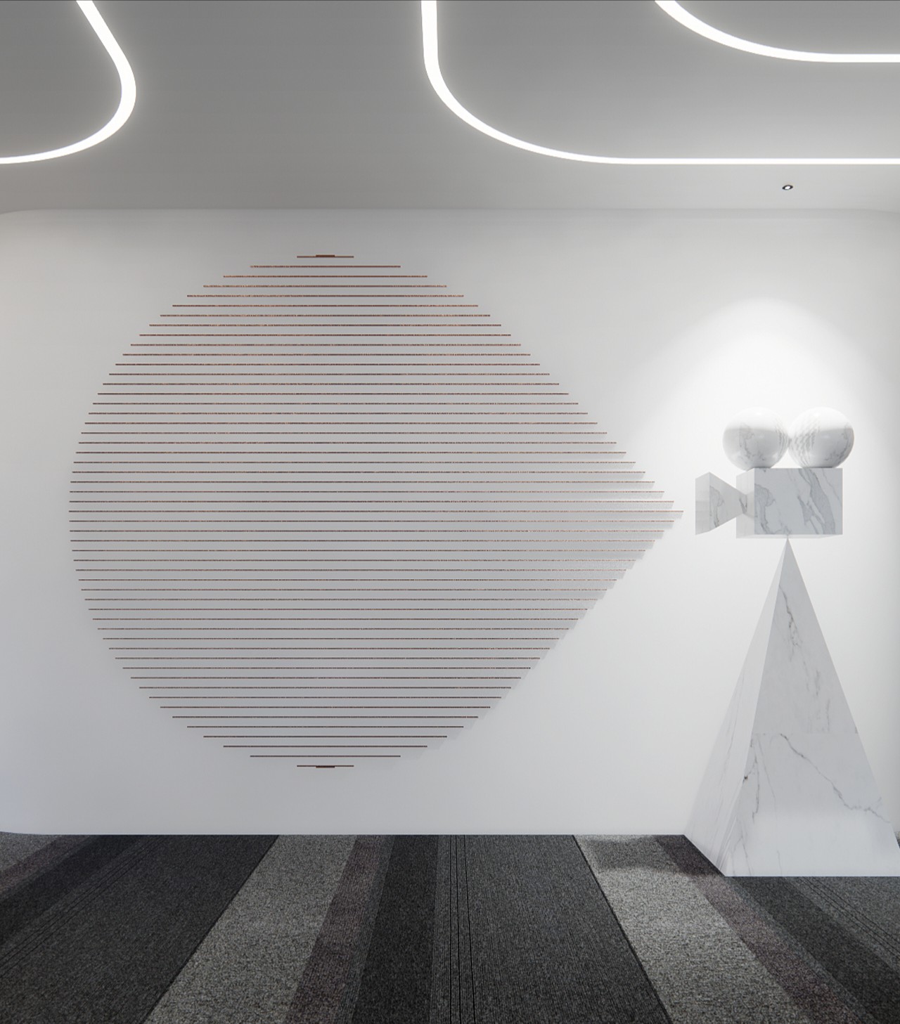 层层叠进的悬挑吊灯设计与整体建筑交相呼应,宛自天开。这不仅是独具特色的记忆点,象征着企业的发展,稳稳的盘旋而上。