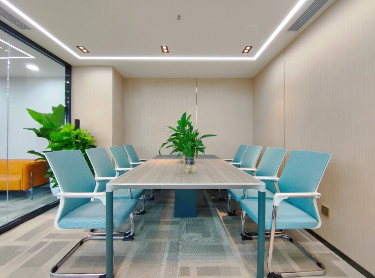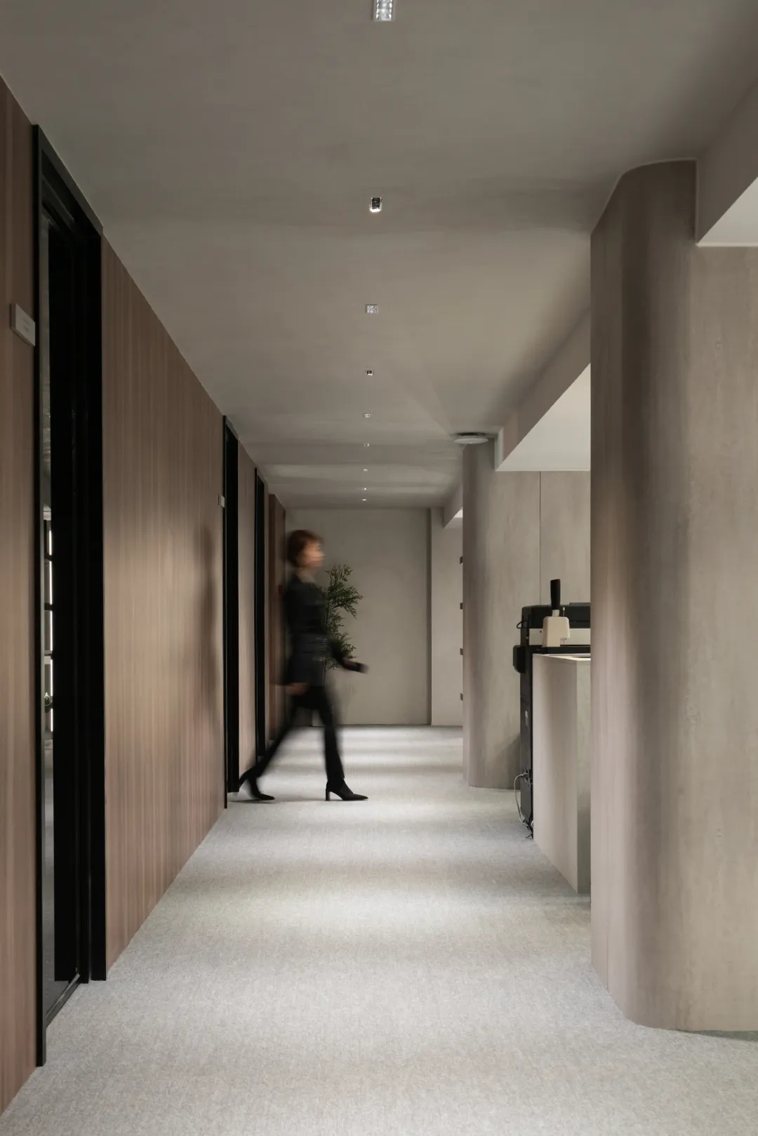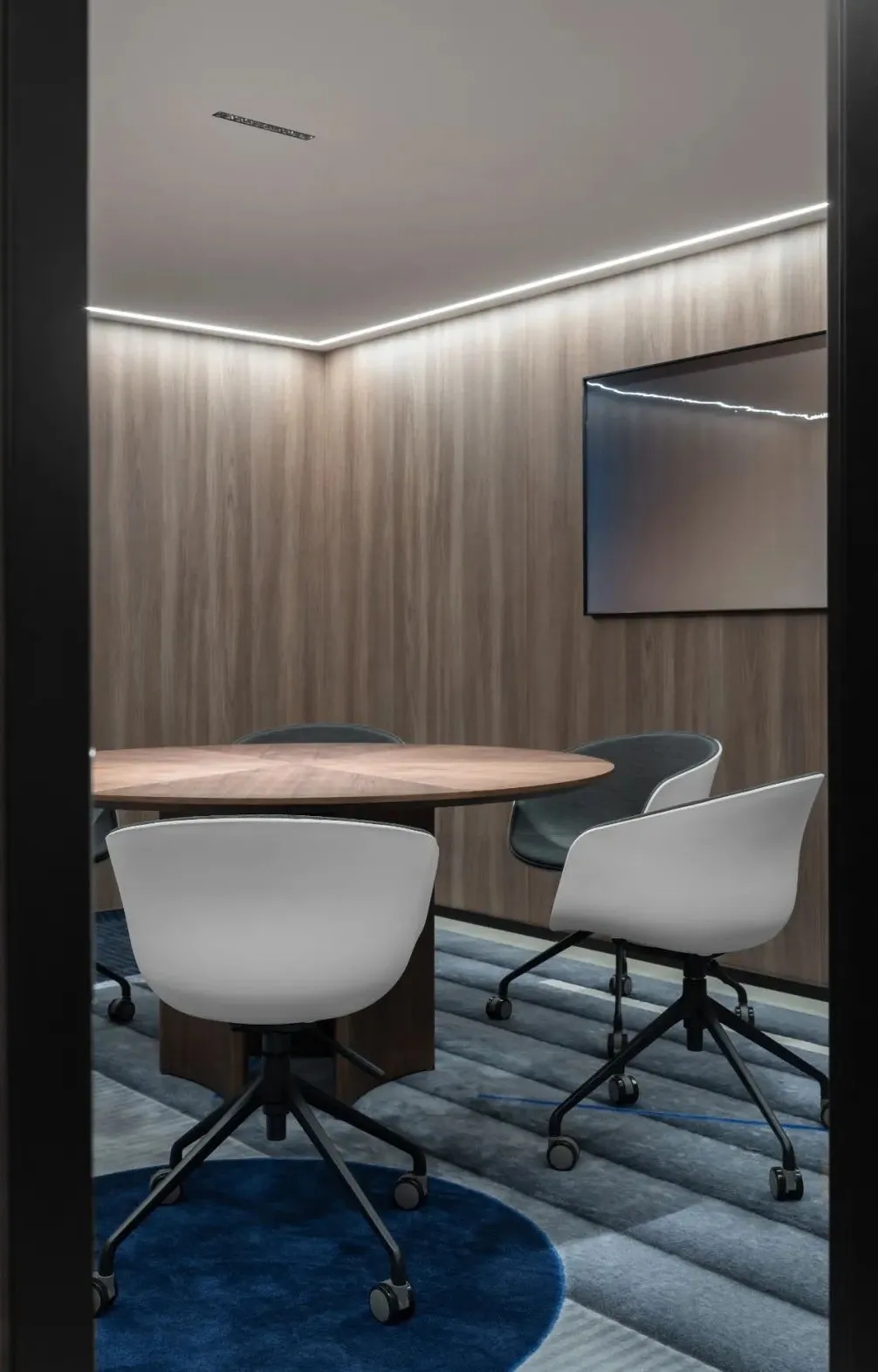 会议区地毯与木饰面的质感搭配营造出一种高级温暖舒适的感觉。木饰面中隐藏的衣柜与收纳柜,在不影响整体效果的同时也满足了招待与会议储物功能,此外会议室选用的圆桌可以消除距离感,拉近人与人之间的关系。