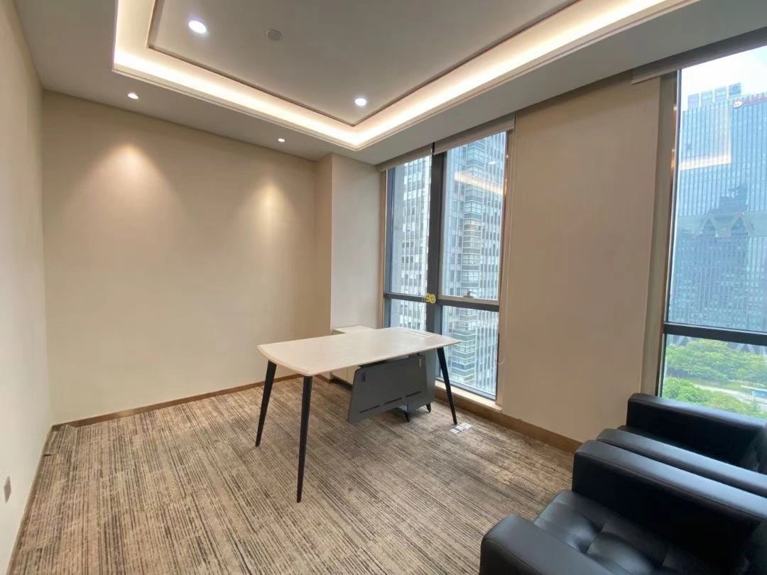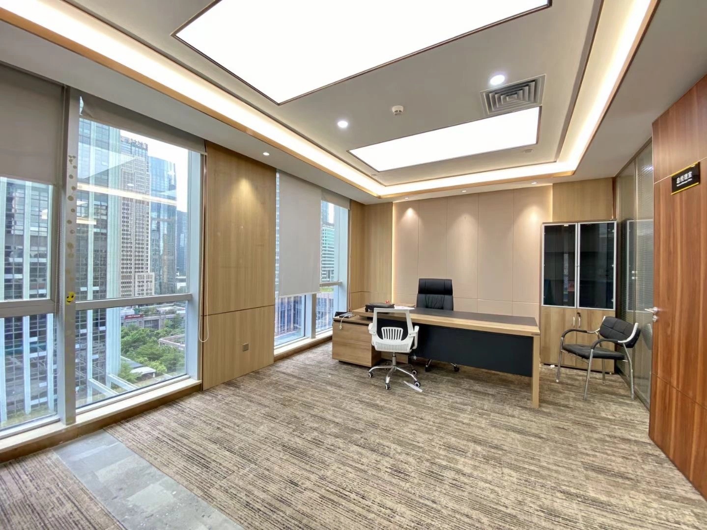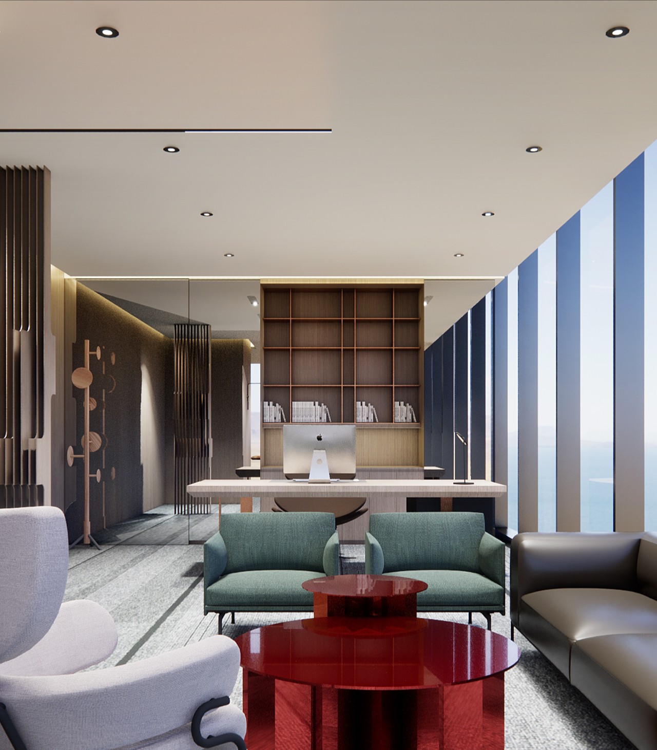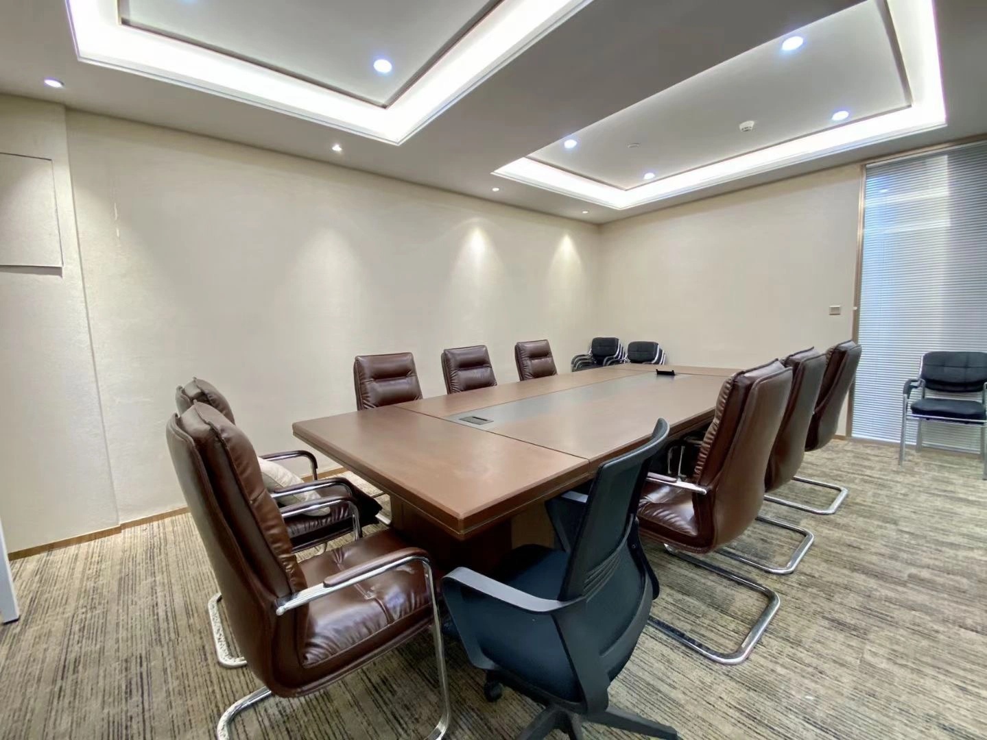 会议区地毯与木饰面的质感搭配营造出一种高级温暖舒适的感觉。木饰面中隐藏的衣柜与收纳柜,在不影响整体效果的同时也满足了招待与会议储物功能,此外会议室选用的圆桌可以消除距离感,拉近人与人之间的关系。