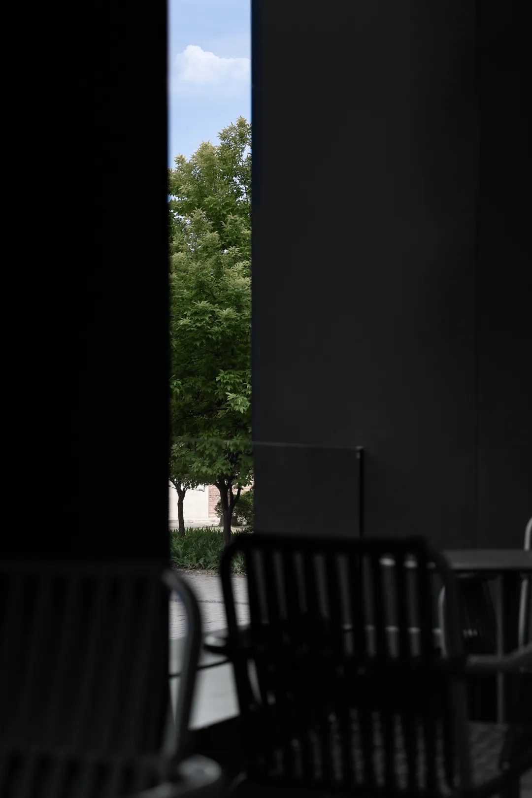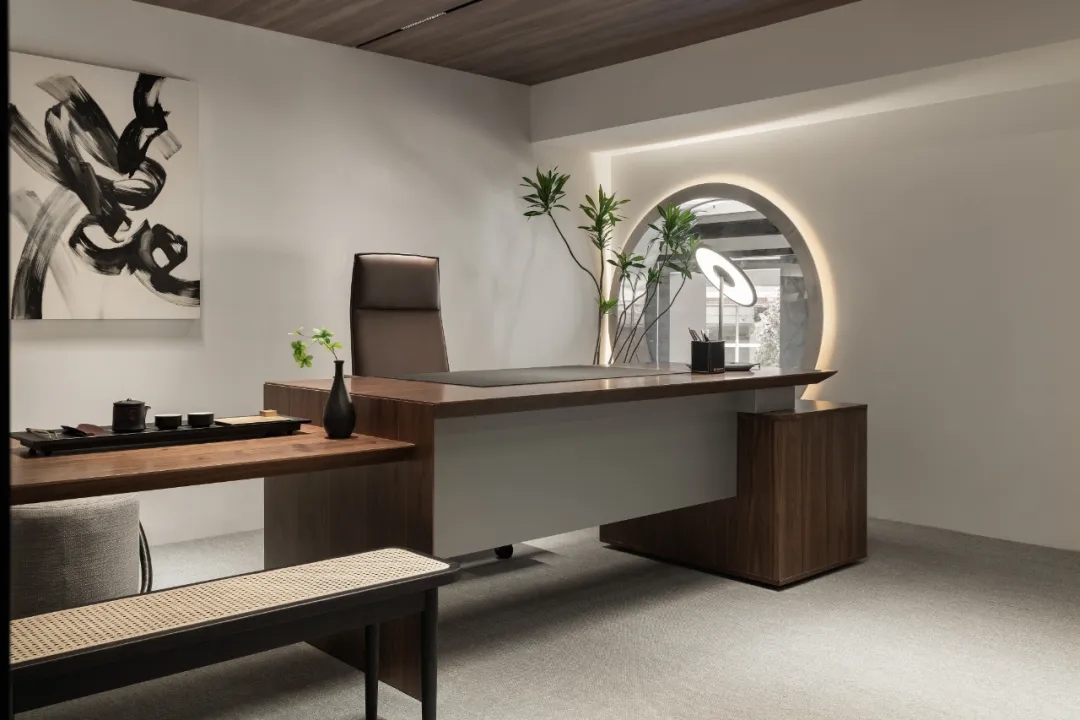 二层的办公室位于挑空区域的正上方,圆形开窗设计增加采光的同时增添了整个空间的传统意韵,借景的处理手法增添了空间的灵动之感。