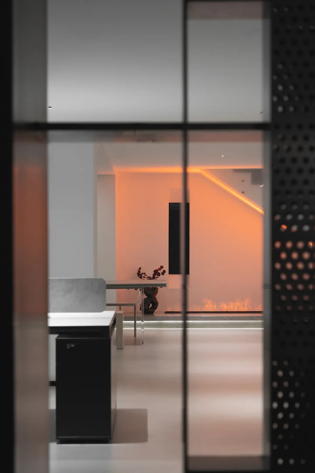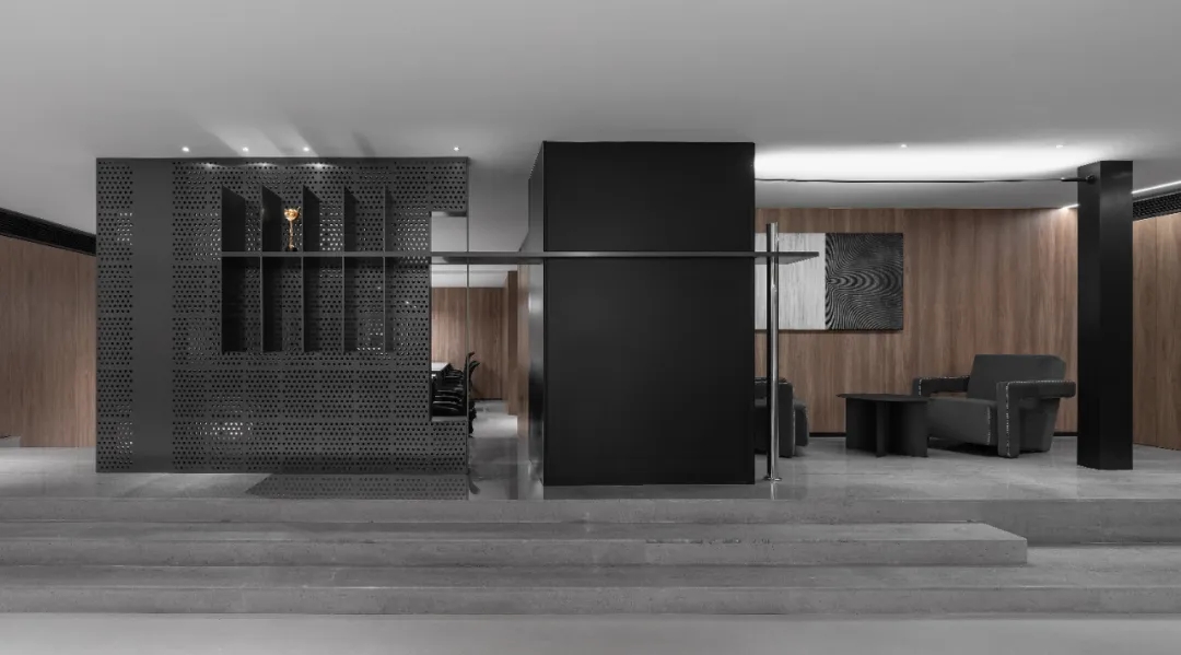 设计师通过地台的高度差营造出空间的层次感,由此划分办公区域与休息区域。同时空间利用地台边缘打造隔断式柜体,采用园林设计中常用的透景的手法,使空间的虚实结合,同时穿孔板材料的运用更增添空间的朦胧感。