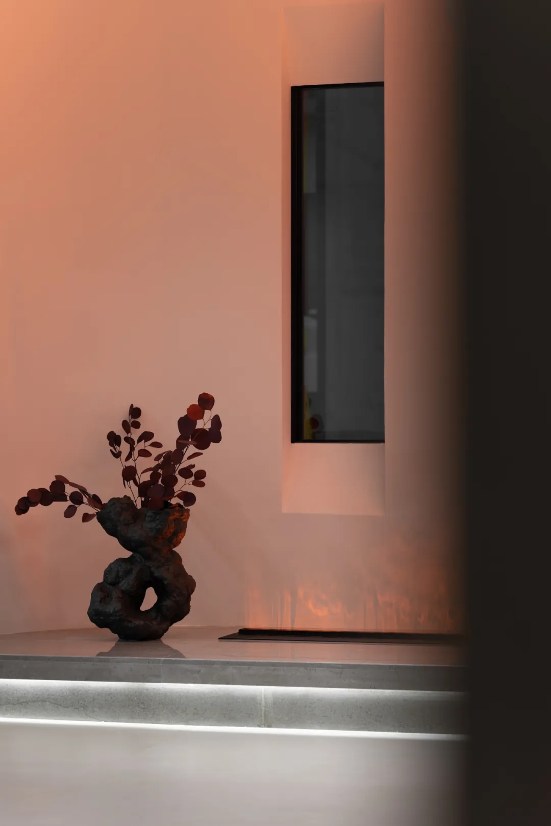 设计师大胆地在外墙上开了两个窗户,将阳光引进屋内,一个无光照的空间瞬间变得温馨自然。窗户墙面做了一面长金属造型,内开一格灯光,楼梯也同时也嵌入了一个长壁炉,为整个空间增添一些生活气息。