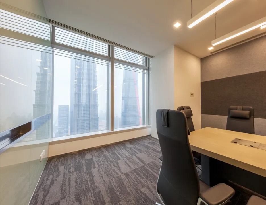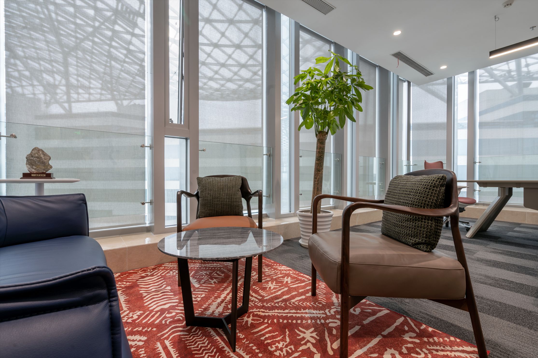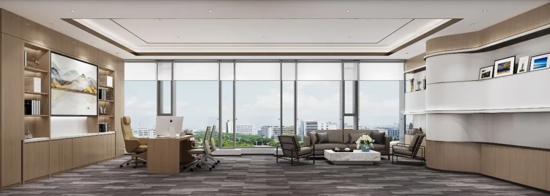 富有质感的实木会议桌和真皮座椅,细节之处传递出企业具备的温度。大面积落地窗饱揽窗外景色。弧线的使用打破了紧绷的商务感,让空间之间的相互衔接,将室内打造出雅致之感。