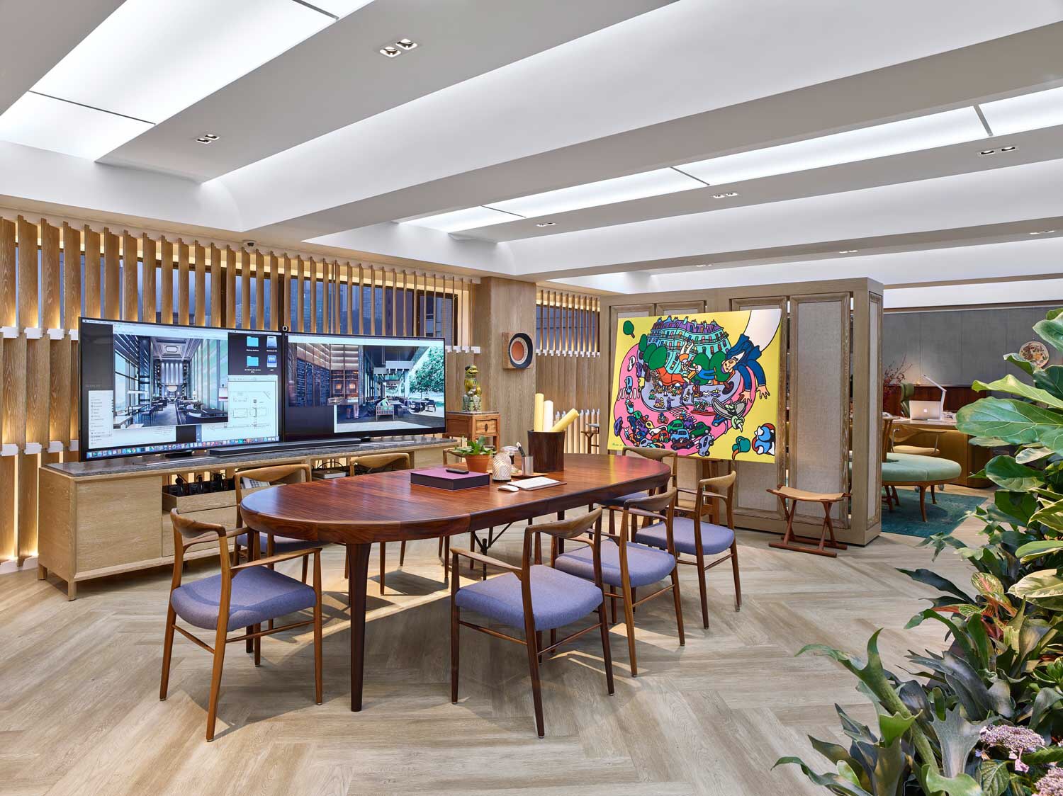 合理、功能性是会议室空间配置的内核。简约的气场在空间中拥有强大包容性与融合感。会议室有投影幕、电视会议系统,同时兼顾荣誉墙等功能,象征着企业的整体文化与形象。
