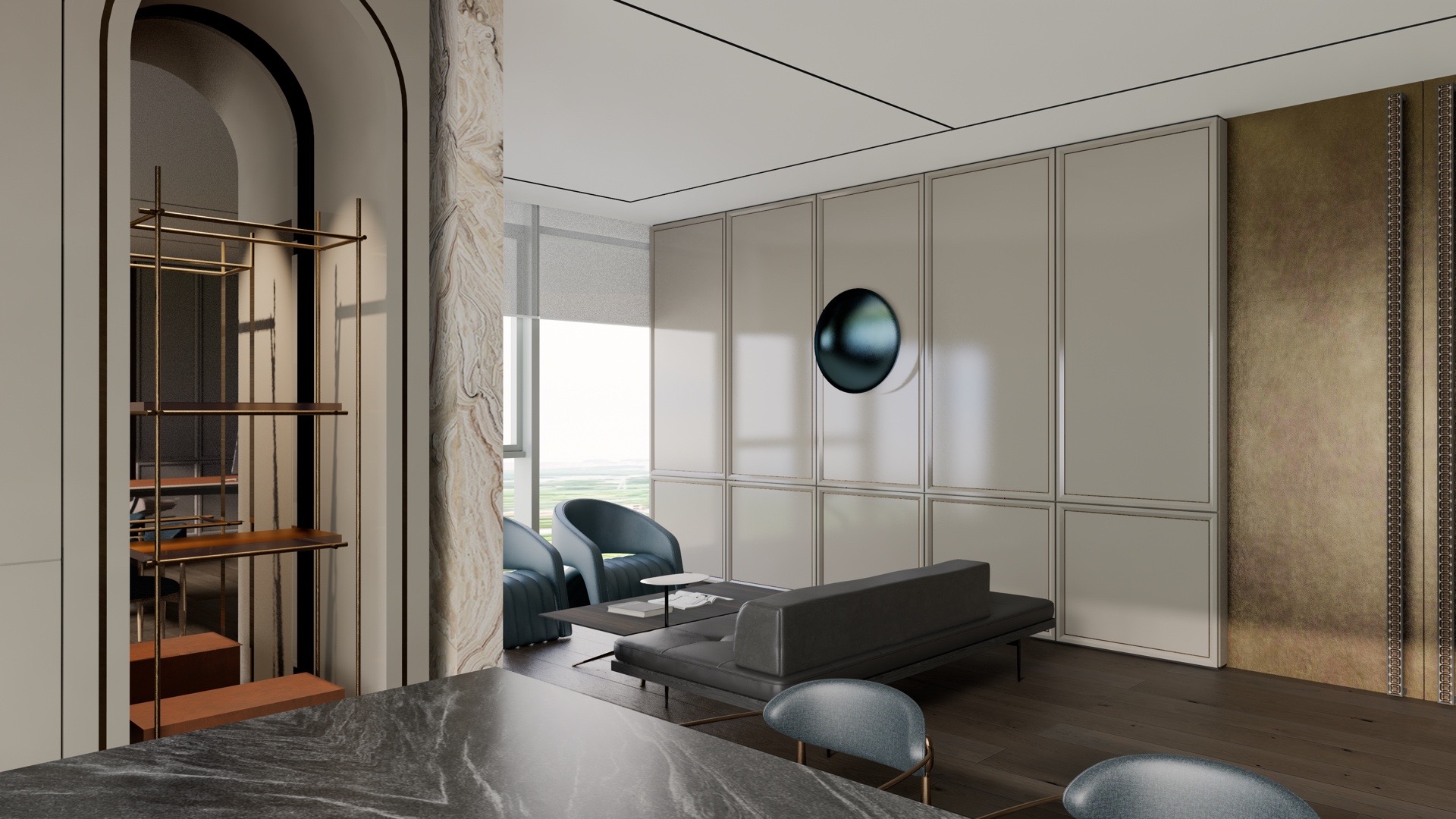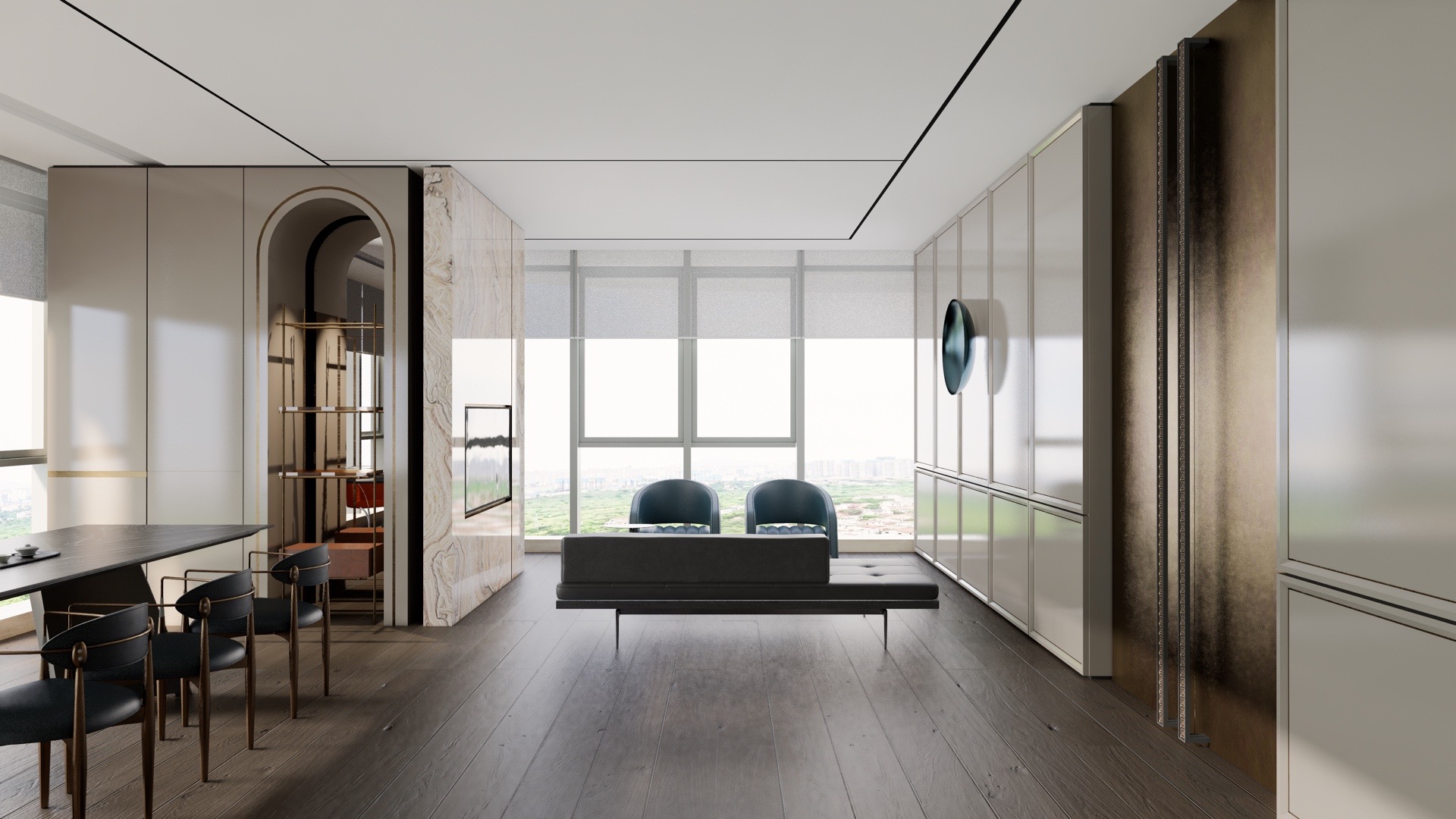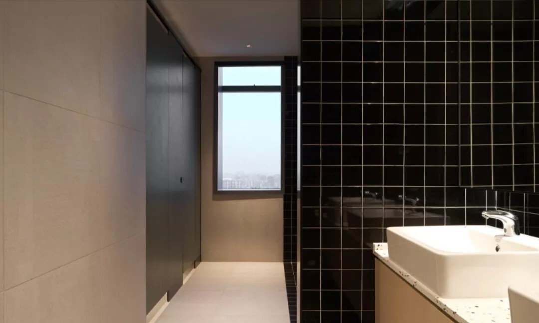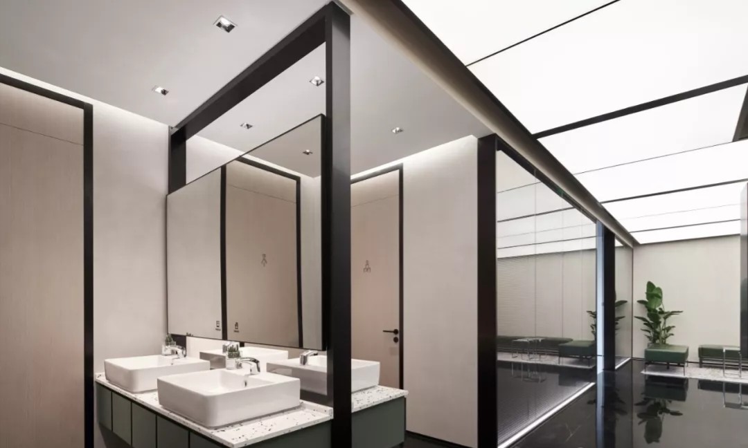 办公区大面积开敞为主,让外界的光与景深入室内,黑白灰三色地毯无序拼接贯穿空间。每个事业部以固定工位、活动工位(可替代为内部会议桌)、部门领导位及其区域设置的非私密性讨论站为一个单元,共四个单元分别布局在空间南北两侧,部门内部活动工位和非私密讨论站也有效增加企业内部会议及讨论空间需求。