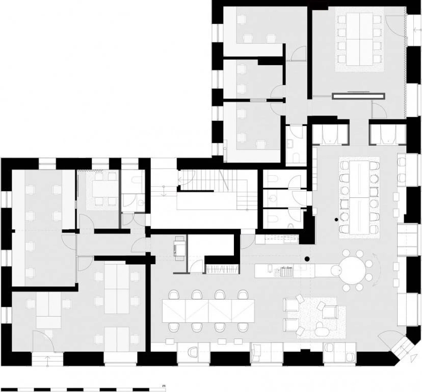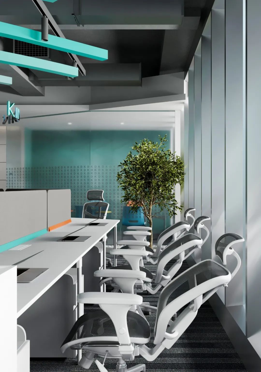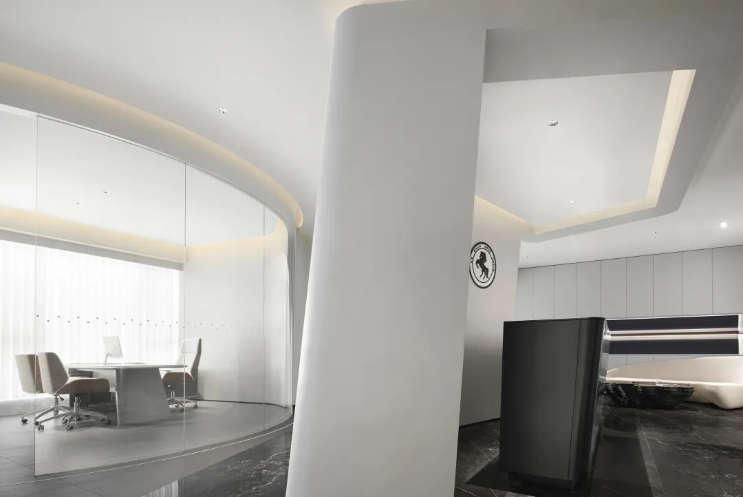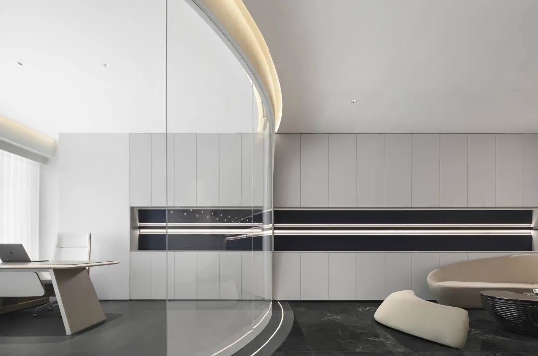 本案整体风格,设计师通过黑白简色的极致运用,营造出严谨开放,灵活稳重的多维可能,团队气场由此散逸,强势流转。