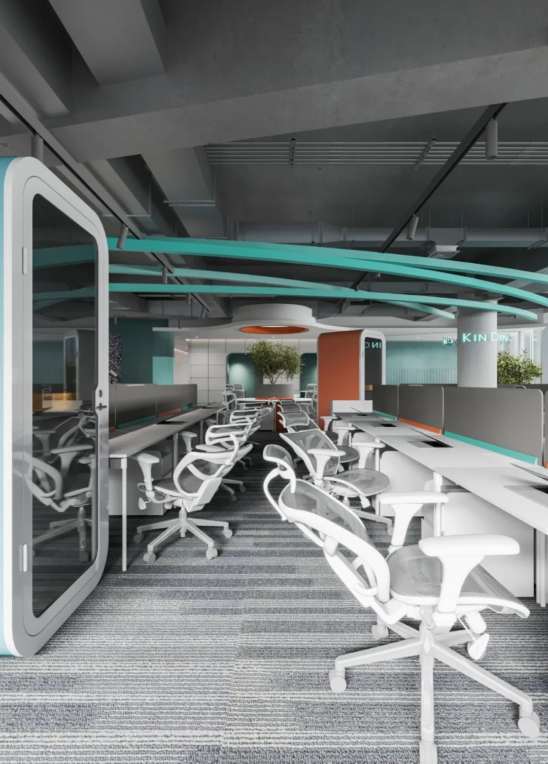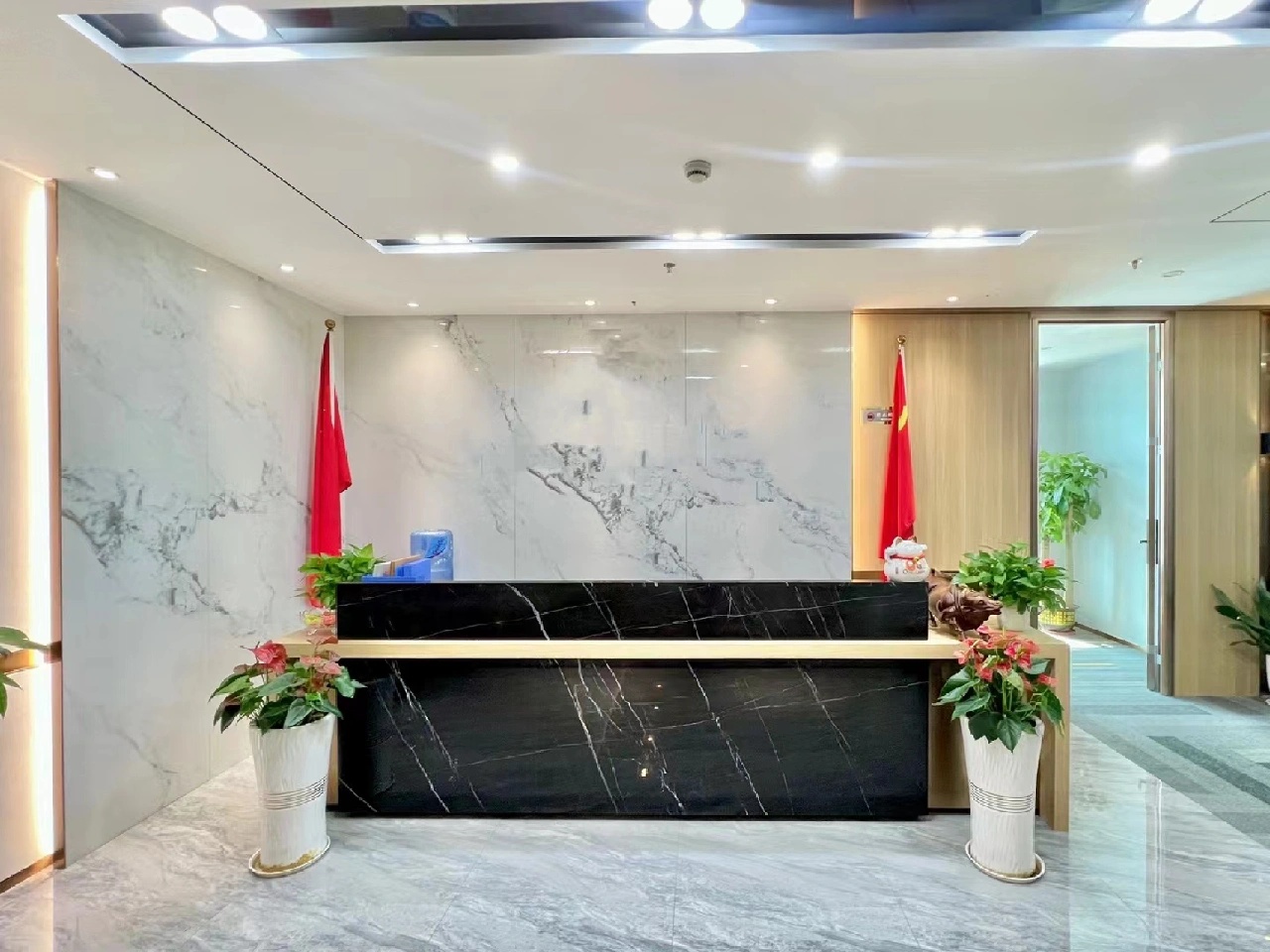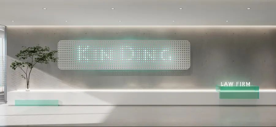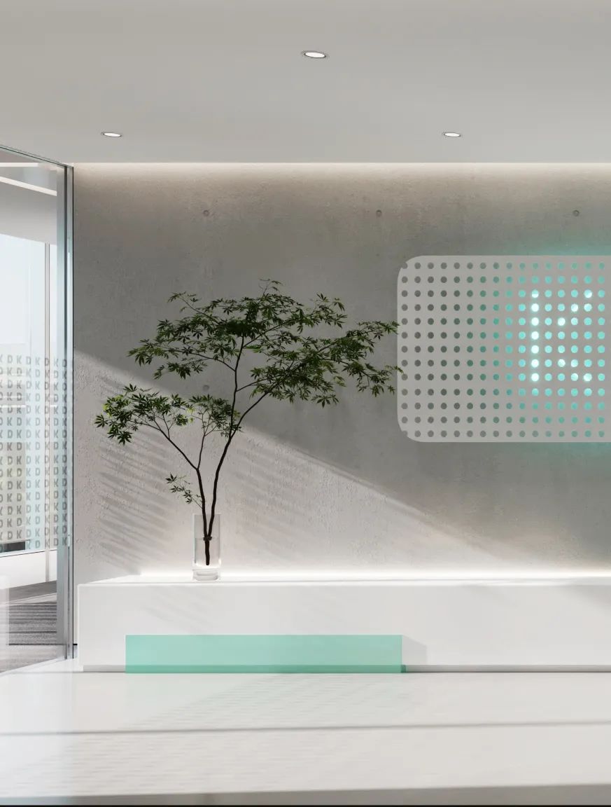 门厅的设计造型是个通过提取出思倍大写字母(SIB)做抽象艺术化的处理,再体现形的同时融入到整体背景造型中(跟logo的对应关系),石膏板造型的处理上提取了主LOGO的型,造型尖角和弧度的处理都是从主LOGO提取而出,在功能处理上,通过长虹玻璃即表现了大写字母(I)又能够让行政办公室能看到门厅,美观和实用并重。