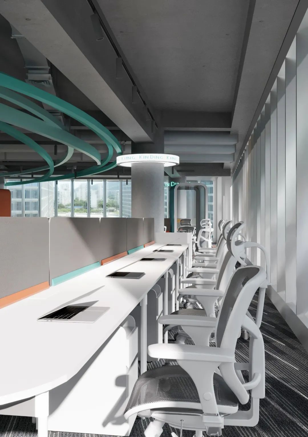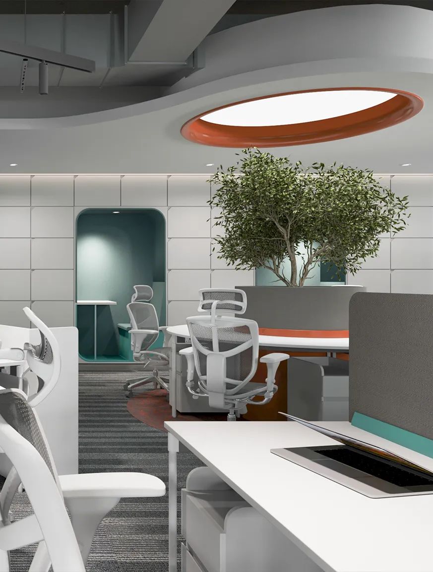一楼办公区考虑到整体采光和层高,在材质选择上以白色乳胶漆为主,局部点缀LOGO色。让空间从视觉效果上表现的干净明亮。