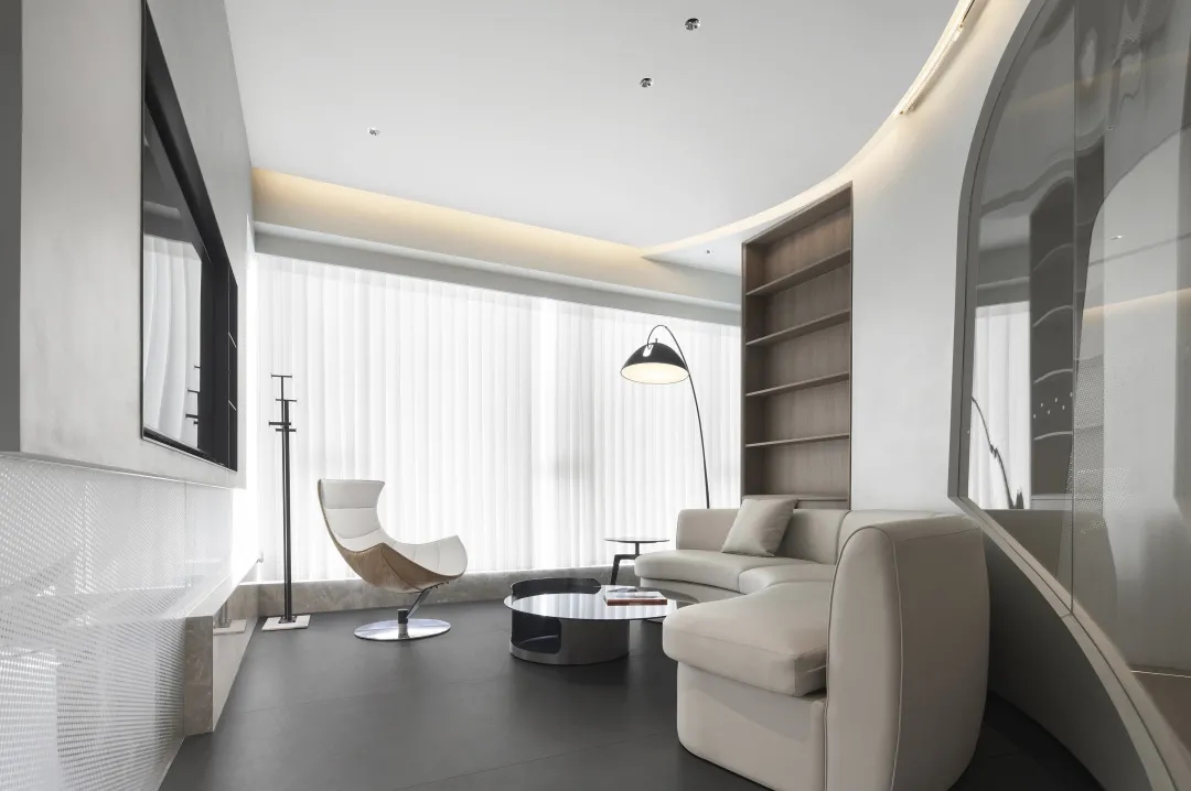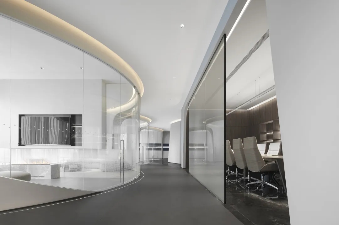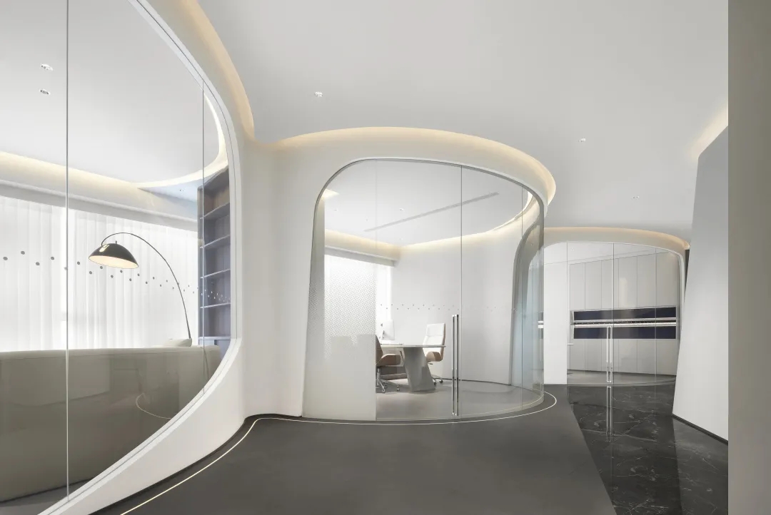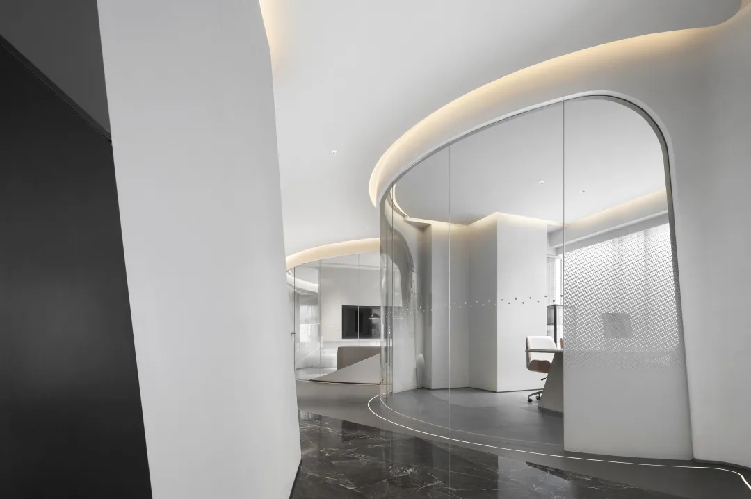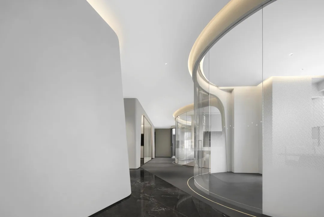 连接局部的公共区域以弧线形式布局,外立面采用玻璃材质,暖色调顶灯将自由随性进一步呈现,行步其中,觅得心灵与精神的张弛舒缓。