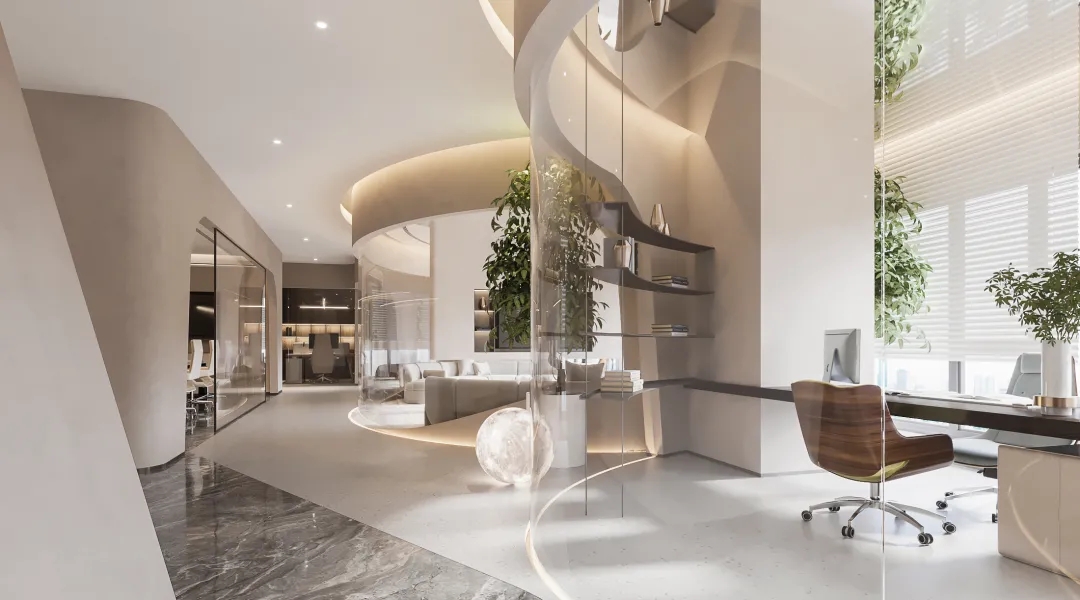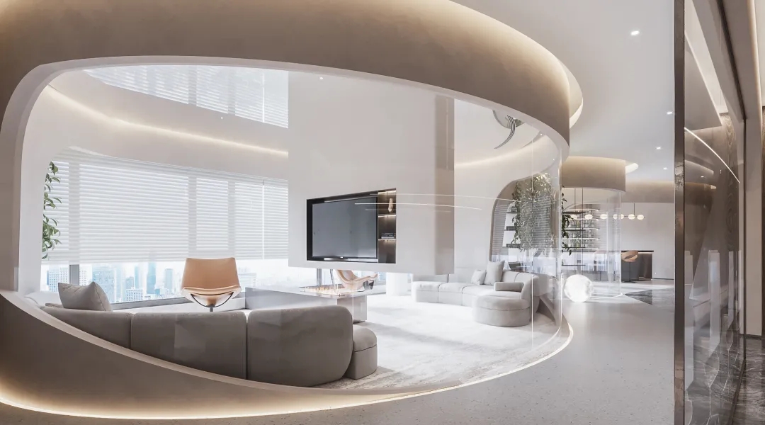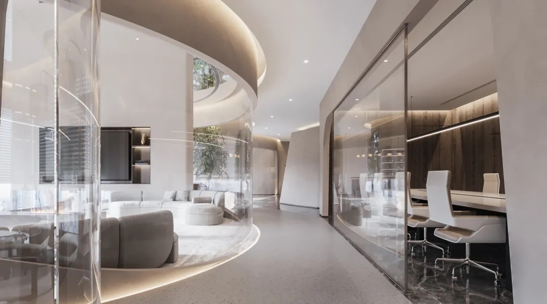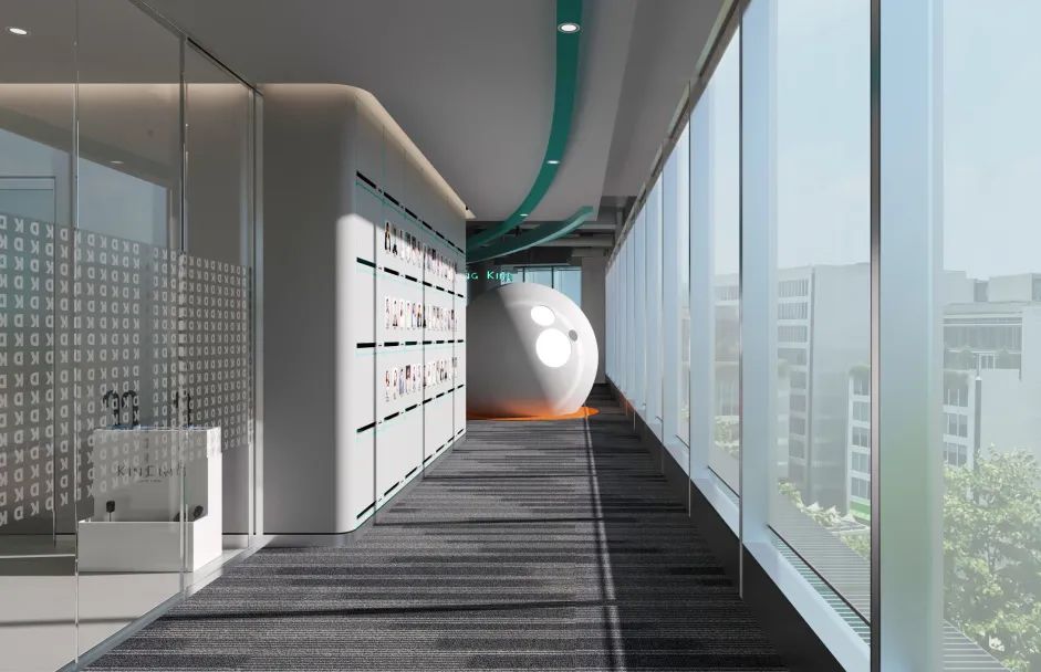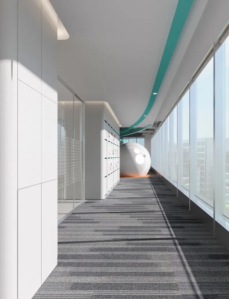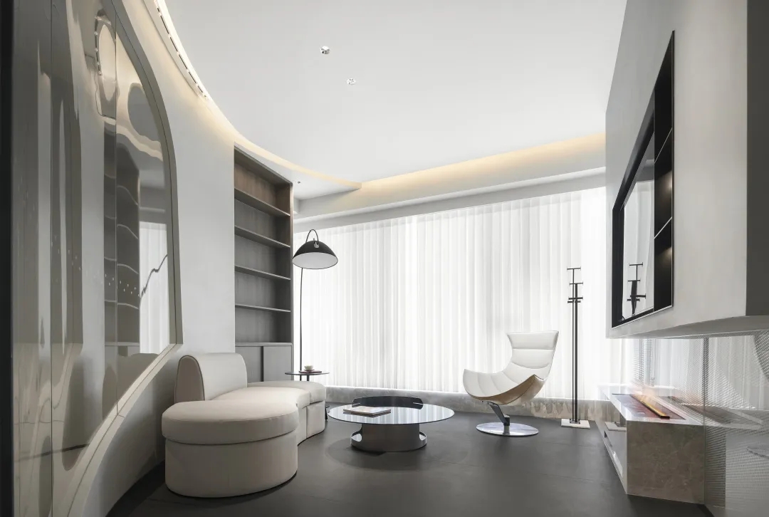 连接局部的公共区域以弧线形式布局,外立面采用玻璃材质,暖色调顶灯将自由随性进一步呈现,行步其中,觅得心灵与精神的张弛舒缓。