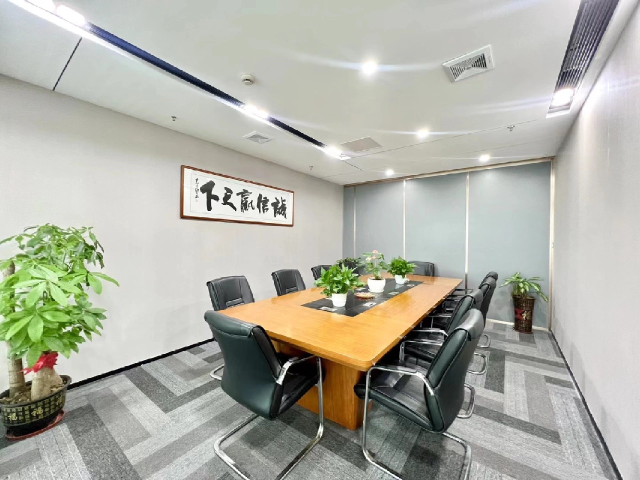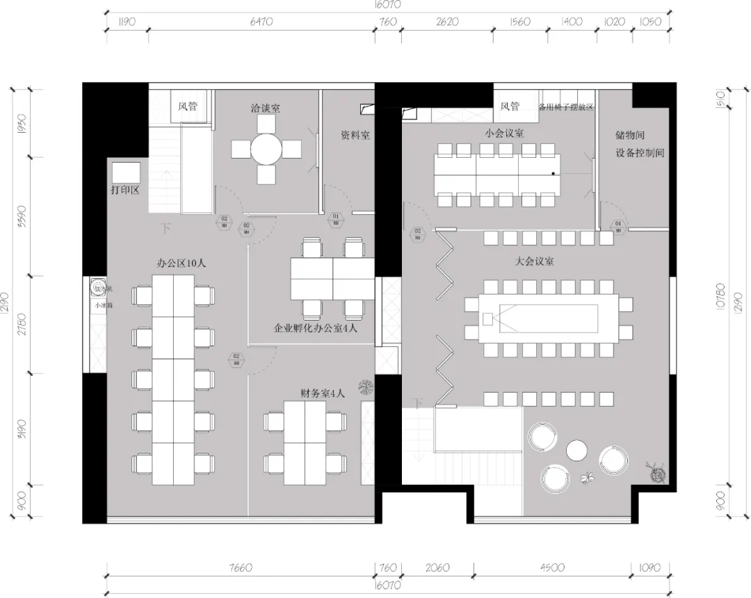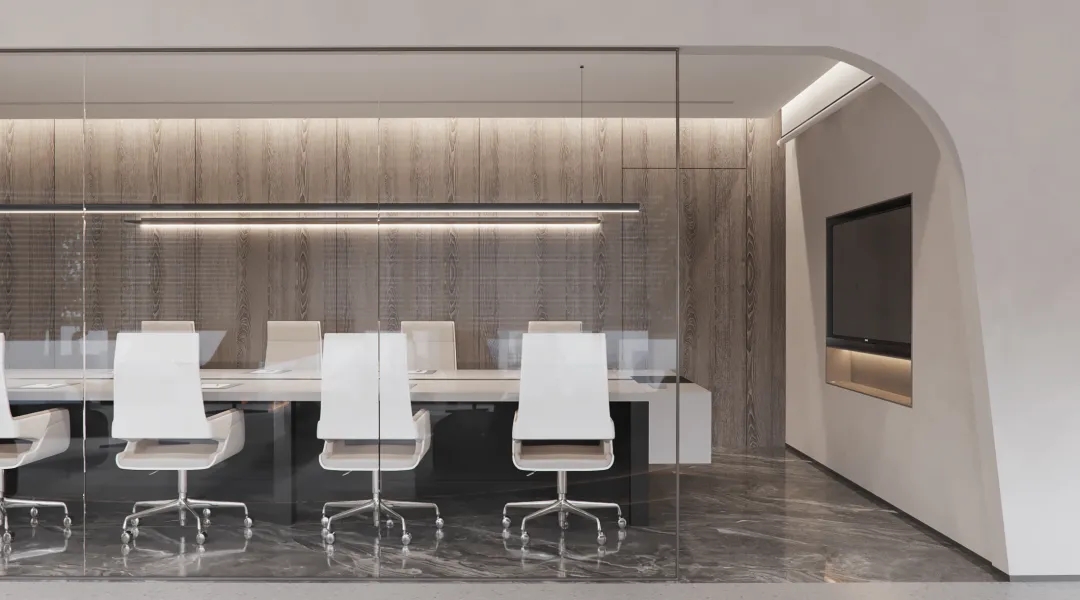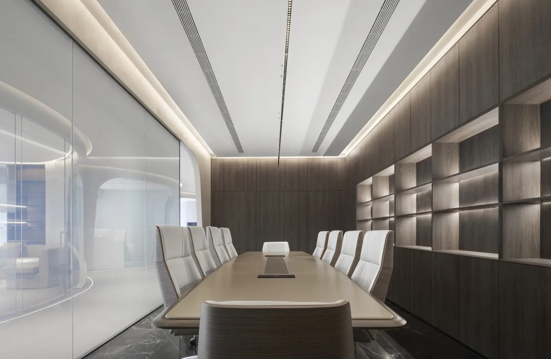 大会议室在设计考量上对空间赋予了多重功能,折叠移门封闭的时候可作为大会议室使用,折叠移门打开的时候整个空间就变成了大的活动室,可以作为生日会、公司联欢等使用,作为一个休闲活动空间,极大增加的空间的利用率。