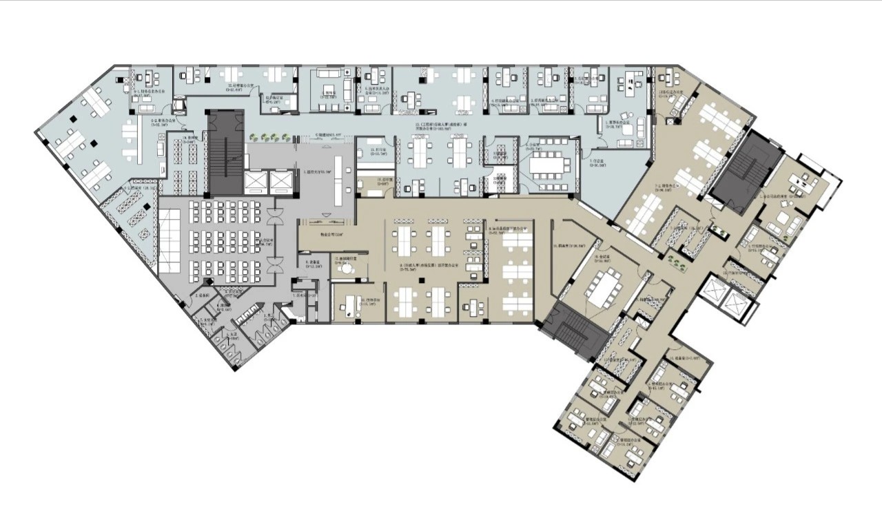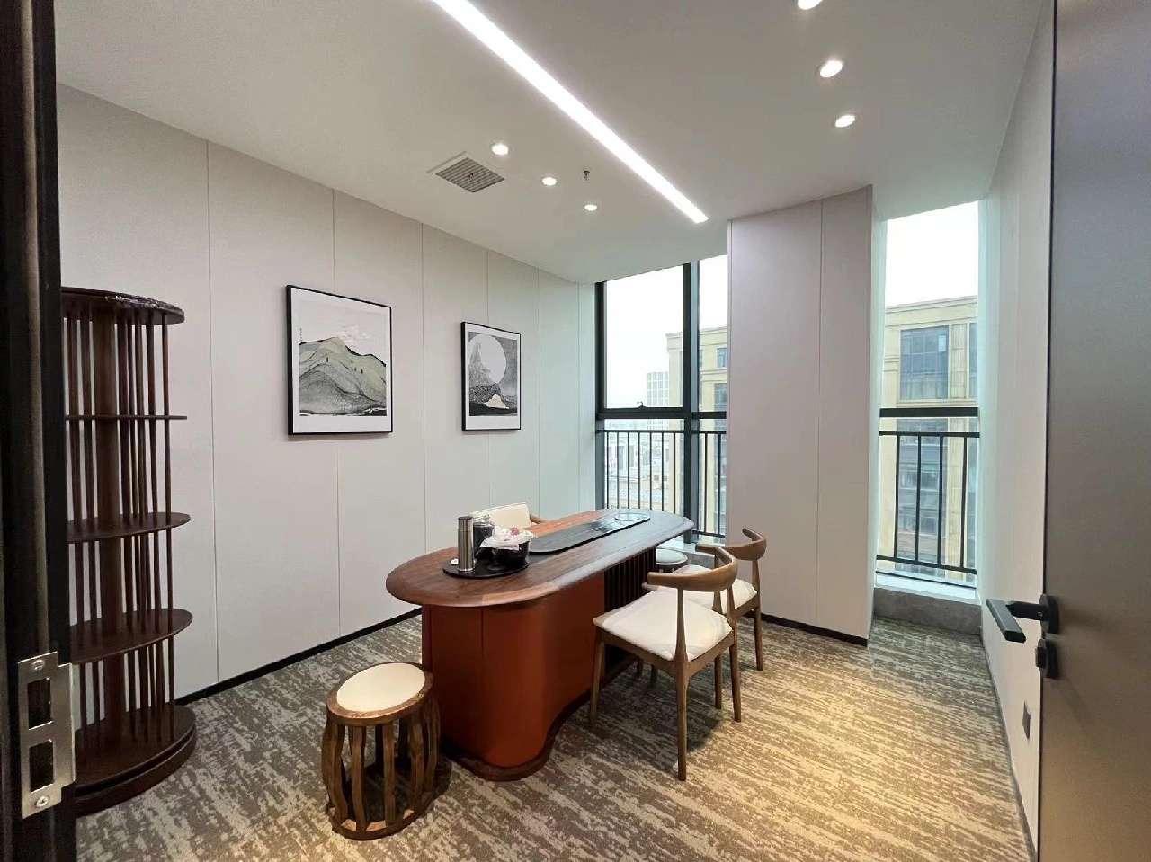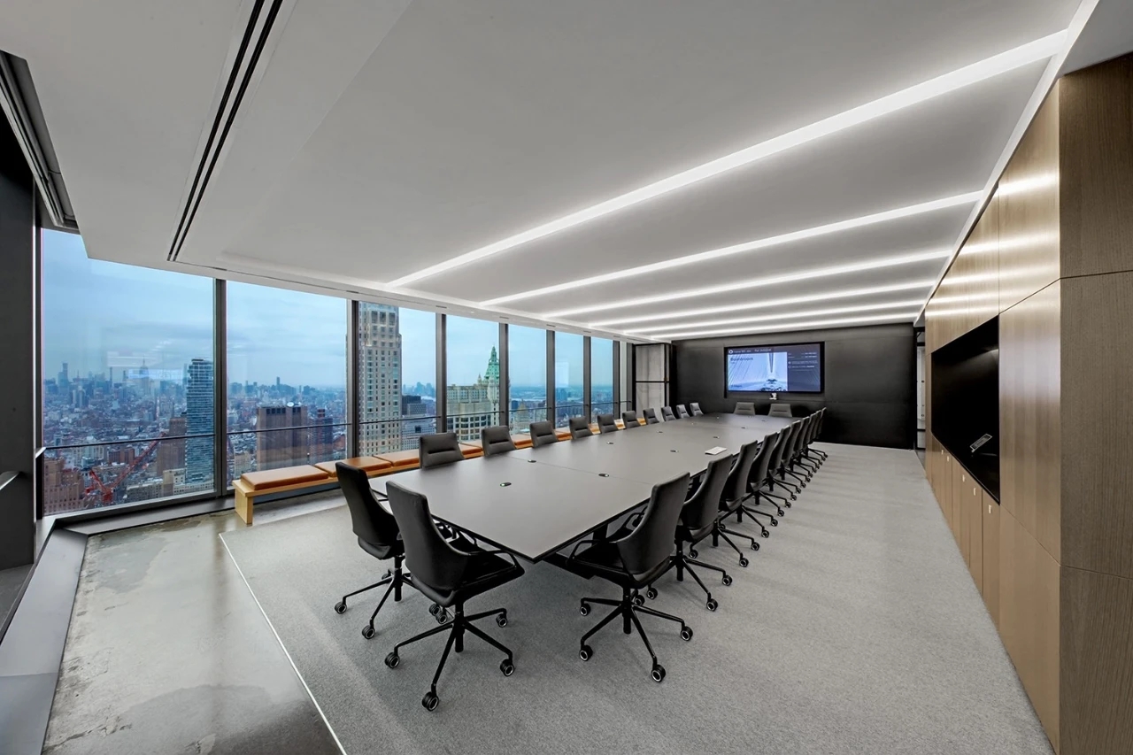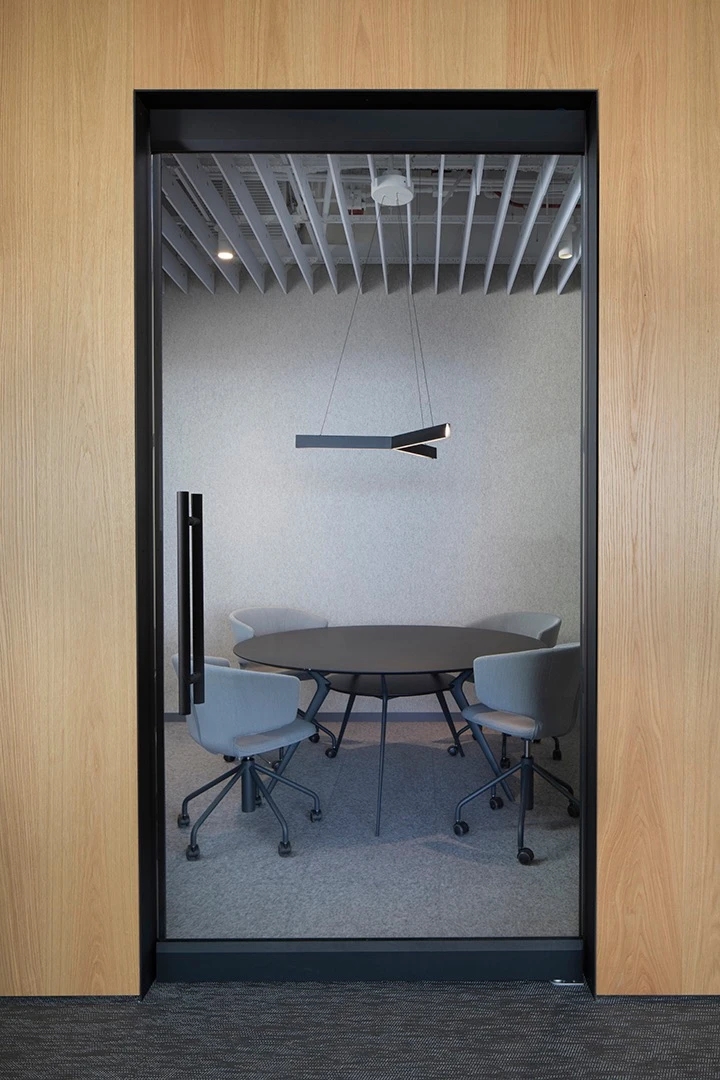 员工会议室以黑白的单色调为主,空间整个都很简洁,空间的照明也是以灯条打造简约空间。董事会议室加入木饰面的墙面装饰,为空间增加舒适温暖的氛围。