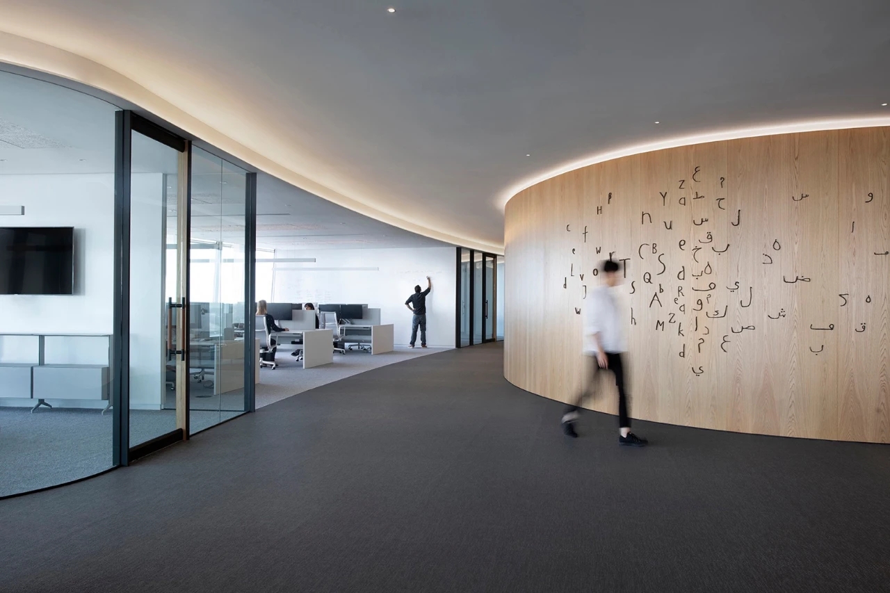 设计师将玻璃以各种不同的形态加以独特利用,营造了灵动式的空间视觉与触觉的体验,顶部灰镜拉伸了空间的纵向比例,呈现的反射也带入了城市的光影变换,光线成为了空间秩序的一部分。空间中绿植点缀,将生机勃勃和商务办公完美结合,感性和理性彼此交融、绿色与光影相映成趣。