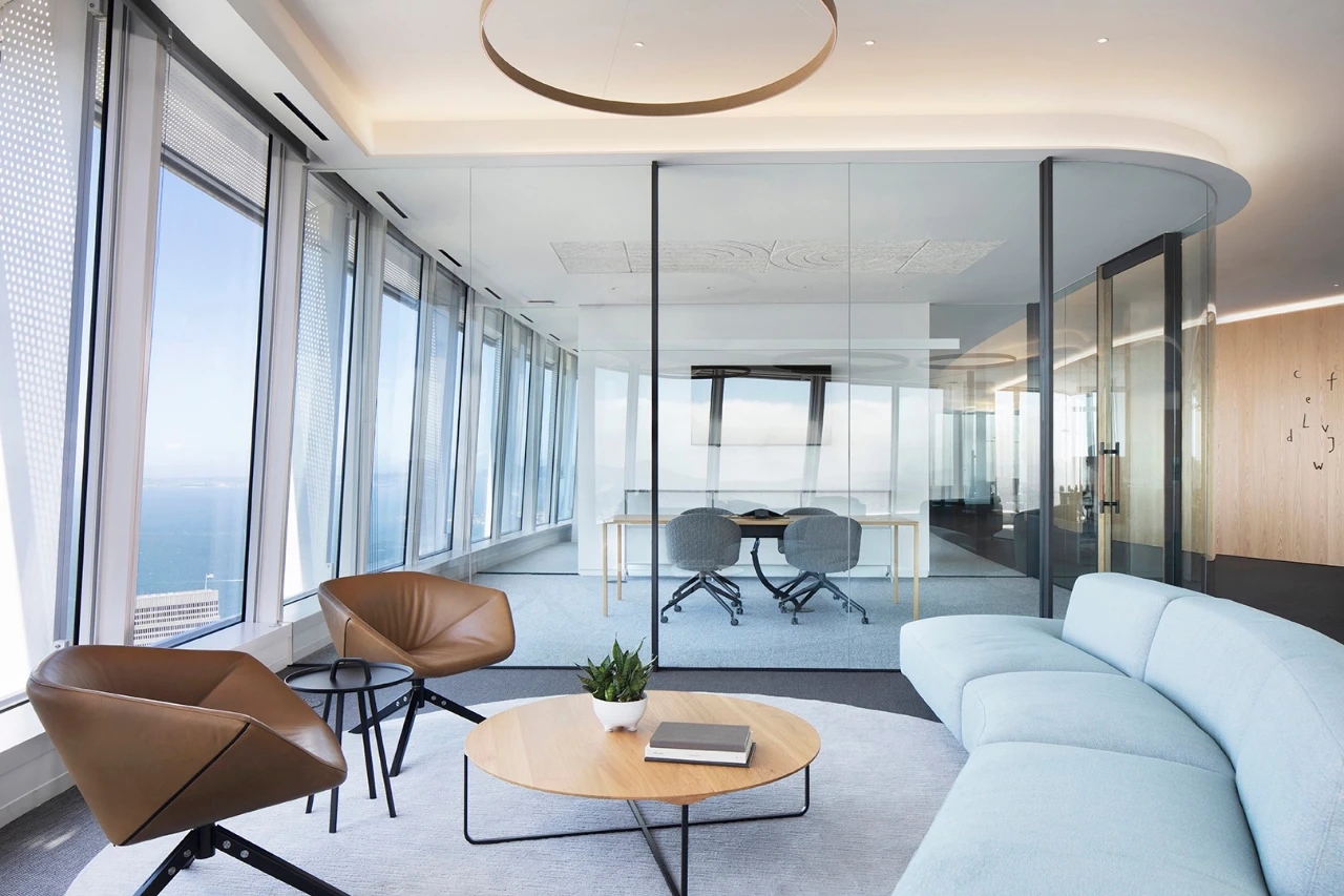 前台接待以皮质沙发来打造空间的质感,周围的窗户,会议室玻璃隔断等,都传达了空间的通透感,让人心旷神怡。