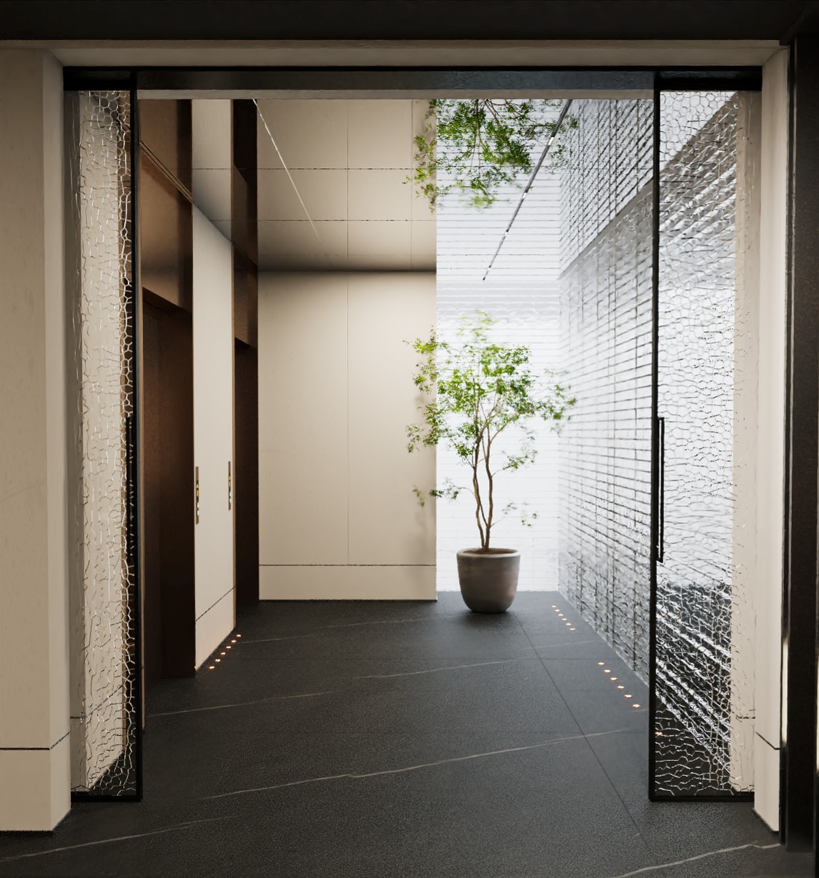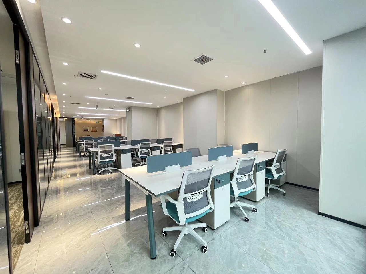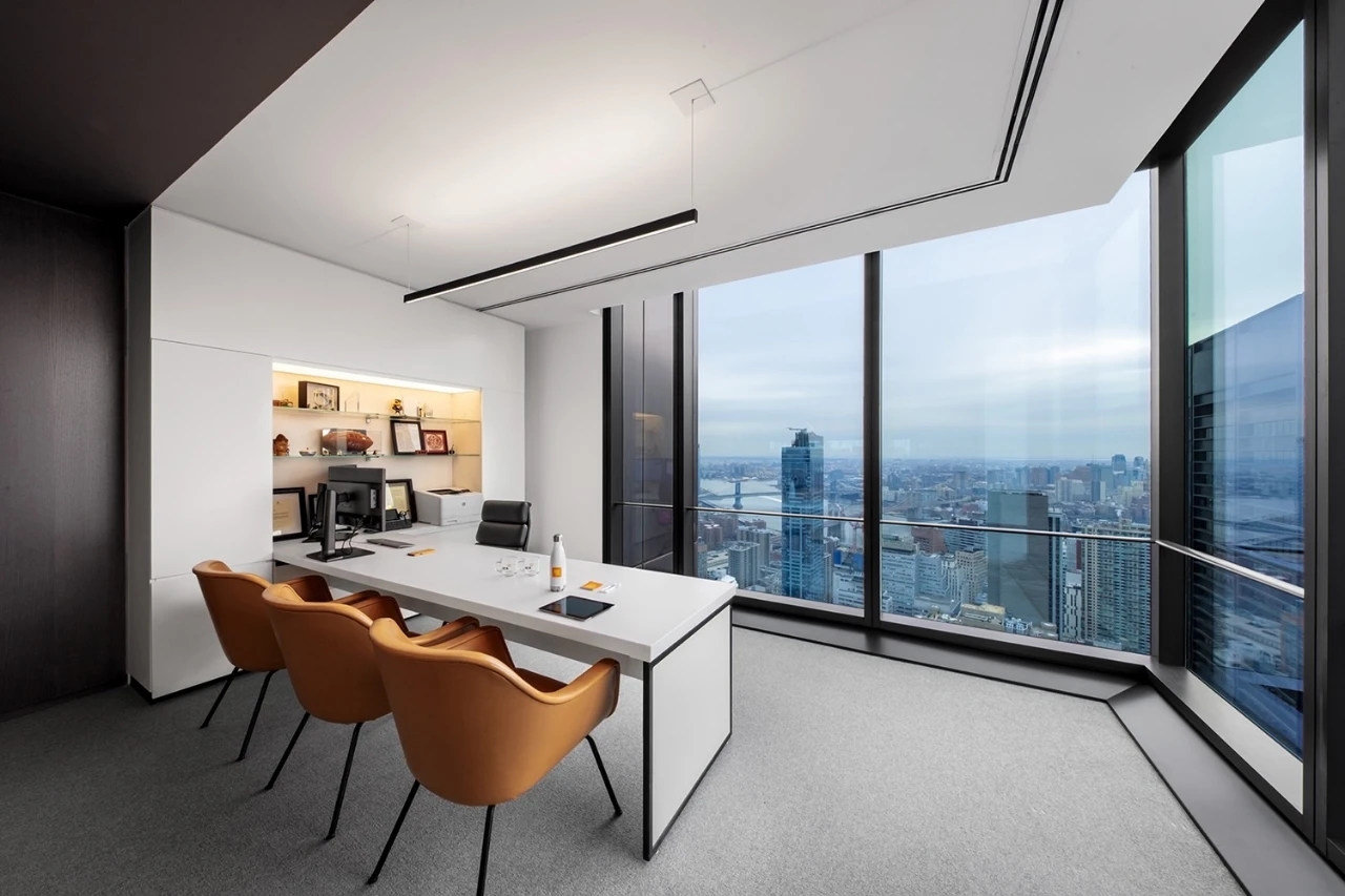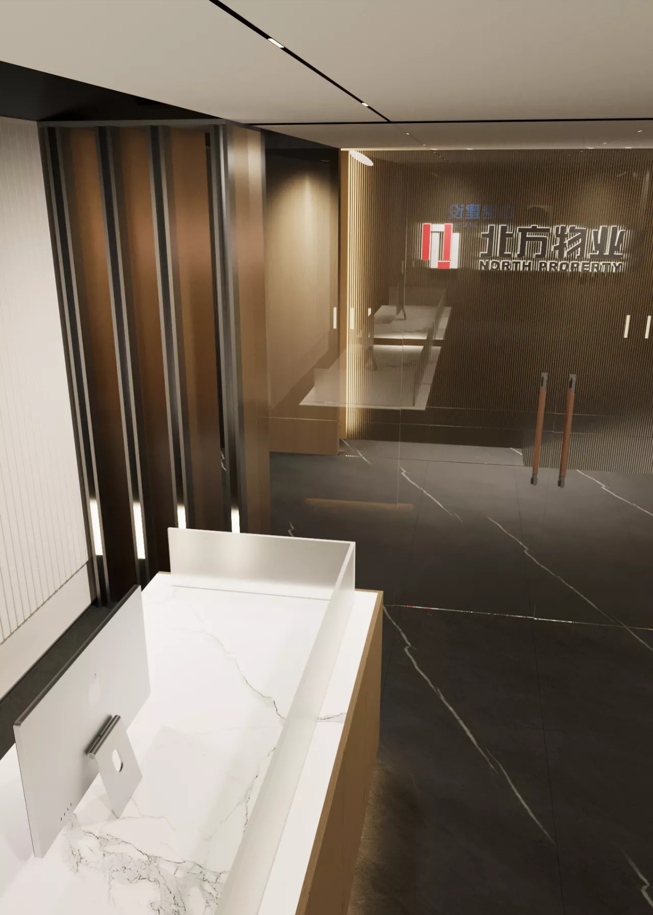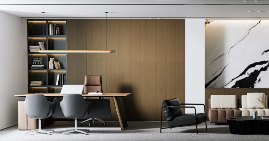 接待大厅背景墙通过竖向线条与简约的灯光设计搭配,营造简洁明净的感受,大理石与木饰面组成的接待台,完美匹配现代办公新模式。内凹处的绿植摆件有着接待的暗示,无人的空间状态下,也在安静的阐述了空间礼貌与谦逊。边界内外,通透玻璃元素和柔和的照明,打造均匀、敞亮的环境,似乎在通过这些空间语言,来实现空间与人的对话。