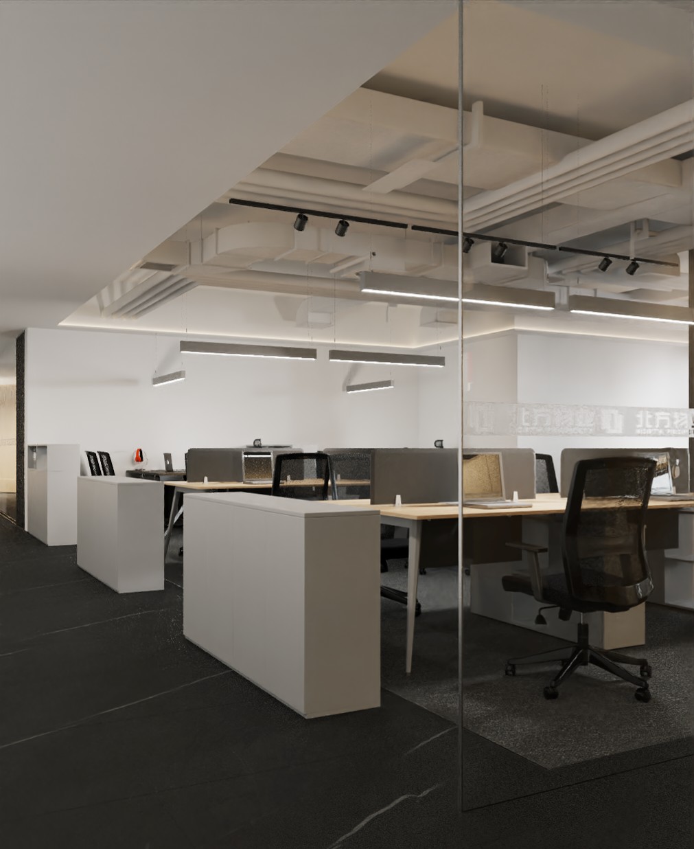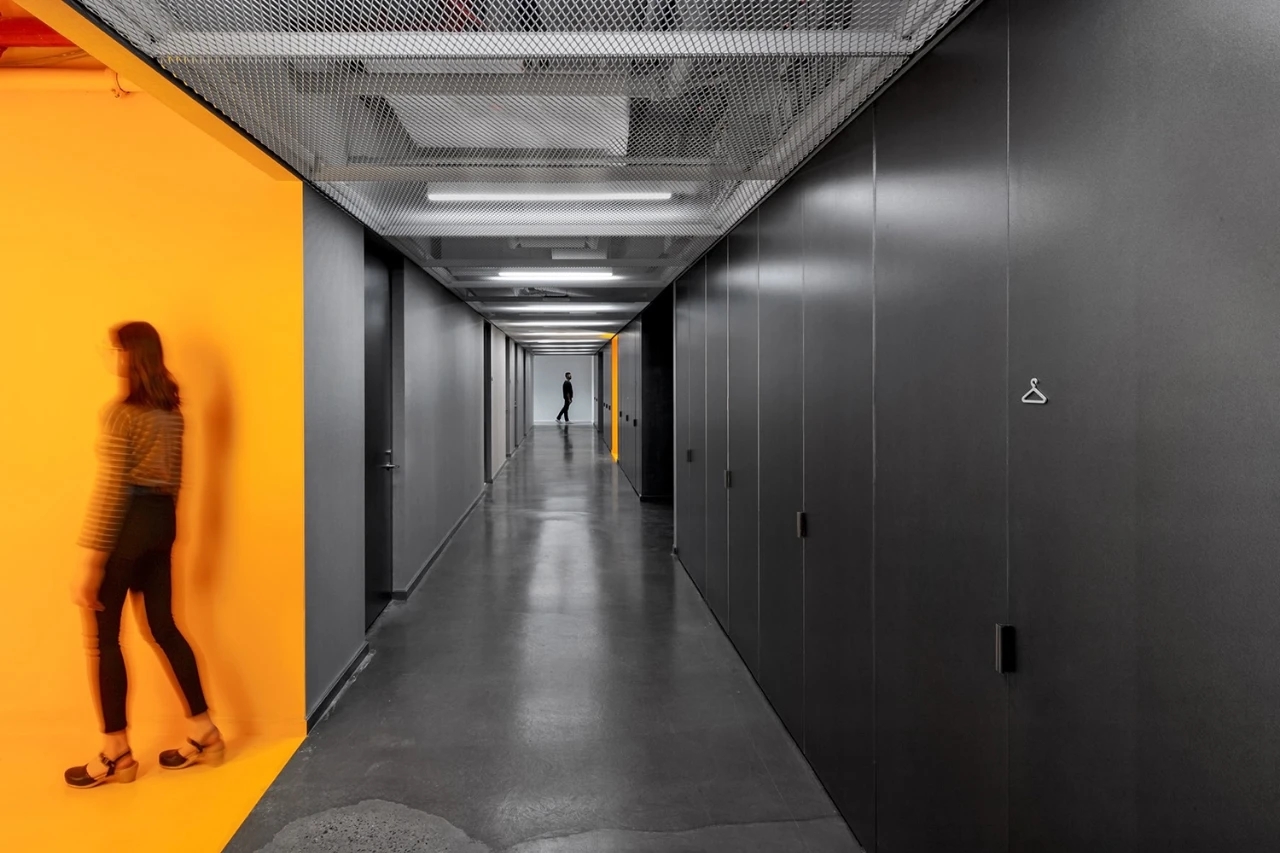 坐走廊也是以黑白的简约色系为主,与前台接待的天花形成黑白色的视觉对比。走廊以白色金属网的天花为主,地面以灰色调为主,局部加入橙色来凸显空间。