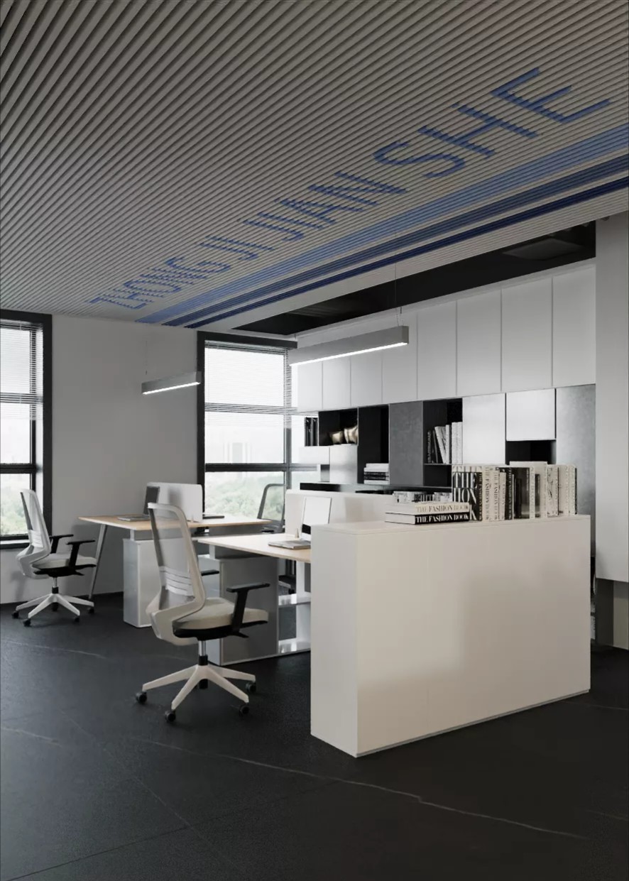 接待区以独特的前台造型以及墙面黑的的烤漆板、天花以金属网吊顶为主打造不同氛围的办公空间,进入眼帘的就是窗外开阔的风景视眼。