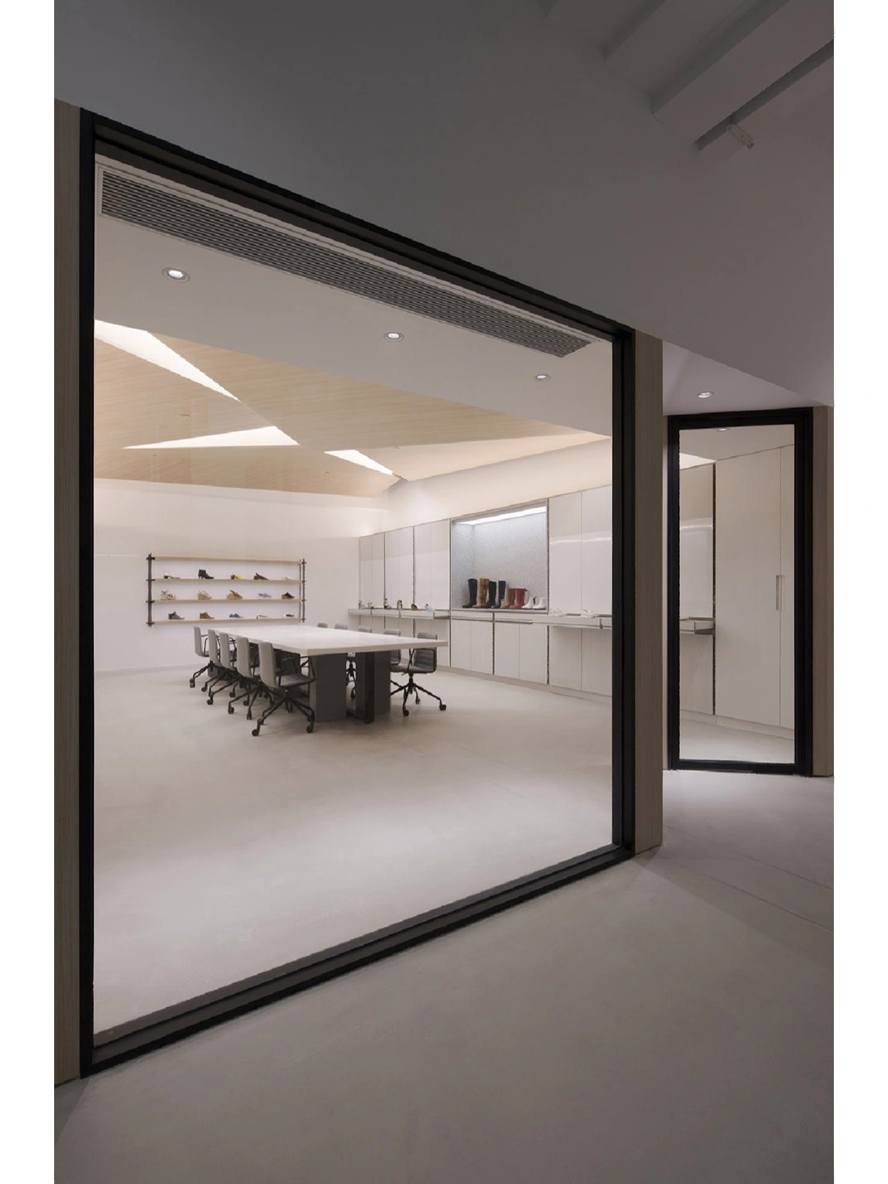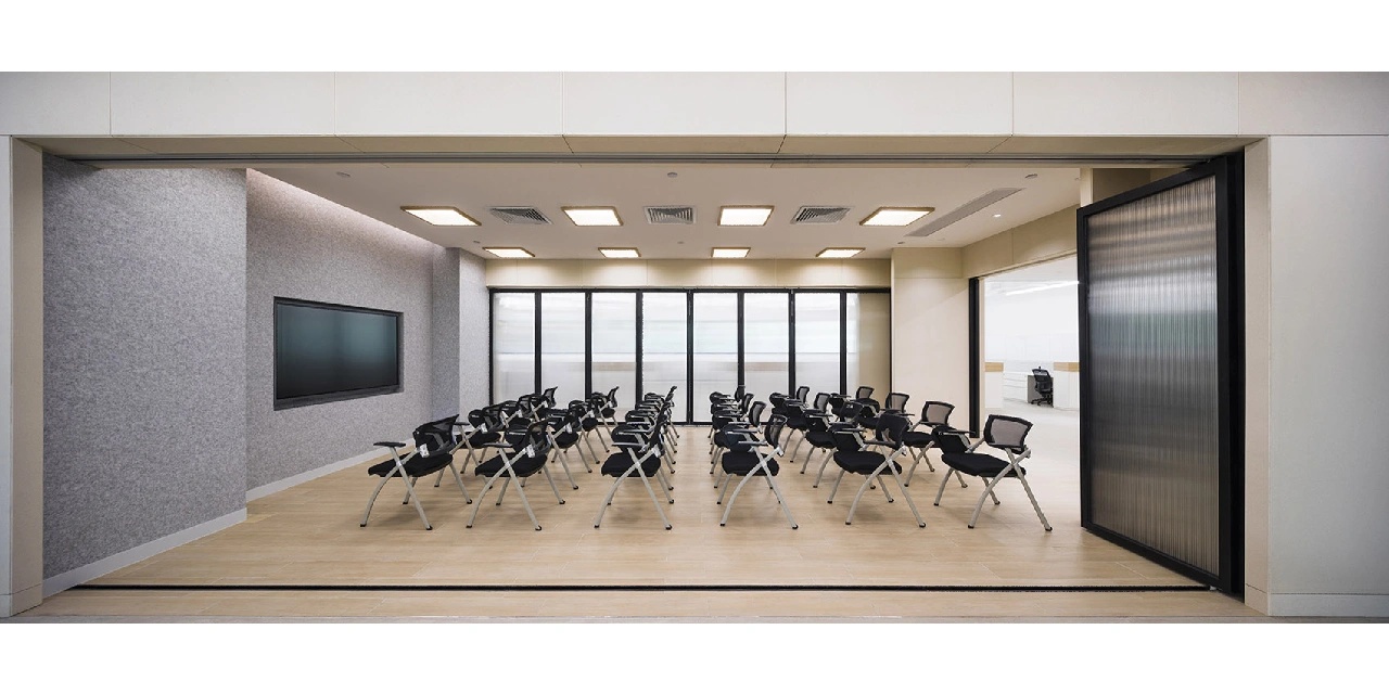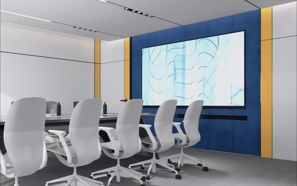 会议室内,设计师大胆运用线条,天花、墙面、地毯均辅之以黑色线条元素,在视觉上延伸了整个空间,层次更丰富,简约而时尚。