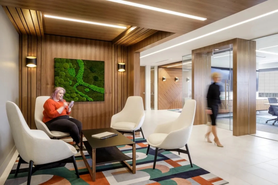 LRS 设计团队从 Ball Janik 强大的品牌和大胆的标语“精品服务 |高耸的能力”通过创造一个强大的设计故事来承载空间。标题为“走进树林”的设计大胆而现代,采用中性色调、温暖的胡桃木以意想不到的方式应用和细节,以及长凳和橱柜等独特元素。从实用对称的空间功能布局到丰富温暖的胡桃木镶板、苔藓墙艺术特色和大地色调,自然主题在整个空间中荡漾。大堂和休息室的分层板条装饰强调了乐趣的注入和色彩的飞溅,以突出空间。从材料到风格,每一个设计元素都体现了 Ball Janik 以人为本的方法。