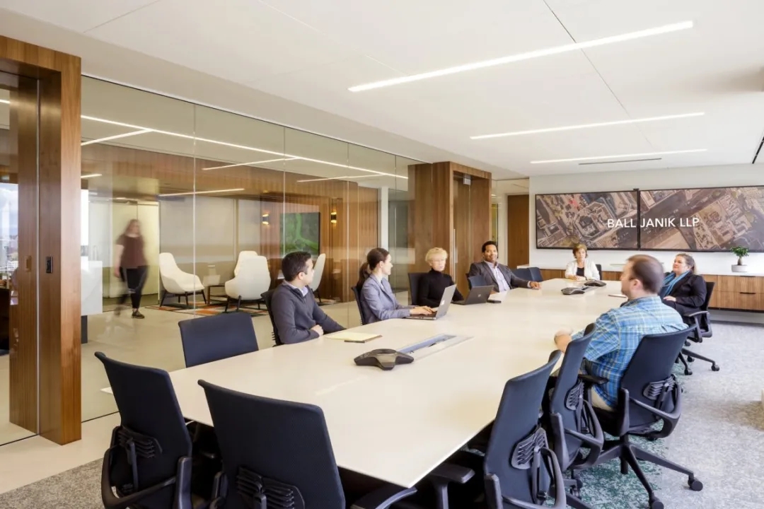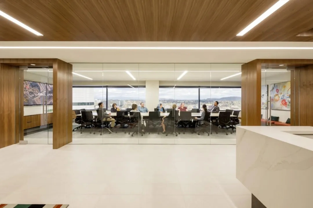 Ball Janik 希望将自己与更传统的律师事务所竞争对手区分开来。LRS 团队通过策划设计元素来实现这一目标,例如在办公室边缘加入高水平的透明度、精心制作细微的细节、消除办公室间沟通的障碍,以及最大限度地增加楼板内部的日光。创建景观走廊是为了捕捉威拉米特河、分散的城市桥梁和胡德山的景色。在传统的律师事务所中,角落景观是为律师事务所的更多精英成员保留的;在 Ball Janik,这些区域为任何成员提供座位,可用于个人喘息或即兴对话。大型 relites 允许日光穿透办公室,并将光线带入主要流通通道。私人办公室在功能上是传统的,但打破了大多数律师事务所中传统的等级办公室规模的模式,采用一种适合所有人的规模。