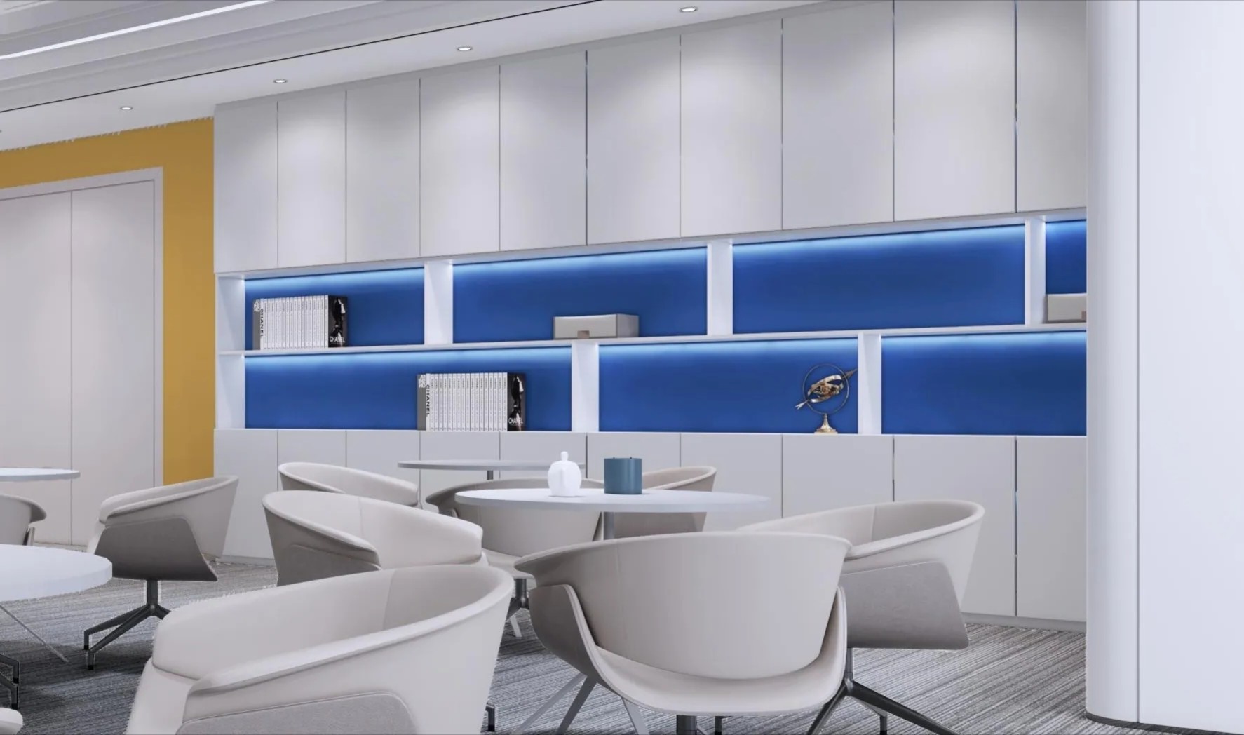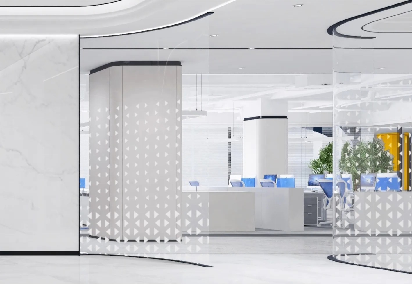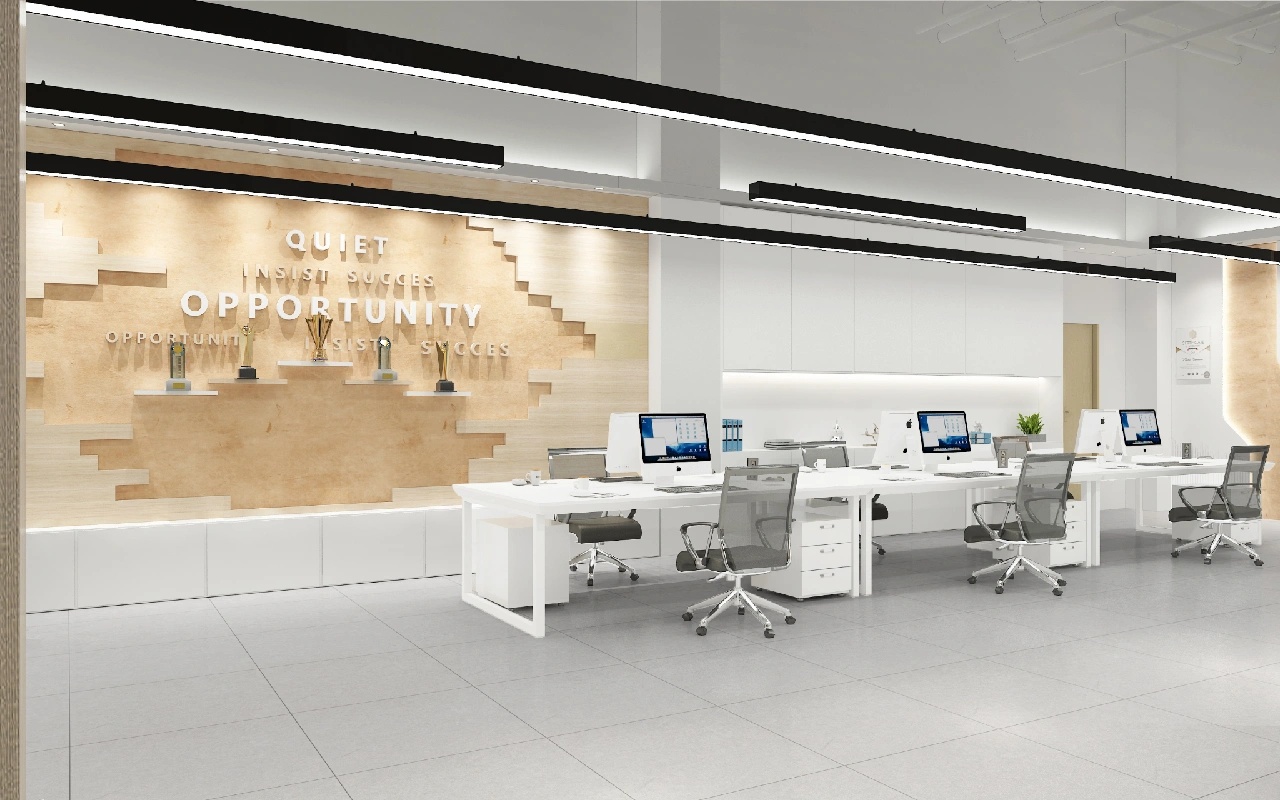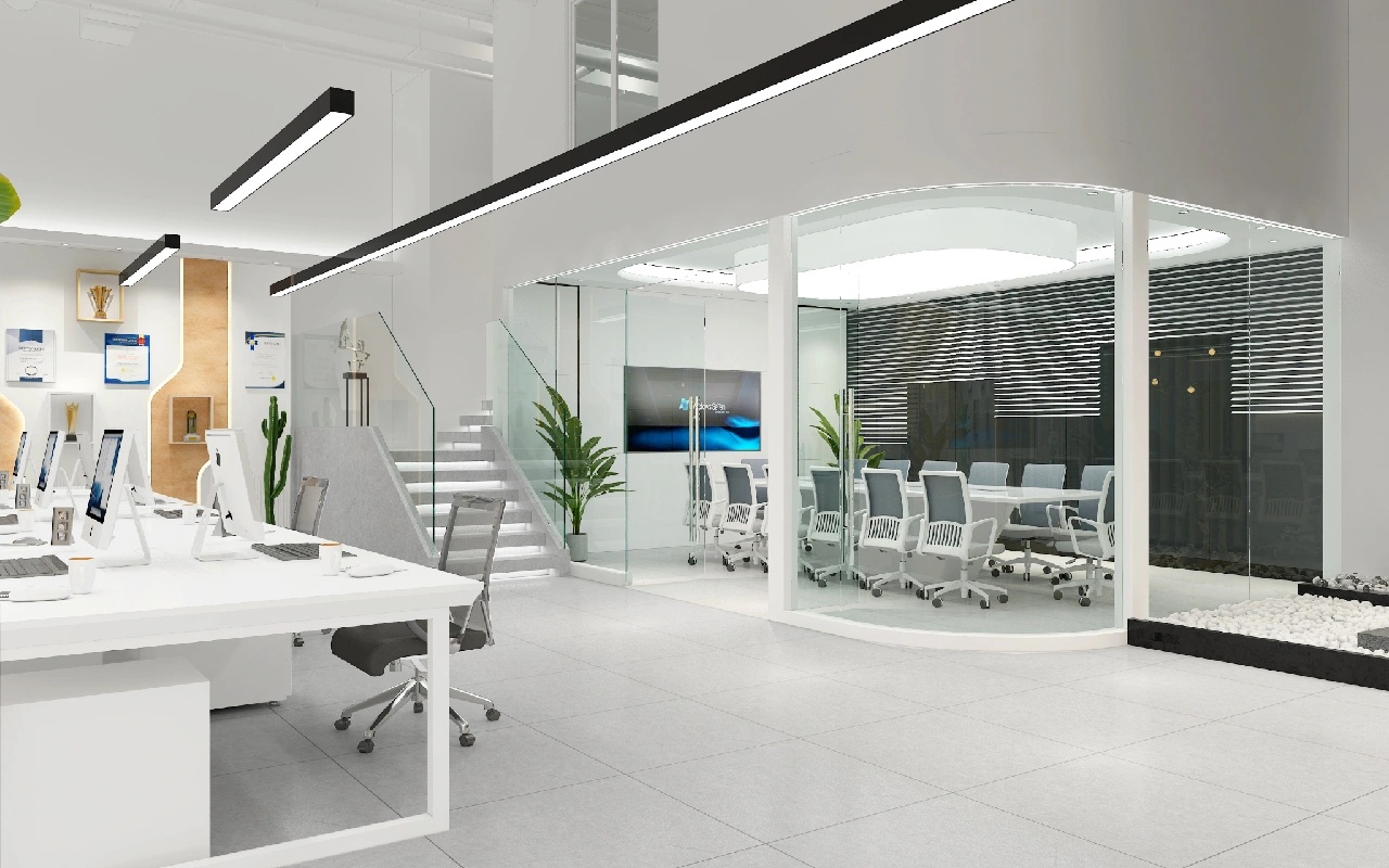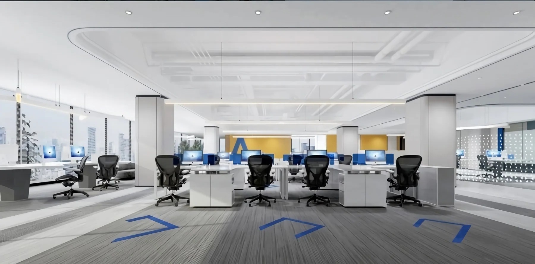开放办公区域作为整体员工工作区域,保证员工舒适性,提高工作效率,以黑白灰点缀蓝黄色,白色灯条照明,墙面没有过多的造型,空间充满秩序感与和谐氛围。