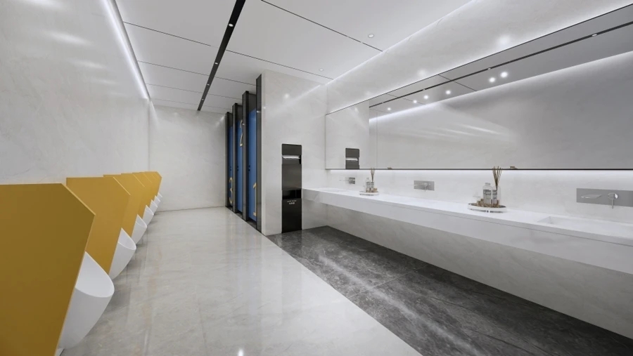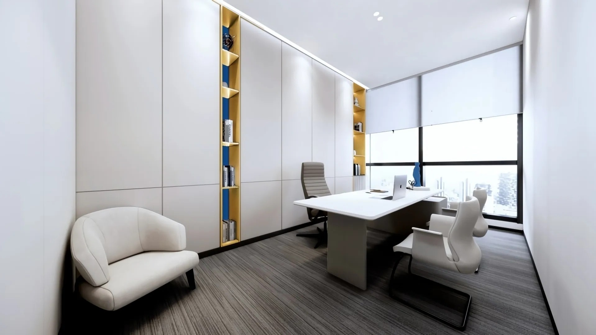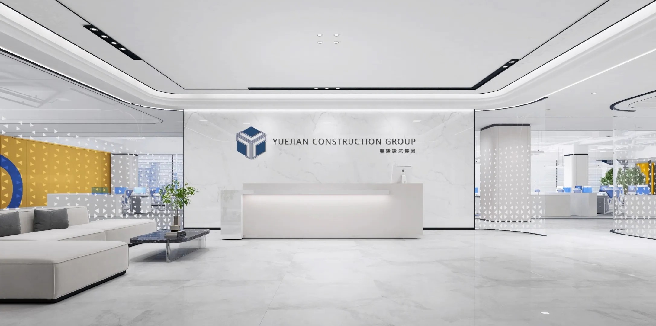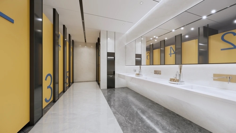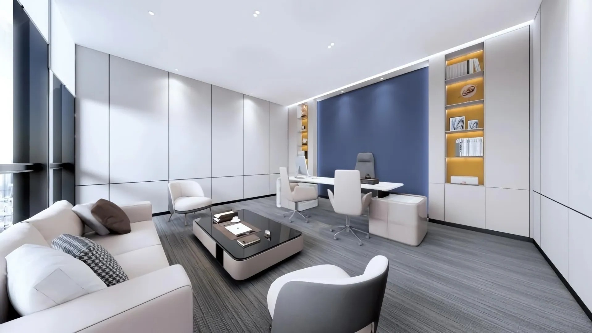 开放办公区域作为整体员工工作区域,保证员工舒适性,提高工作效率,以黑白灰点缀蓝黄色,白色灯条照明,墙面没有过多的造型,空间充满秩序感与和谐氛围。