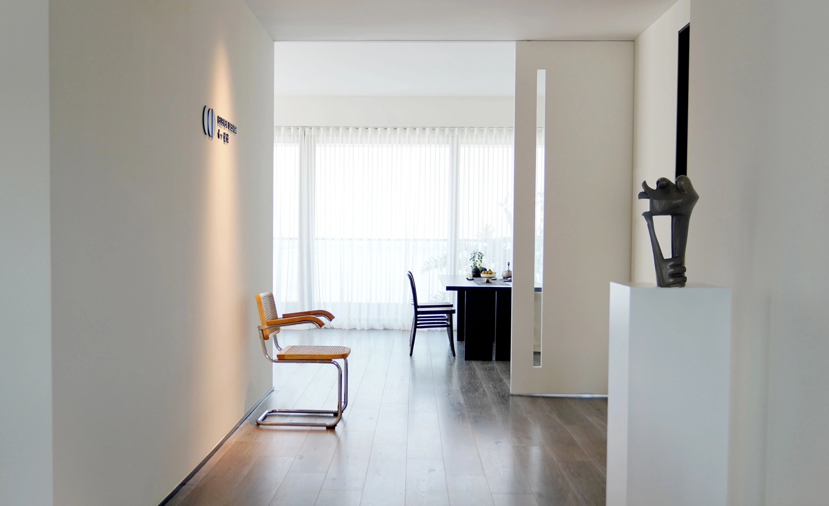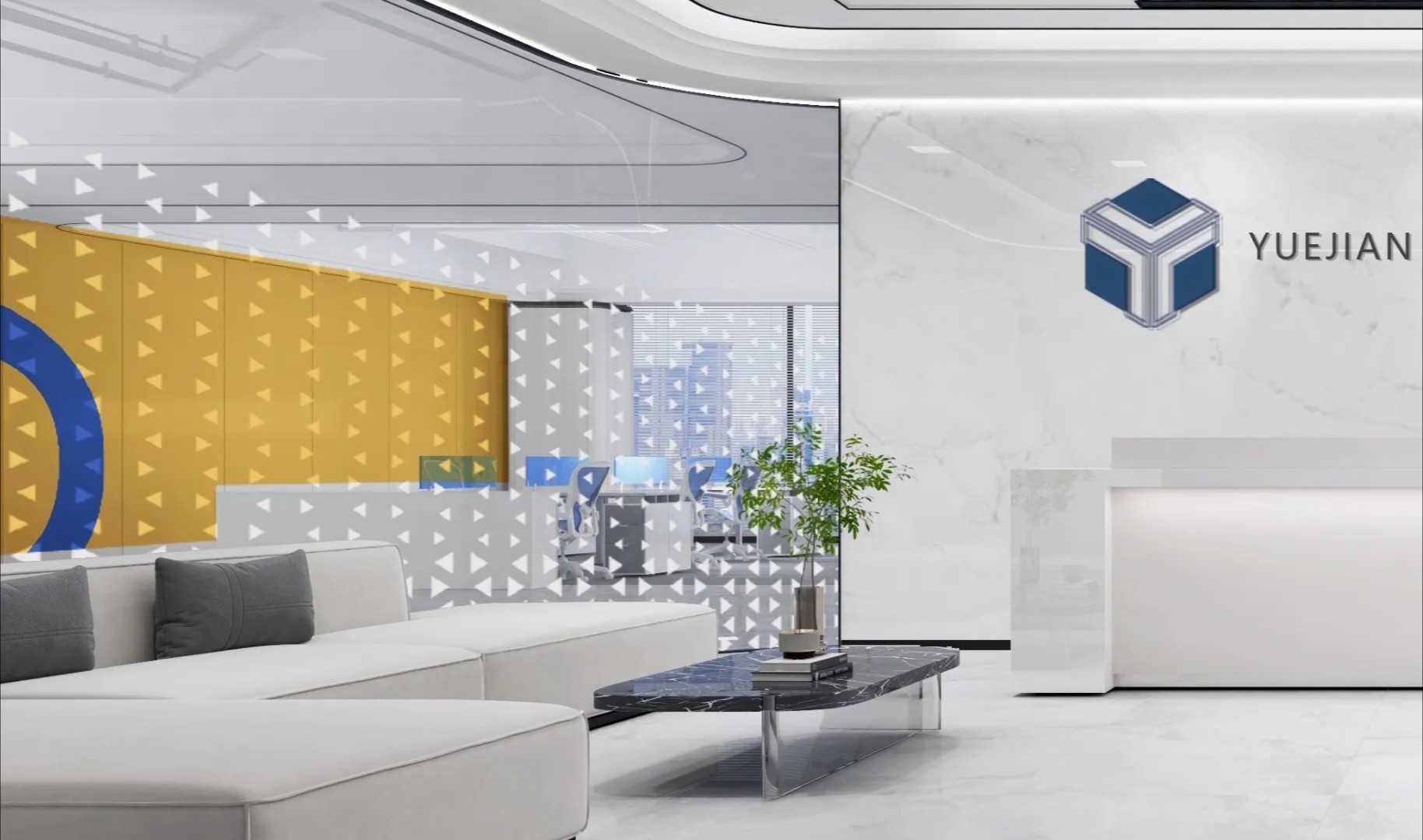 前台主打品牌色调与灰白色系的搭配组合,背景墙墙面以大理石艺术造型,整体简约大气且现代时尚。因科技有限公司垂直人群为多元化群体,所以设计师在前厅这一块体现出国际化和高端的流线型空间。