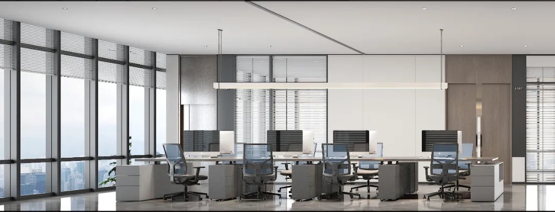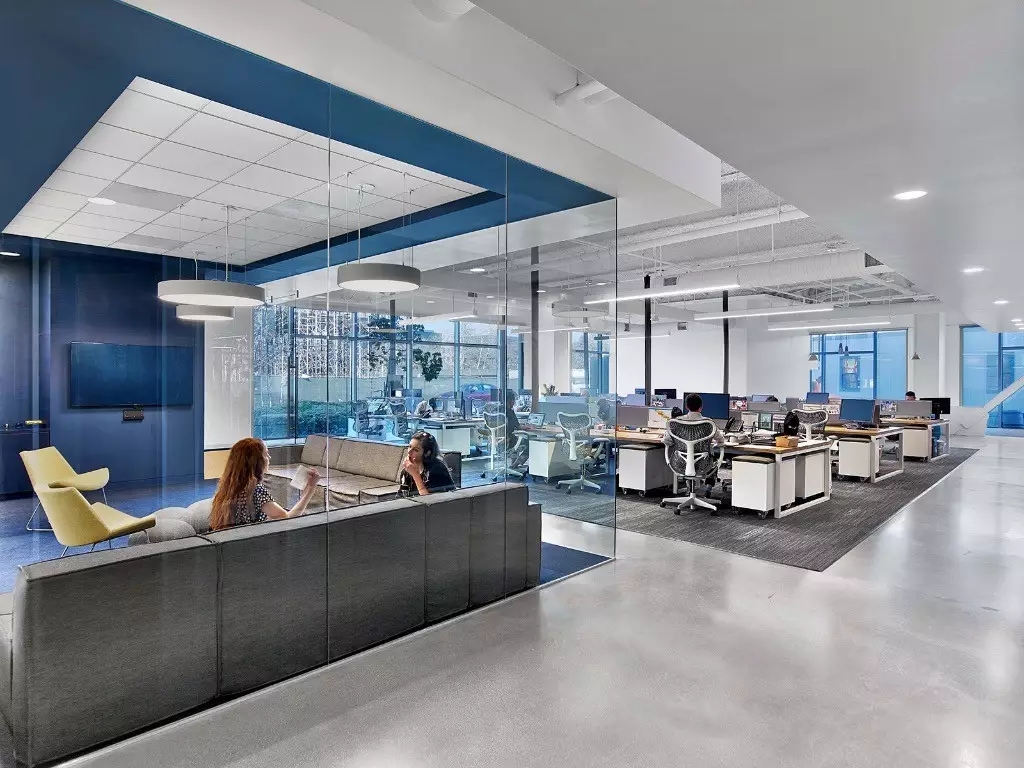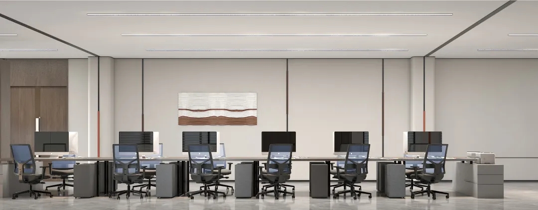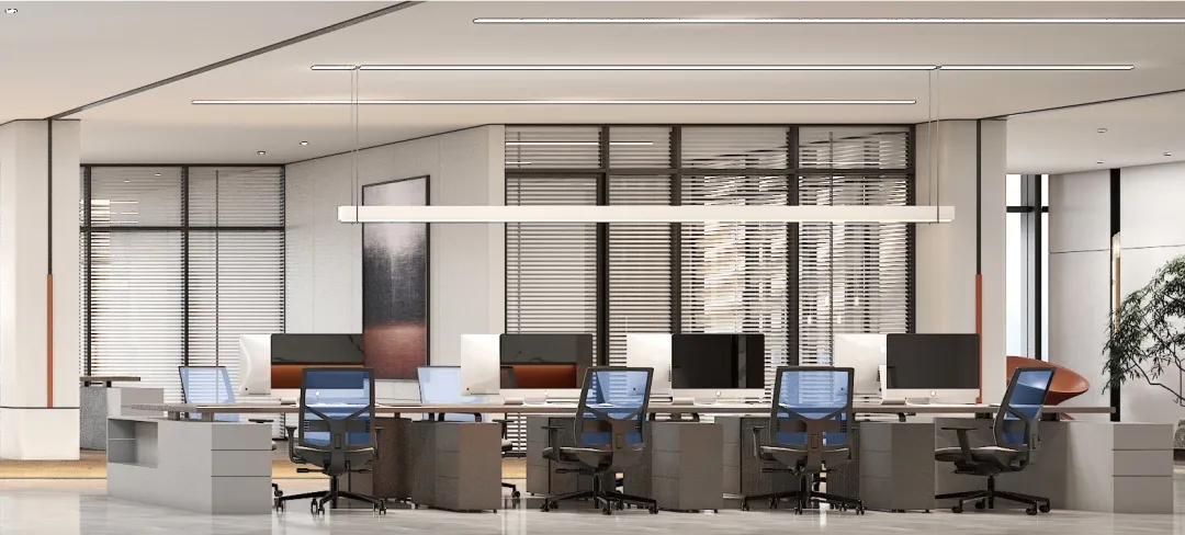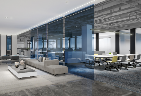 线性的工作空间,由玻璃隔断,灯带映射形成千万线条,交相呼应。物体曲面弧度的表达和硬朗的质地打造出异常和谐的氛围,而玻璃和灯带的结合,突破科技与自然,虚拟与现实,时间与空间,呈现出一幅别开生面的办公新业态。