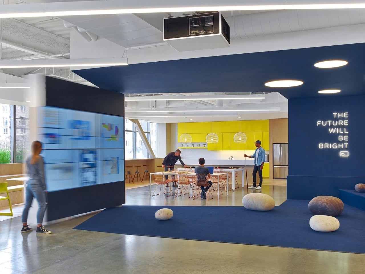 功能包括大型和小型编辑室,一个“广播”式会议室,配有六个大型显示器网格,可显示内容,以及大型突破性房间。 厨房作为多功能区域:接待和社交聚会场所,并向大型广播室开放,使监视器能够向更广泛的观众开放。