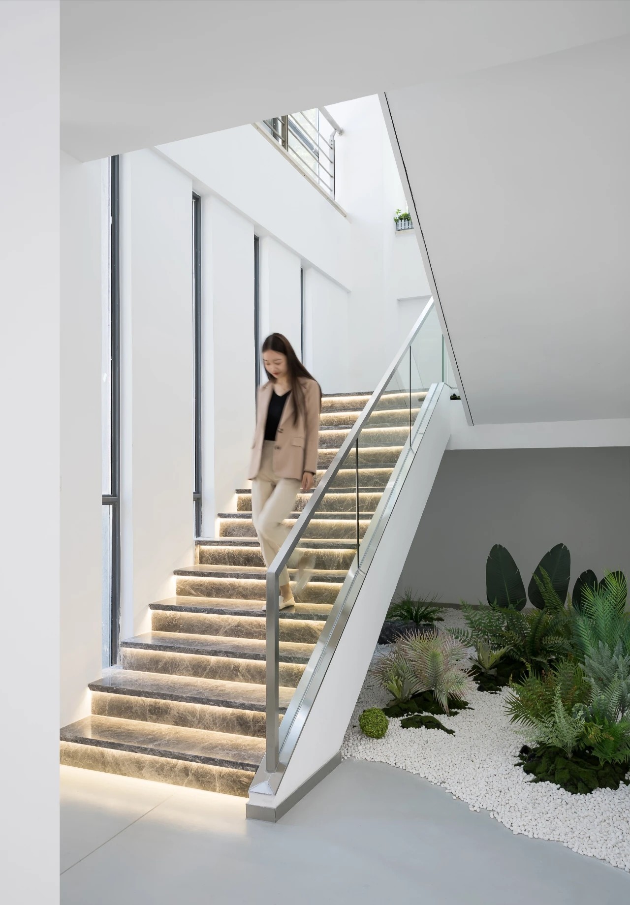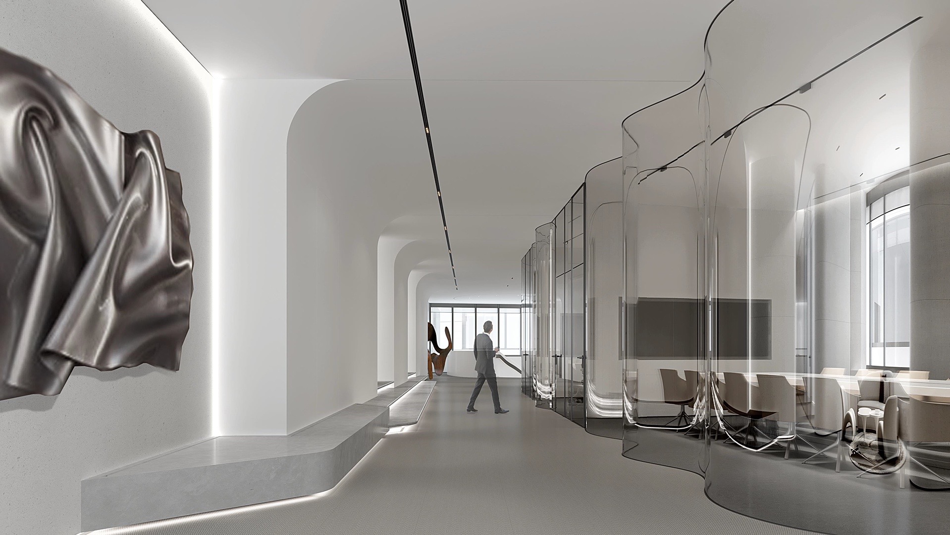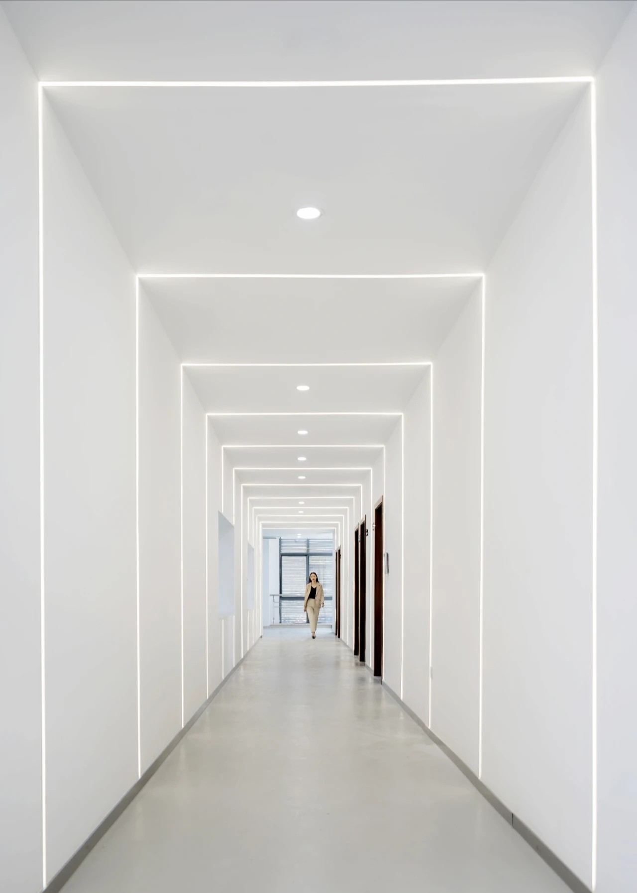 笔直的长廊,以光线分割出空间,营造出递进感。智能感应灯带,将科技感和雄鹰展翅的向上理念,深深渗透在设计之中,给普通的廊道增添了一抹别致的视觉韵味。光线在空间内自由流动,毫不压抑,十分通透且有未来感。