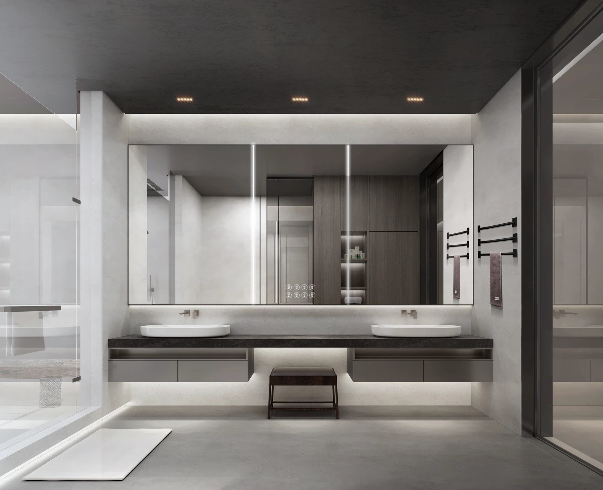 由前台接待区至体验区,银色的灯带伴随着透明的电动雾化玻璃,以动衬静,将空间动态起来。大量的玻璃镜和烤漆铝板墙面,在感应过道灯的银辉下,反射出高级感。银色元素和灯光配合,凭借最直观的方式塑造简约形象。