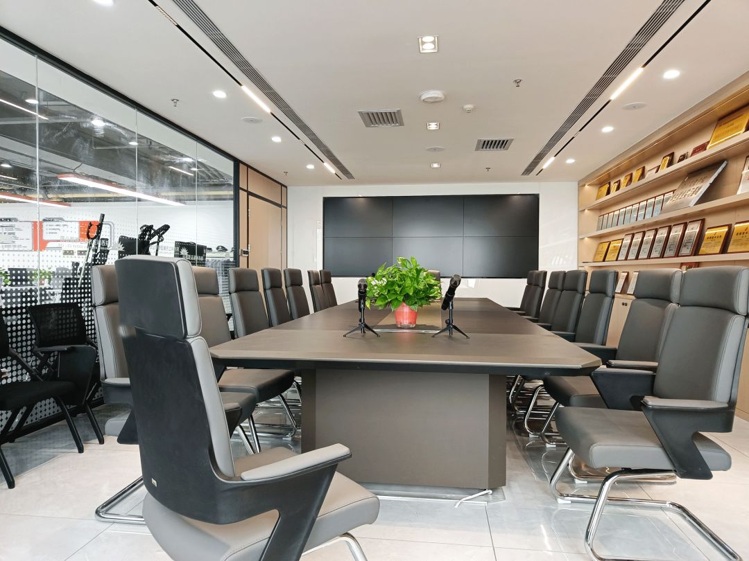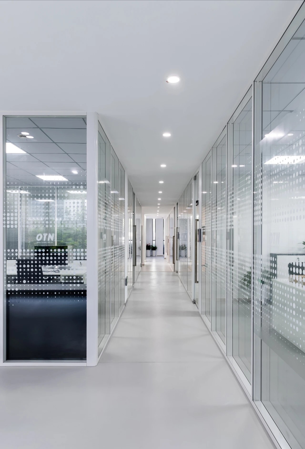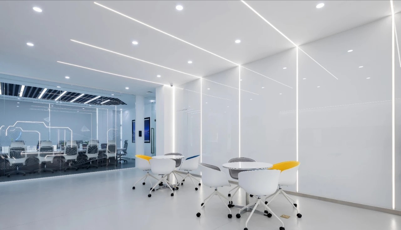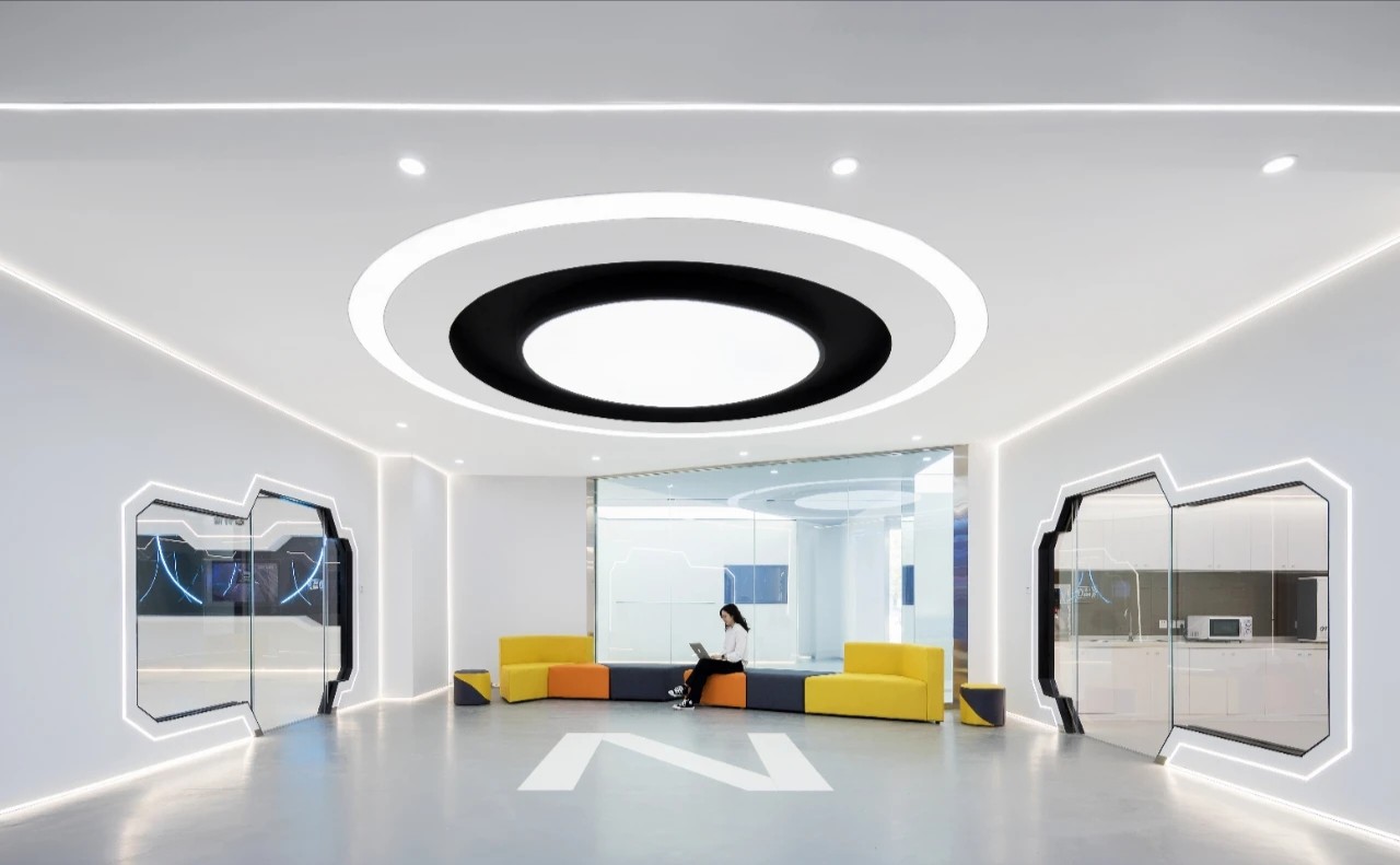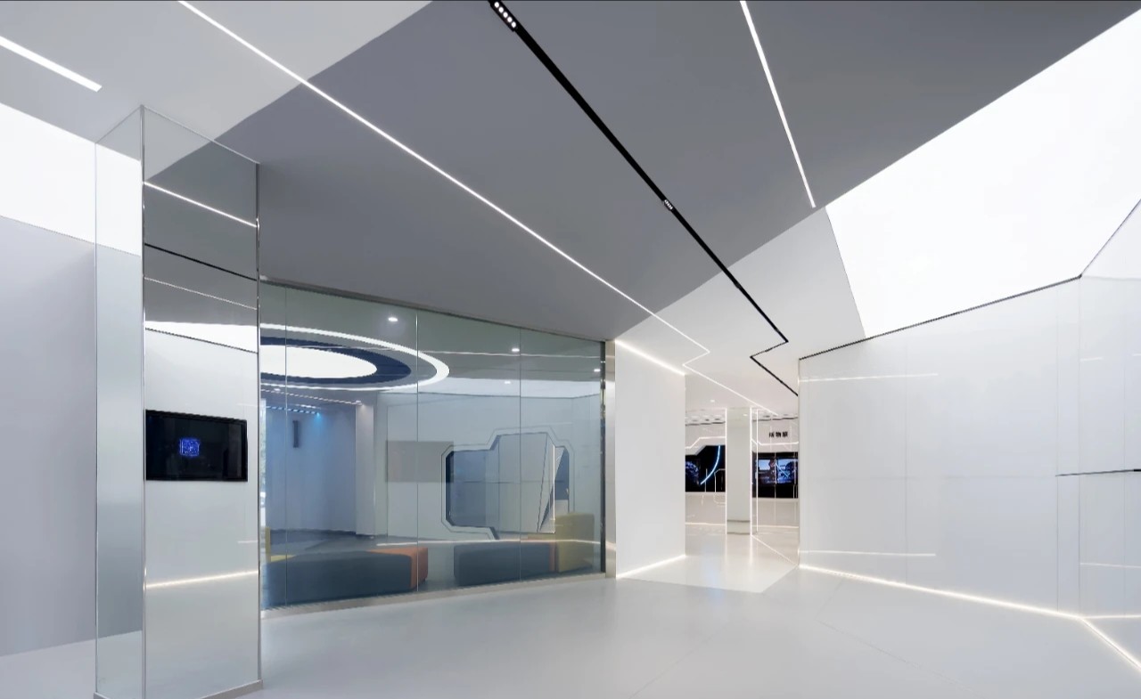 从体验感和使用感来看,OTN智能科技的办公空间,像是一艘蓄势待发的宇宙科技飞船,使用了PVC、不锈钢、雾化玻璃、白色烤漆玻璃、烤漆铝板、线型灯、人造石等材料,整个风格充满了浓厚的科技感与智能感。