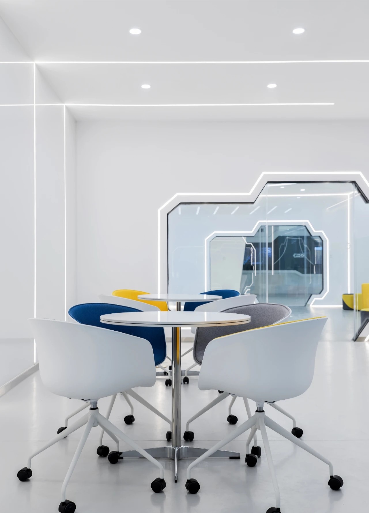 递进的银白灯带,将整体白色的空间划分出层次。黄色、灰色、蓝色的椅子,围靠在一起,使得空泛的空间有了鲜明的跳跃感。黑色的转椅齿轮,仿佛是太空漫步的启发。不远处的玻璃墙,以“透明和开放”为界,区分出休闲区与大会议室,达到既聚合又分离的状态。