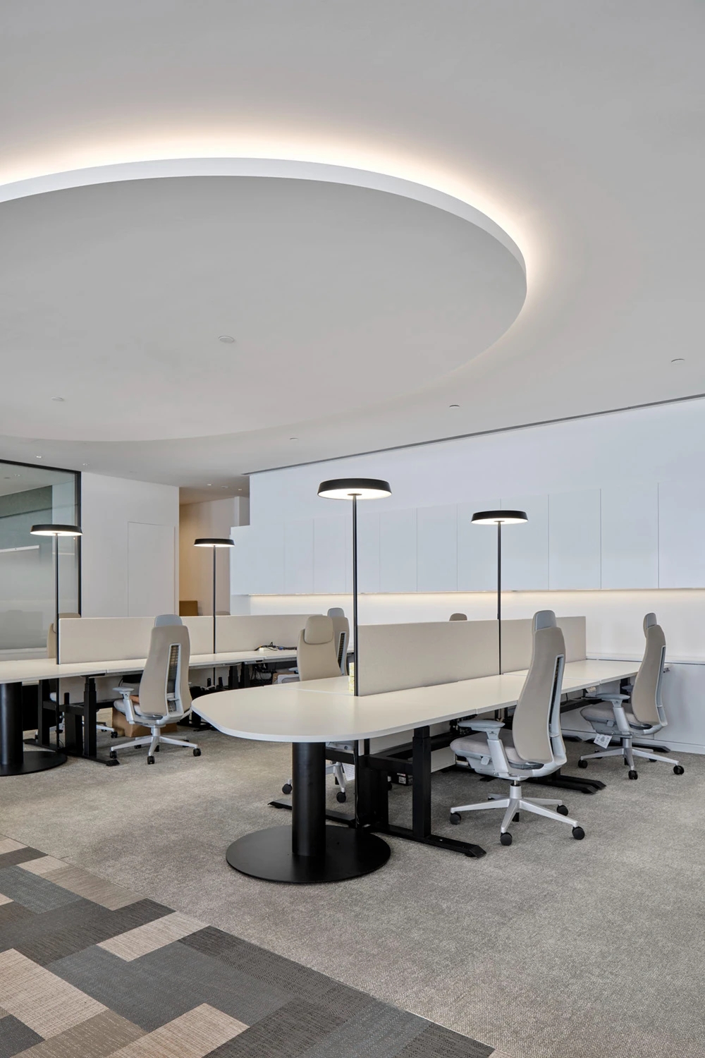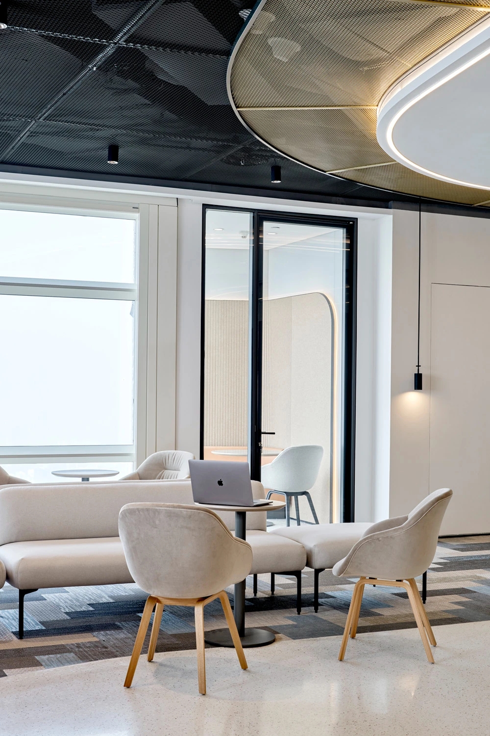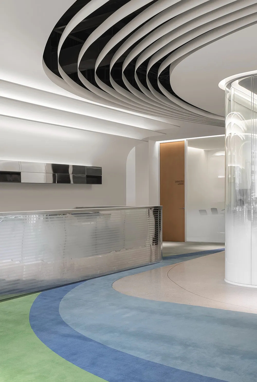 地面的设计与材质也呼应了天花的流线造型,嵌入铜线的水磨石与颜色柔和的块毯分割了办公区与公共走道的界限,它们以飘逸的姿态贯穿了整个场地,也让办公区域与休闲接待区有了柔和而自然的衔接。地毯覆盖的区域就像为人们营造出一个舒适且精致的岛屿。无论是独自工作与思考,抑或和同事进行头脑风暴,还是下午茶闲暇时的漫步,人们都能在这兼具共享与私人空间中感受到这是一间充满活力的办公空间。