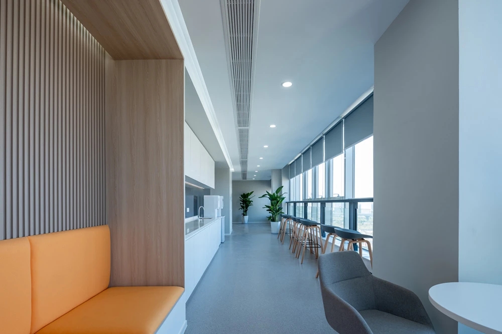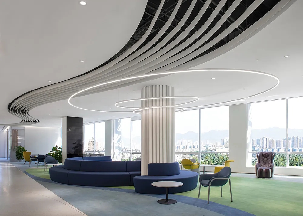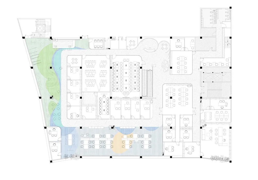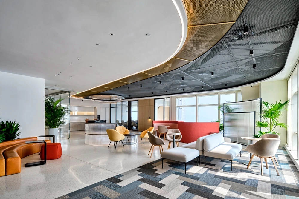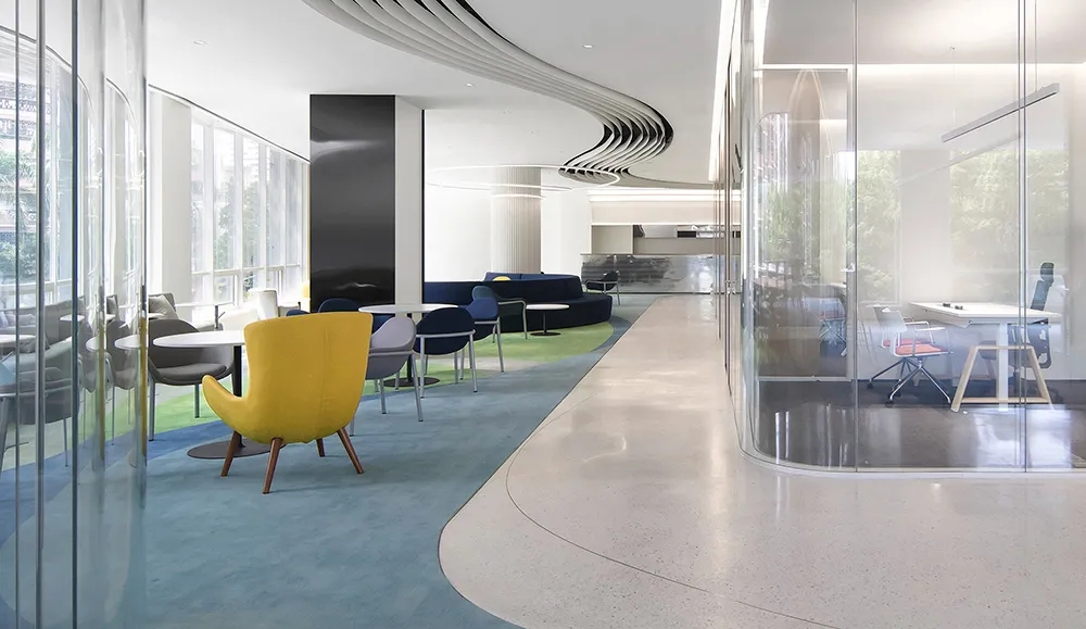 地面的设计与材质也呼应了天花的流线造型,嵌入铜线的水磨石与颜色柔和的块毯分割了办公区与公共走道的界限,它们以飘逸的姿态贯穿了整个场地,也让办公区域与休闲接待区有了柔和而自然的衔接。地毯覆盖的区域就像为人们营造出一个舒适且精致的岛屿。无论是独自工作与思考,抑或和同事进行头脑风暴,还是下午茶闲暇时的漫步,人们都能在这兼具共享与私人空间中感受到这是一间充满活力的办公空间。