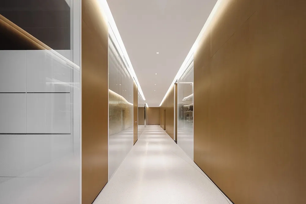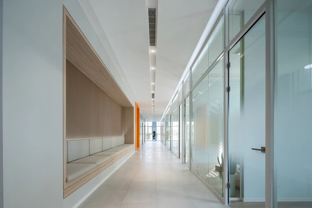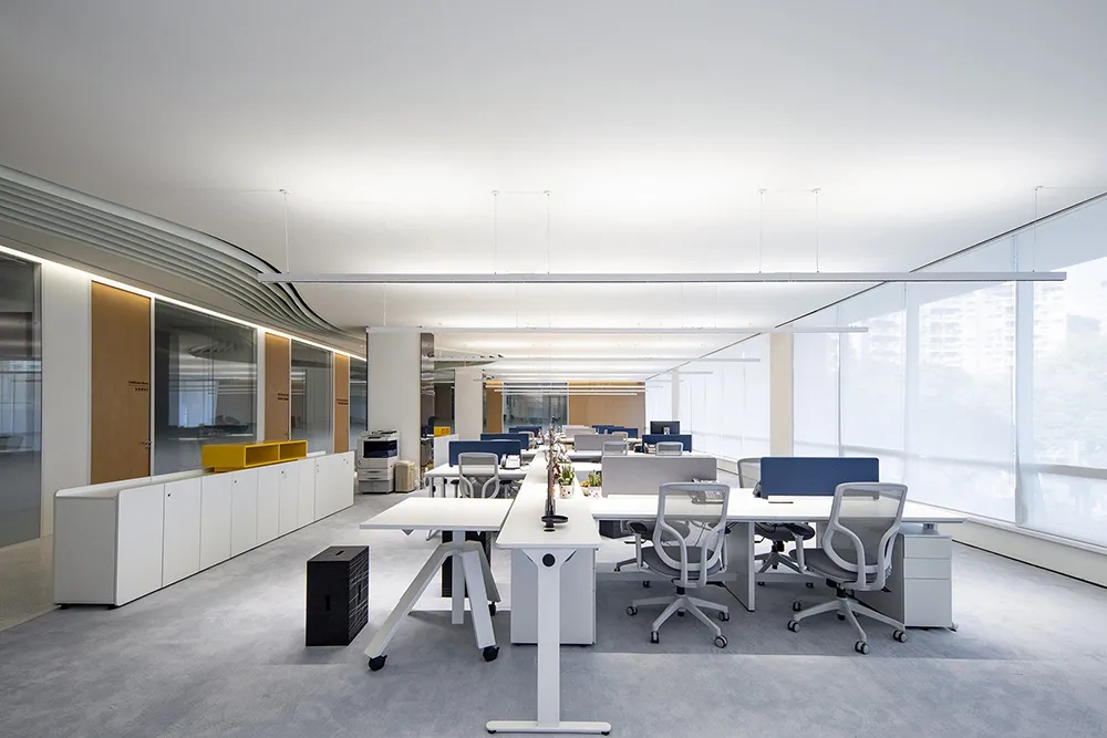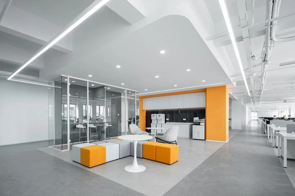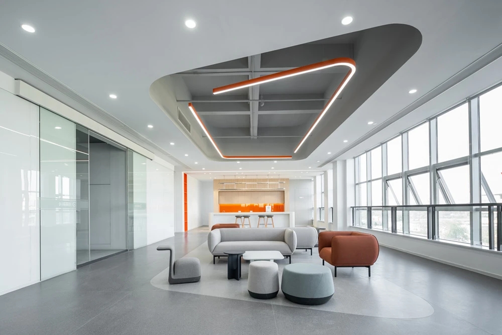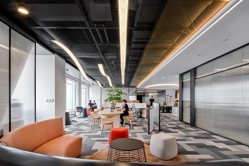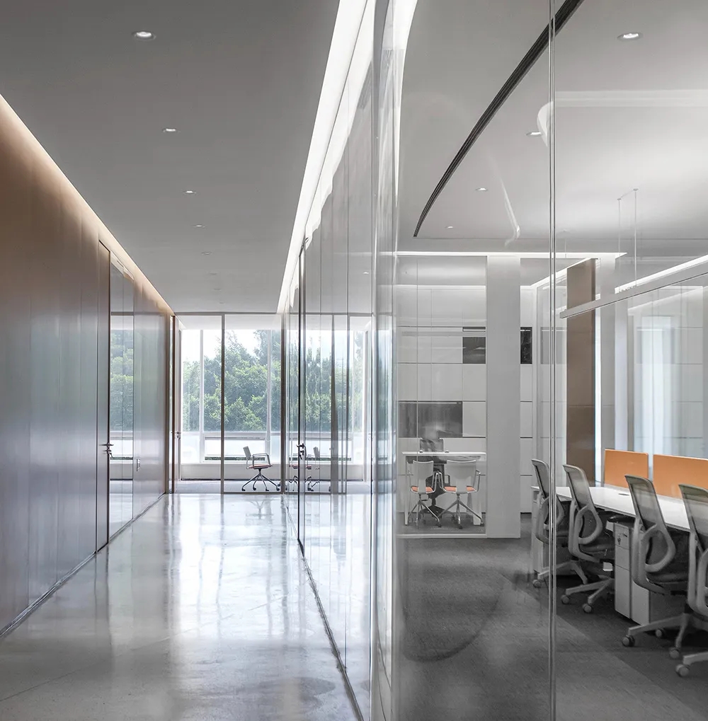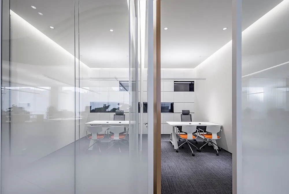 通而不透的空间立面处理上,使用通透的高隔断玻璃作为分割不同功能间与动线之间的界面,无论内外视野都得到了解放,既有利于整体办公环境的自然采光,也有效解决了不同部门之间讨论而产生的噪音问题,在保证不同部门之间的隐私之下,让人们有了更多的交流空间。