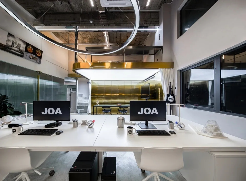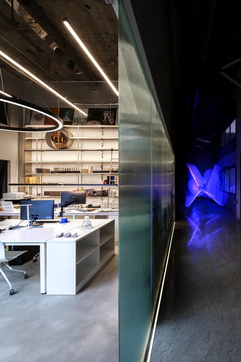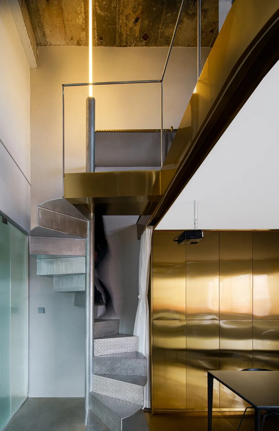 JOA开间建筑在一个具有历史记忆的场所讲述一个新故事:结构主义:新结构整合在混凝土框架中,使得夹层平台看似漂浮在墙壁之间,好似精致的平台漂浮在地面上方。在重新解读了原始结构后我们引入此夹层平台。新结构主体一部分悬挂在原有结构梁上,结合新嵌入墙体的工字钢形成一个整体。结构组合既加强了新空间的结构框架,又创造了新旧之间的微妙联系。图底关系(格式塔理论):令人印象深刻的5.5米通高空间分为两部分;模型制作室和会议室。它们同时存在。由使用时间划分,而不是仅仅是物理间隔划分。两者的对比好似在采石场的灰色岩石中所镶嵌闪烁的贵重金属。这是对19世纪初期格式塔设计理论中确立的图底关系概念的致敬。