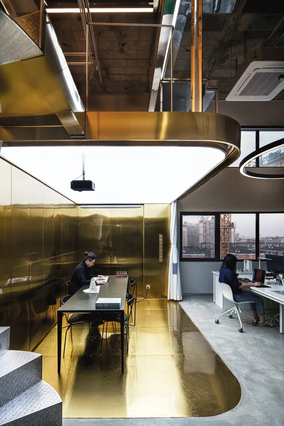 元素符号:纹理,反射性,透明度以及色调也赋予空间意义,尤其是通过并置。以镀金不锈钢饰面以及原始不锈钢材料来突出两者的对比,结合其他反射性表面,一起表达了整个办公室的材料语言。