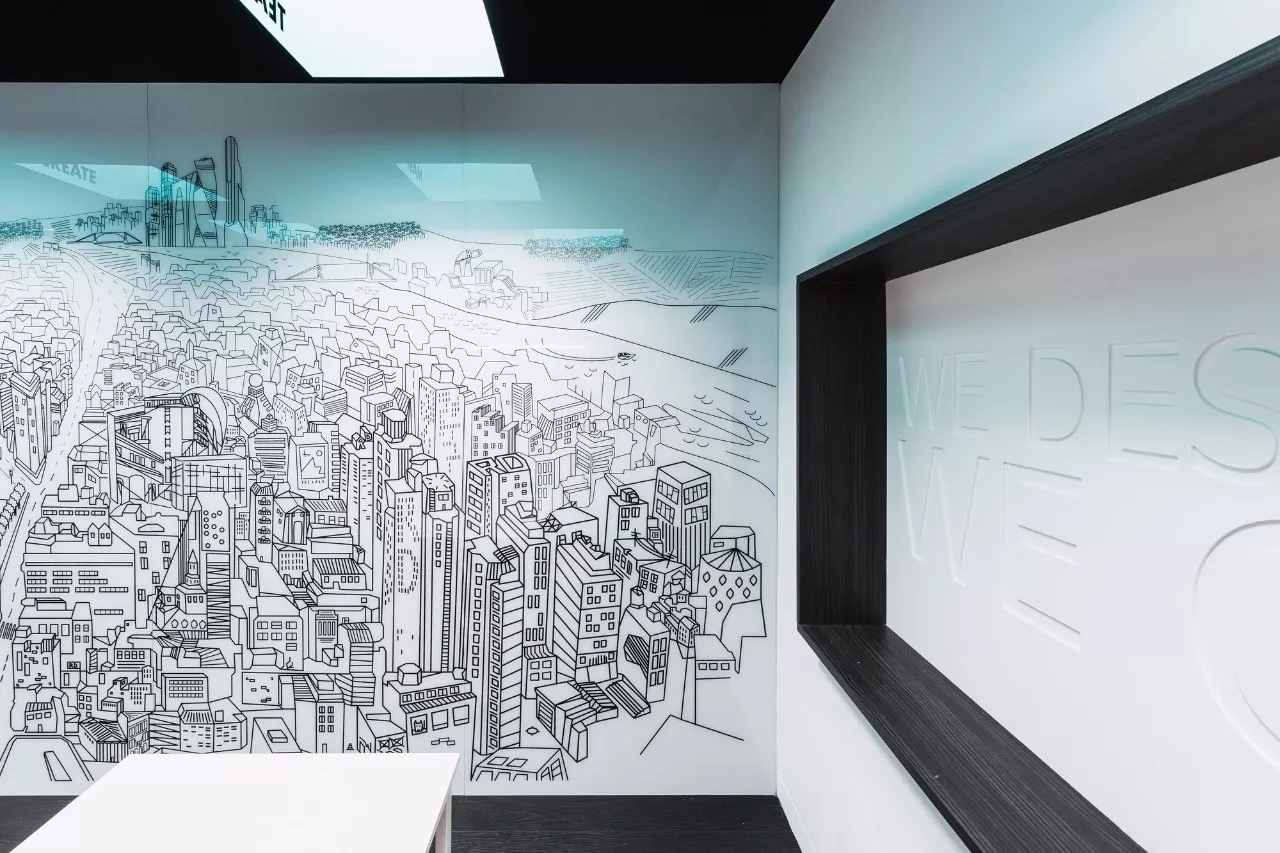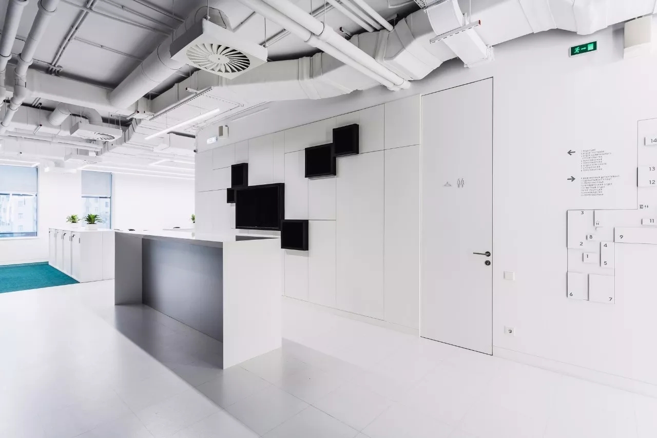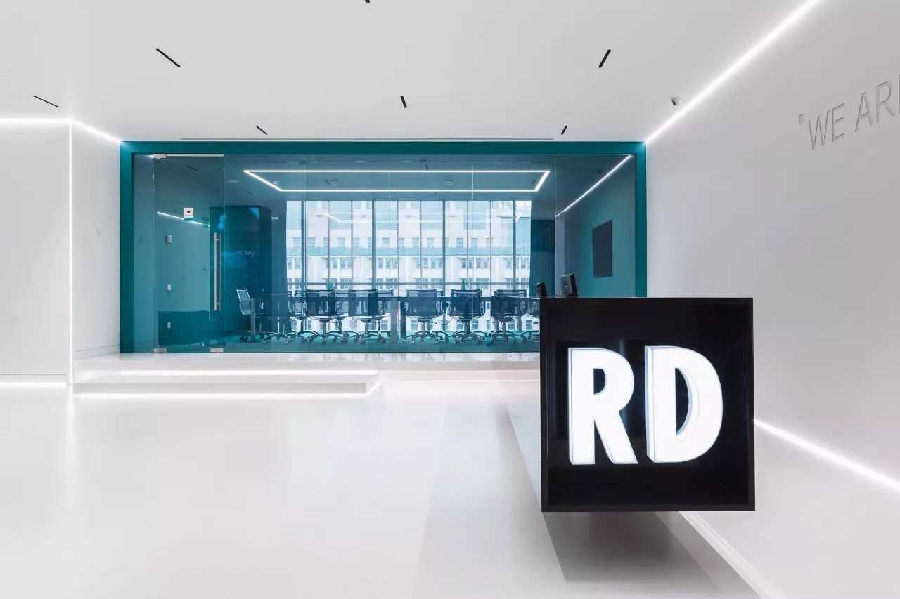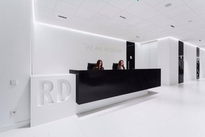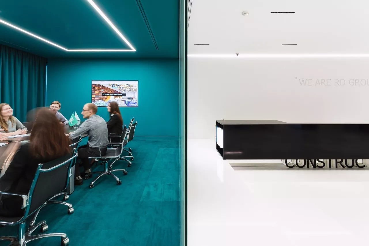 流行语言以办公室的设计方式进行了如下设计:通常用于门面装饰的CITY整理材料完全适合办公室内部:金属面板,纤维钢筋混凝土和玻璃允许访客和公司员工感觉到在办公室内的大城市心脏。此外,这些材料雄辩地展示了公司的业务,其中RD建设已实施了不少大型城市项目。未来的简洁,整洁的内部,清晰的线条和体积,以及鲜明的颜色,针对低调的配色表明,这里的未来是有意识的。在接待区内有一个媒体屏幕的列可以将公司的项目(包括将来计划的项目)显示给客户。