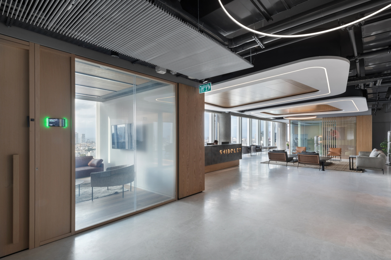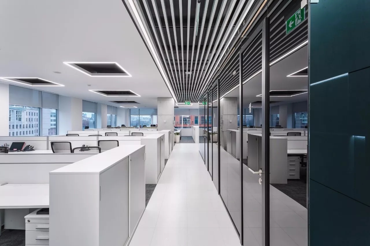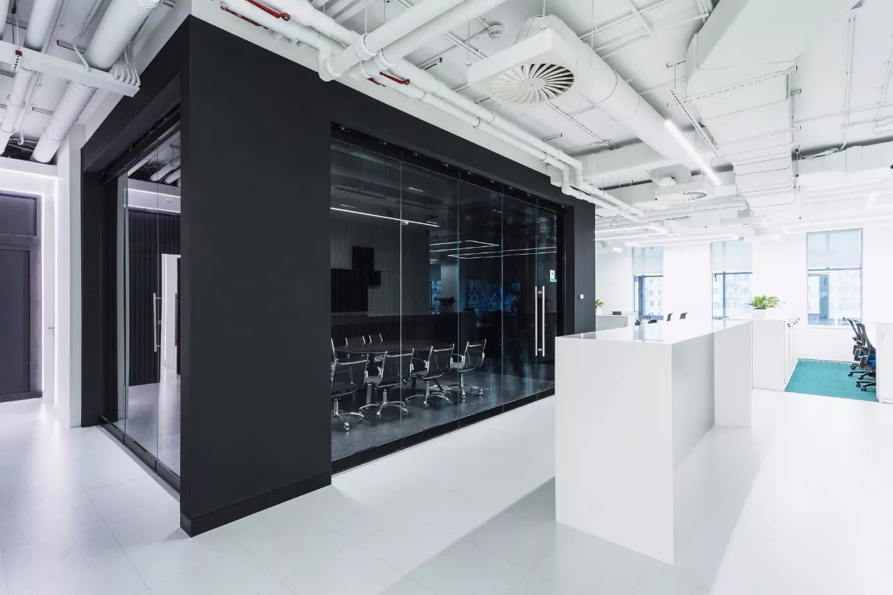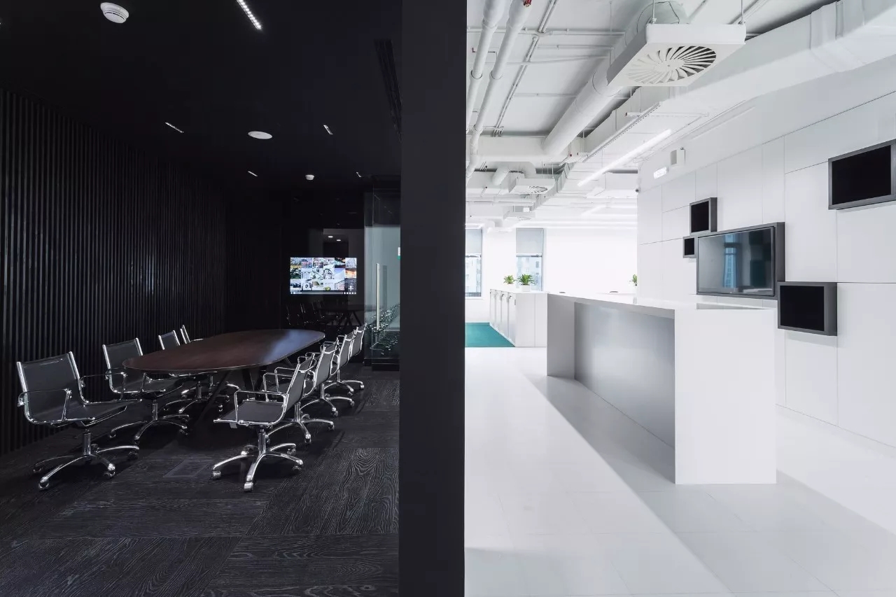 会议室之一位于接待区附近的事实也凸显了现代快节奏的公司的形象。全玻璃容量提供全面的城市景观。体积与接收区域分开,深绿绿色的玻璃墙是公司标志中的重音。创新灯具有隐蔽的光源,聚合物现浇地板,会议室的智能玻璃,根据隐私要求改变其光学性能,变得更暗或完全透明,计算机硬件和屏幕之间的无线连接 - 所有这些技术作为未来与现在之间的联系,在一个突破性的,已经被证明的方法之间,已经进入公司办公室的设计。